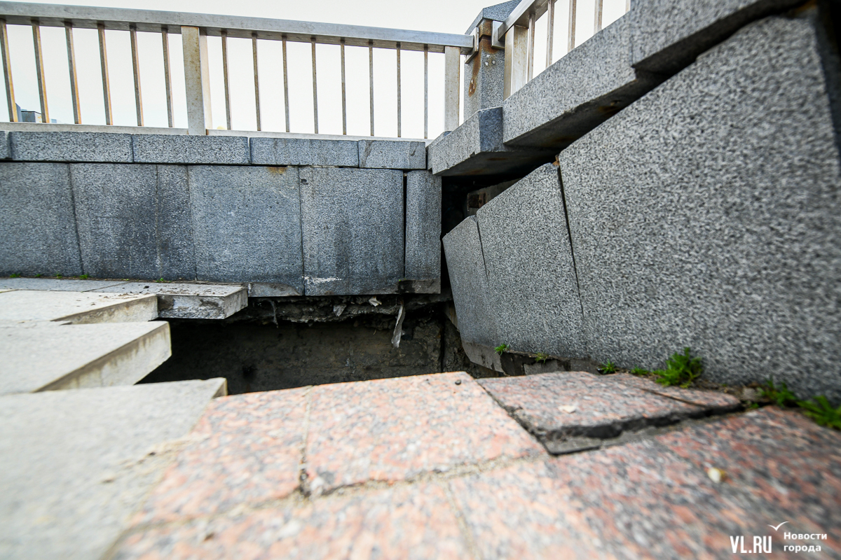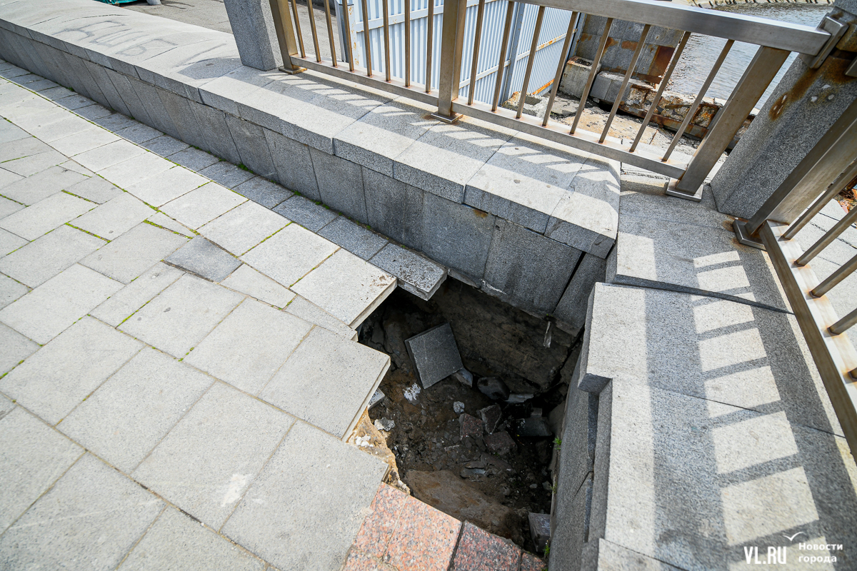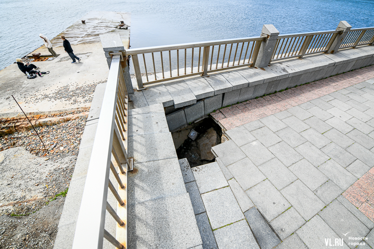 Это случилось на старой части набережной, у пирса в районе Батарейной. Яма образовалась в самом углу парапета, и она довольно большая – метр на метр. Фотограф Новостей VL.ru заглянул в неё – похоже, что под тротуарной плиткой и небольшим слоем грунта была пустота.