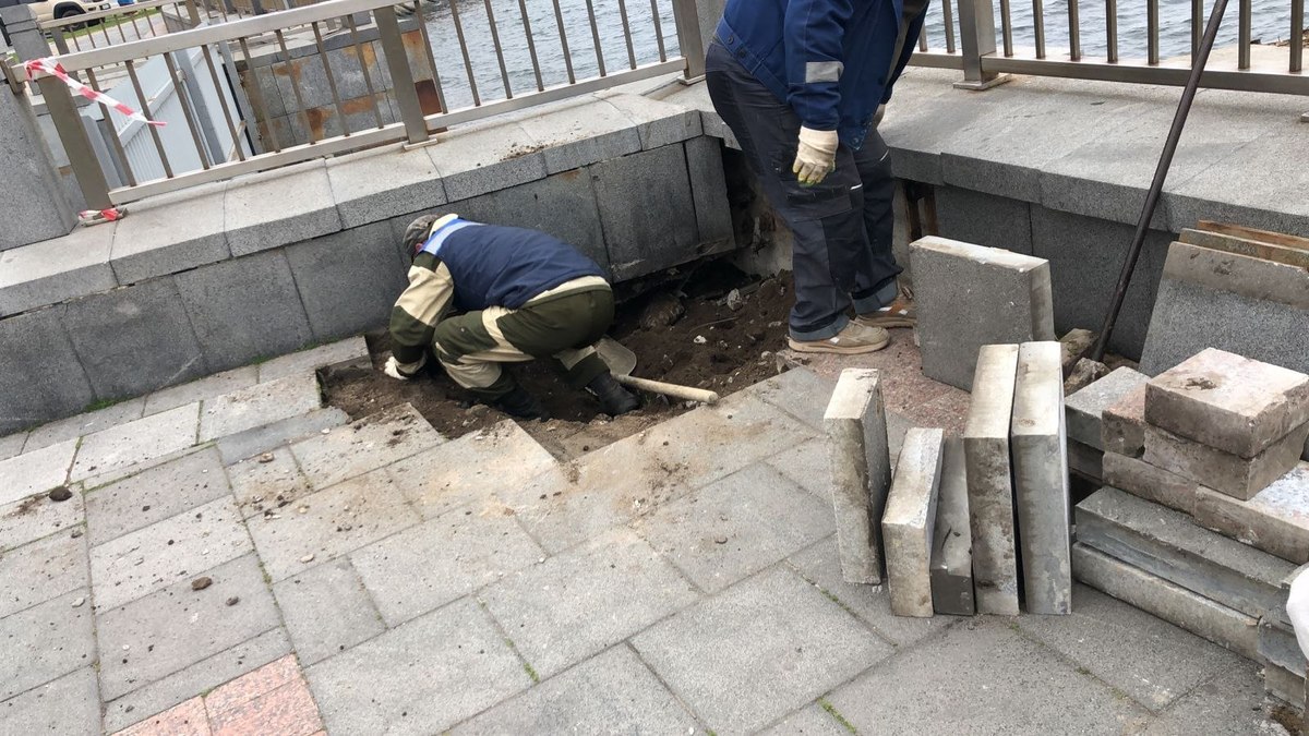 Обновление 13:00: Портал на Батарейной набережной, в которую вчера затянуло мужчину, сегодня уже закрыли. Специалисты утрамбовали землю, провели бетонирование. После этого на место была уложена плитка.