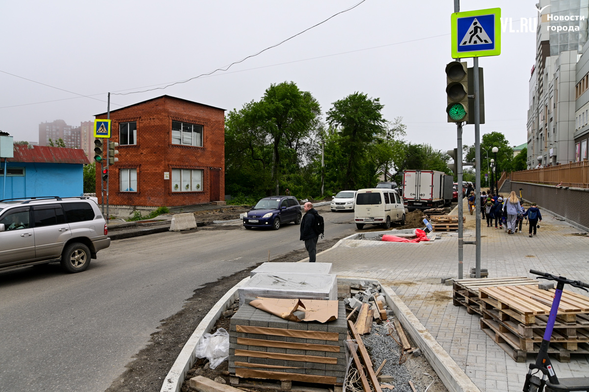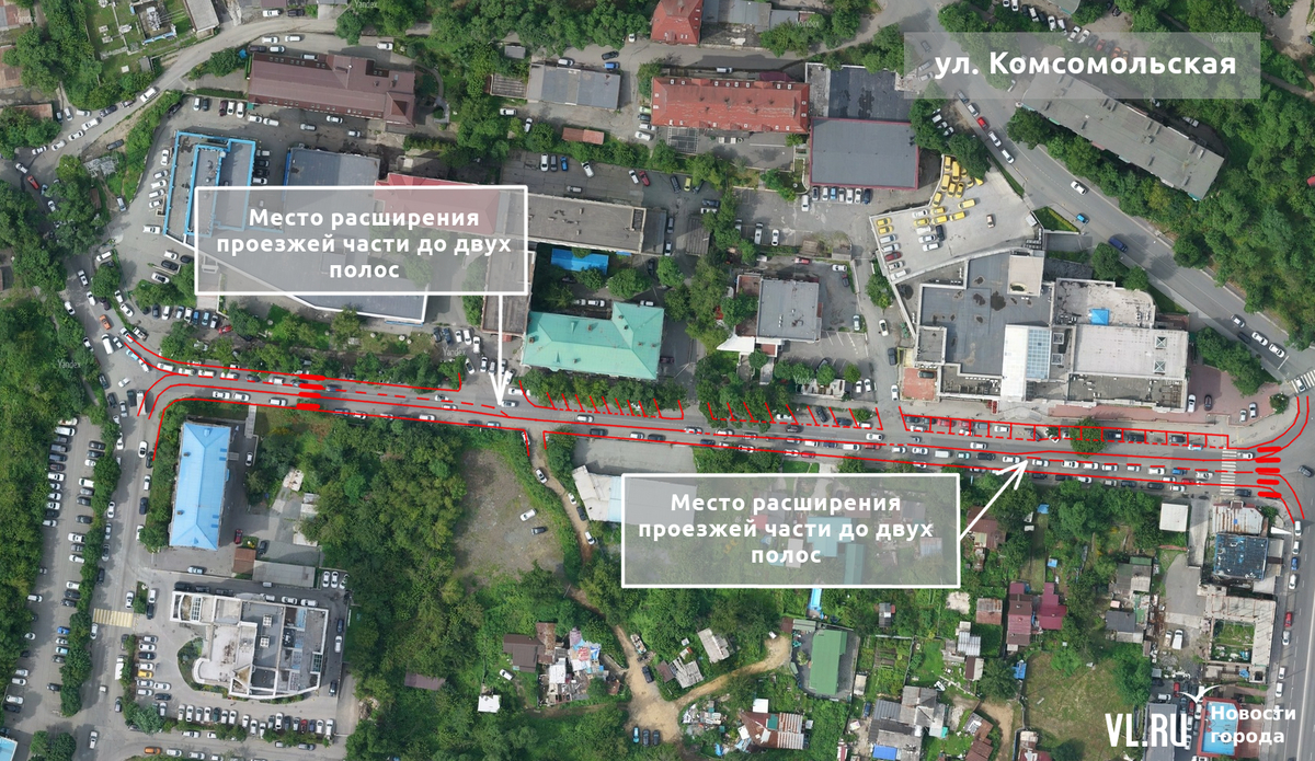 На въезде на улицу Комсомольскую со стороны Океанского проспекта действительно расширяют тротуар, а проезд вдоль ТЦ «Игнат» в сторону Иманской сужают до одной полосы плюс остаётся парковочная зона, которая начинается не сразу после перекрёстка, а только после пешеходного перехода и будет иметь вид кармана. Пешеходный переход переносят ближе к перекрёстку с Океанским проспектом.