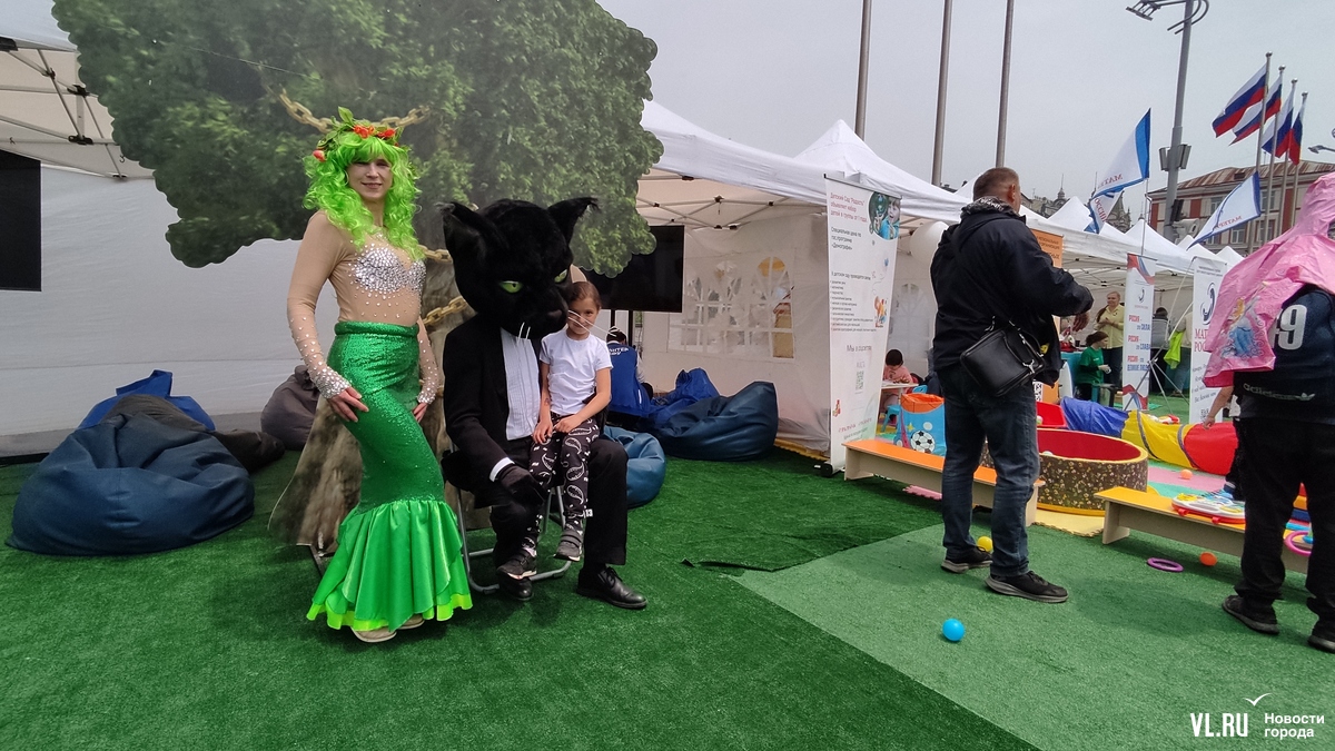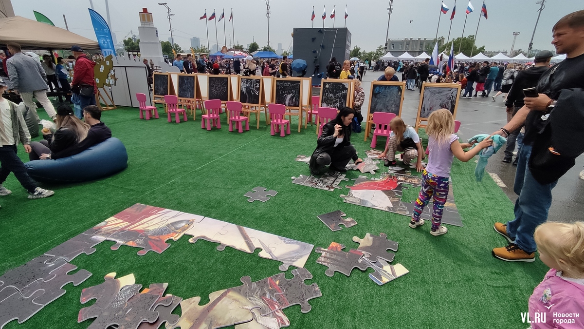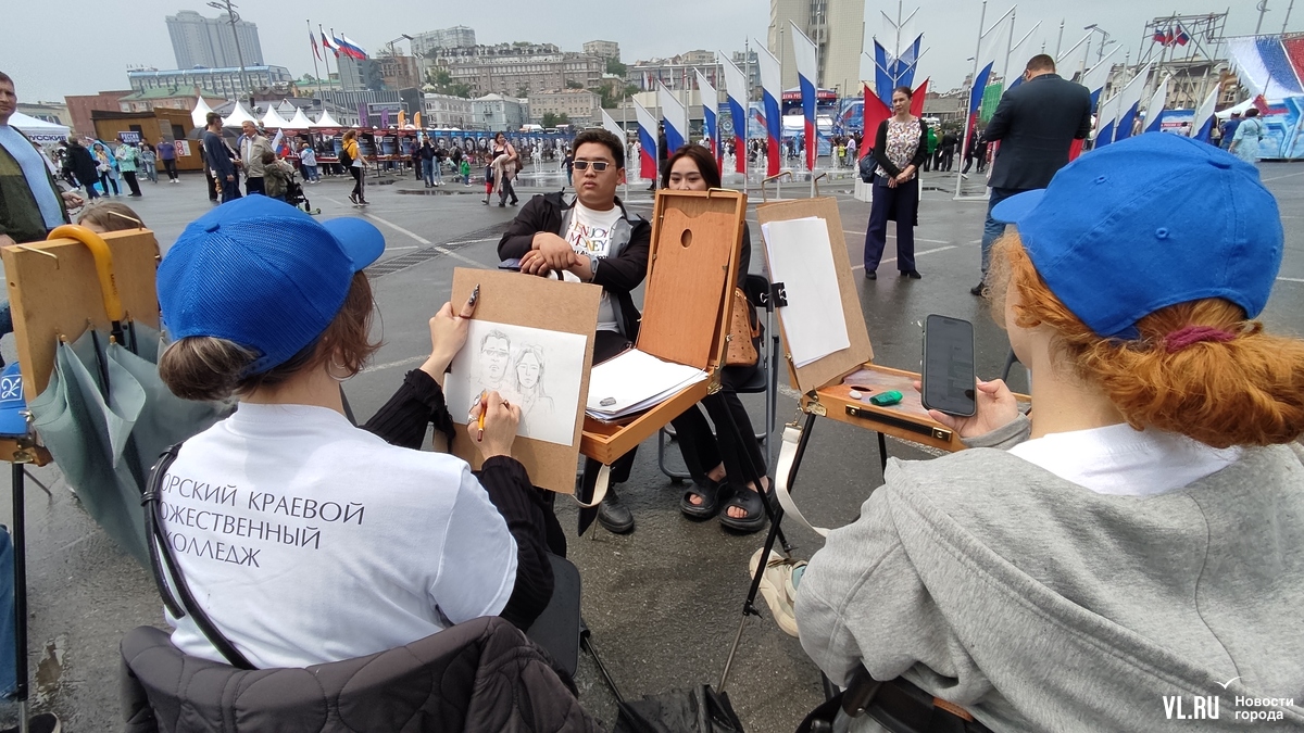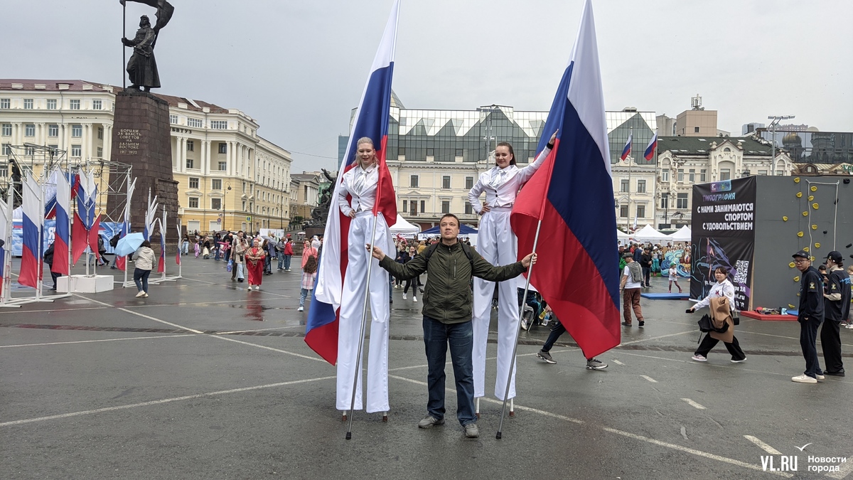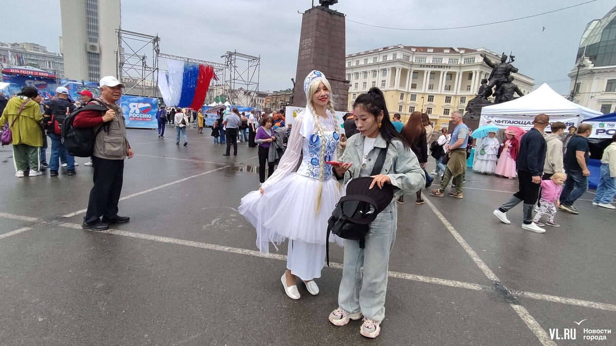 На центральной площади Владивостока проходит празднование Дня России. На сцене выступают творческие коллективы. Гостей поздравили губернатор и глава города и вручили первые паспорта группе активных школьников.