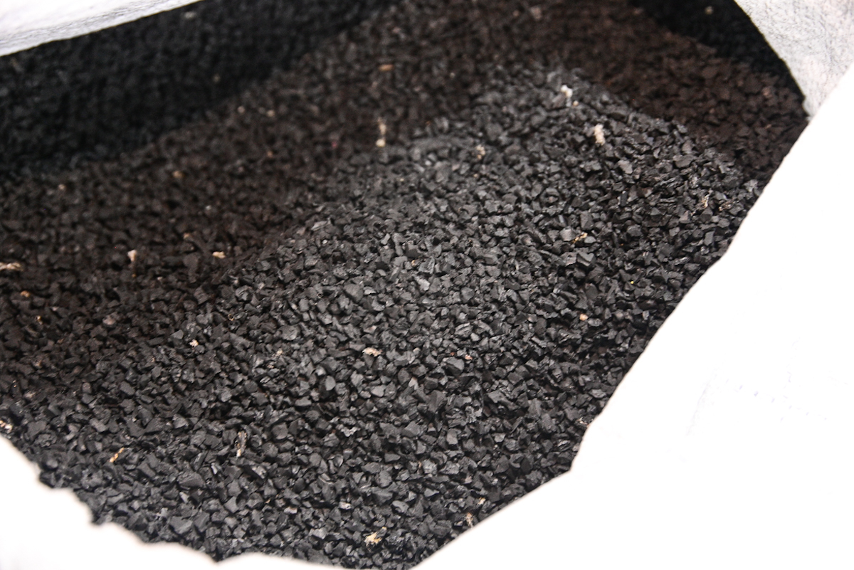 Сперва шина рубится на довольно крупные куски, затем, путешествуя по лентам и машинам, разрезается на всё меньшие и меньшие части. На четвёртой-пятой стадиях происходит отделение металлического корда с помощью магнитных сепараторов, а также кордовой нити с помощью различных улавливателей капроновых нитей. Так резиновая крошка полностью очищается от посторонних примесей. В конце крошка попадает в классификатор – как раз то самое ноу-хау. Там уже машины рубят её на четыре разные фракции. Самая крупная идёт для спортивных площадок и дорожек, средняя – для нижних слоёв покрытия детских площадок, а мелкая – для футбольных полей с искусственным покрытием.