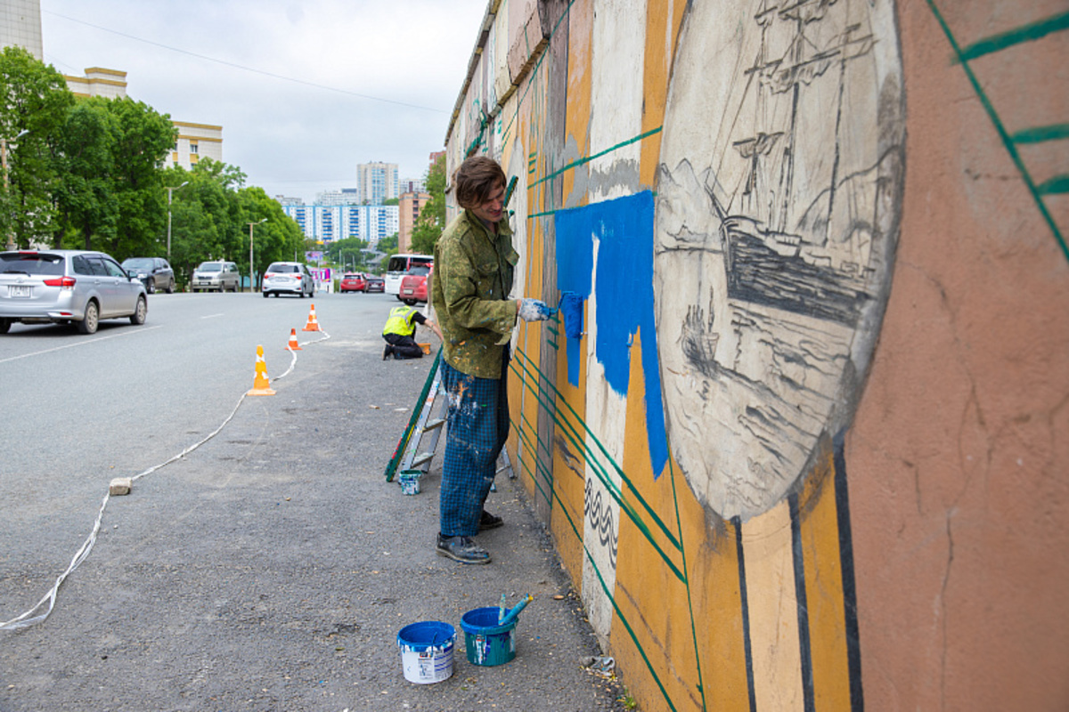 Среди изображений будут корабли, моряки, рыбаки, велосипедисты, скейтеры, сапсёрферы, рыбы и сопки. Завершить художественное оформление при благоприятных погодных условиях планируется до 23 июня.