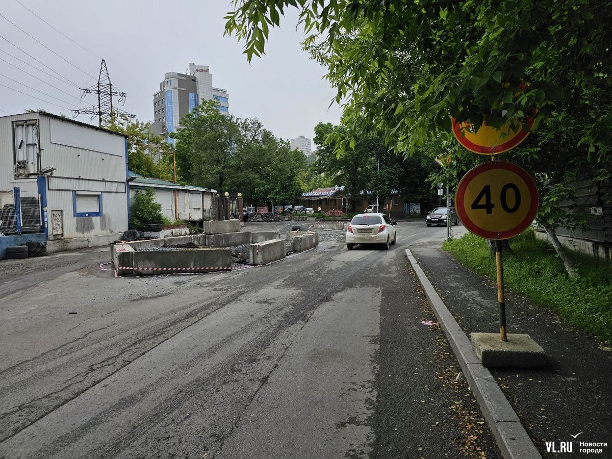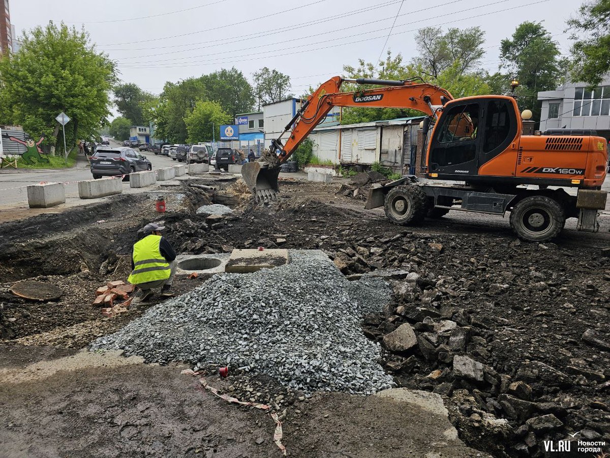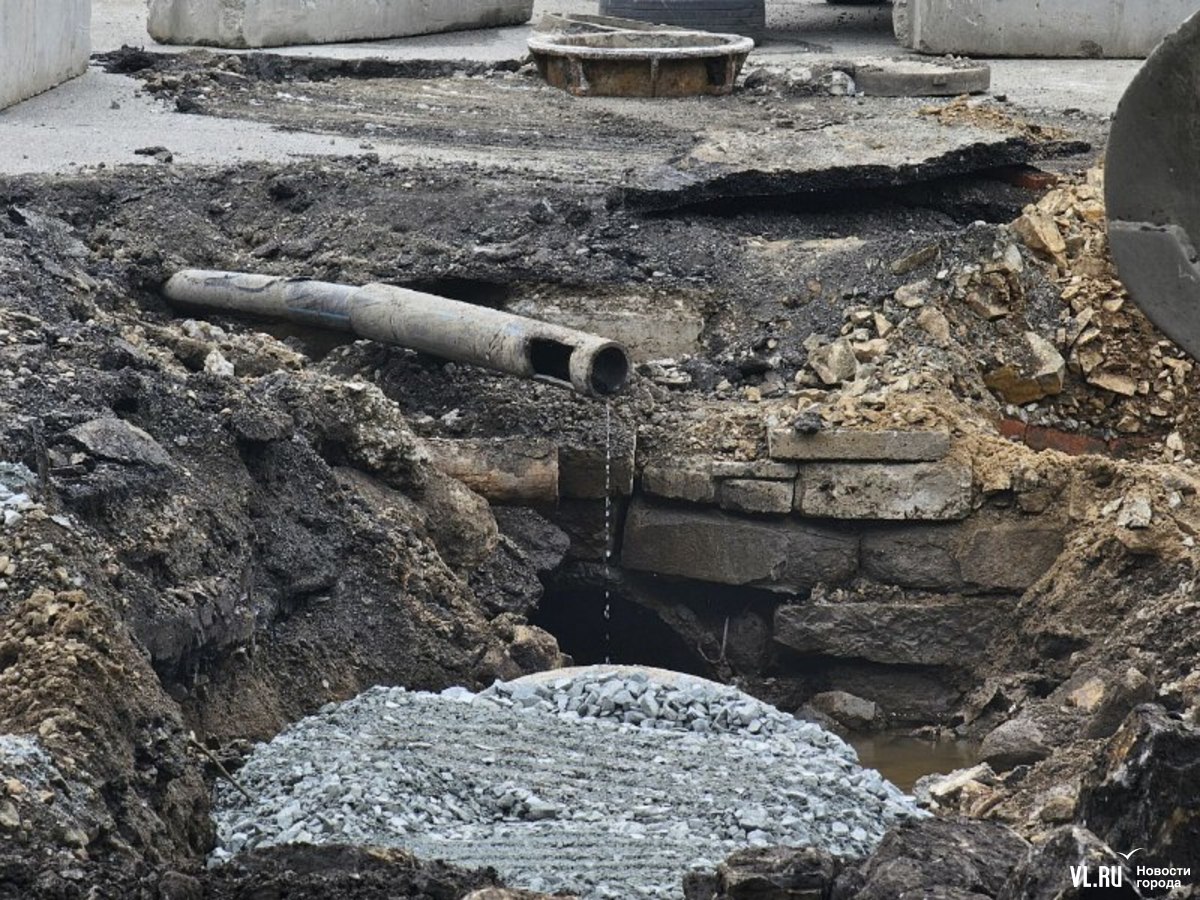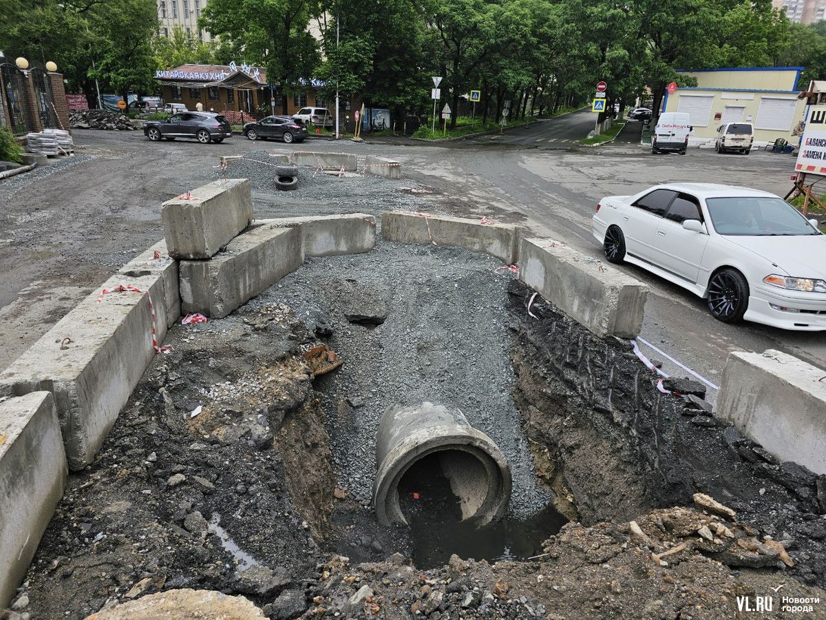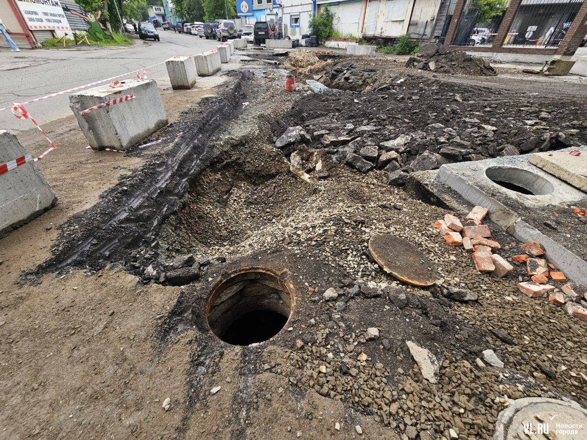 Завершить работы планировалось до конца недели, и поздно вечером в пятницу, 14 июня, фотокорреспондент Новостей VL.ru заметил, что дорога снова открыта. Раскопанная труба сейчас огорожена бетонными блоками и сигнальными лентами, от неё пахнет канализацией. Недалеко от неё под толстым слоем старого асфальта и щебня оказался коллектор.