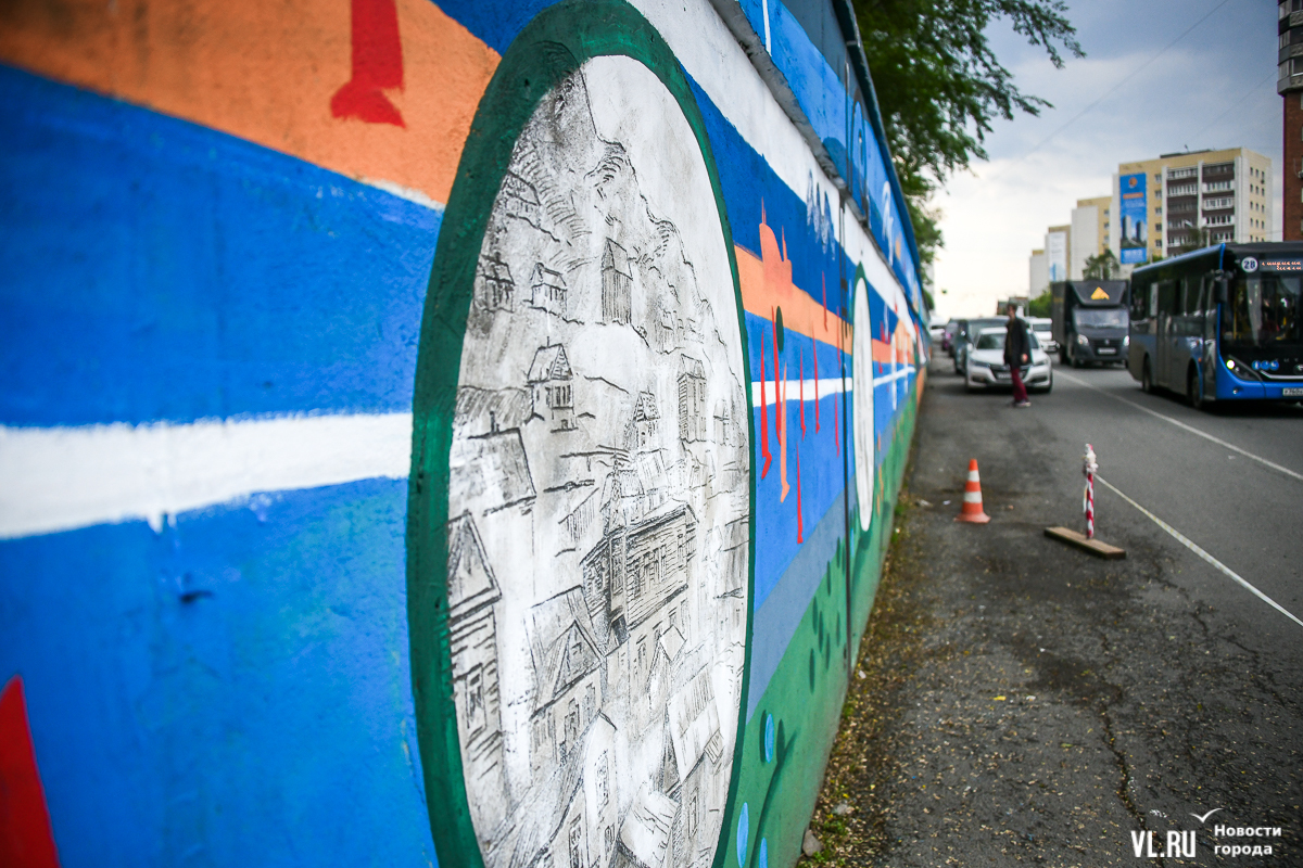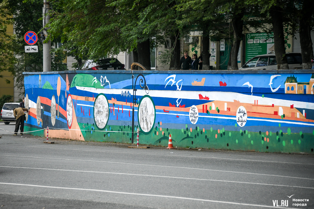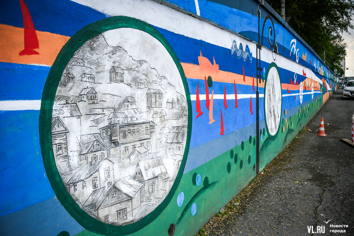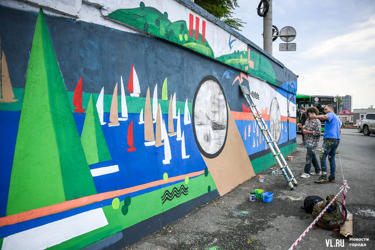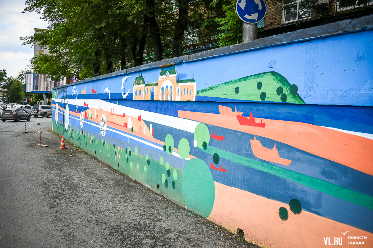 Во Владивостоке заканчивают обновление росписи подпорной стены в районе кольца Инструментального завода на Партизанском проспекте. Художники арт-группы «33+1» по заказу расположенной здесь гостиницы Novotel восстановили барельефы на историческую тематику, сделанные художественным объединением «Квадролампа» 8 лет назад, и дополнили их образами современного города – домами, парусниками, сопками, чайками.