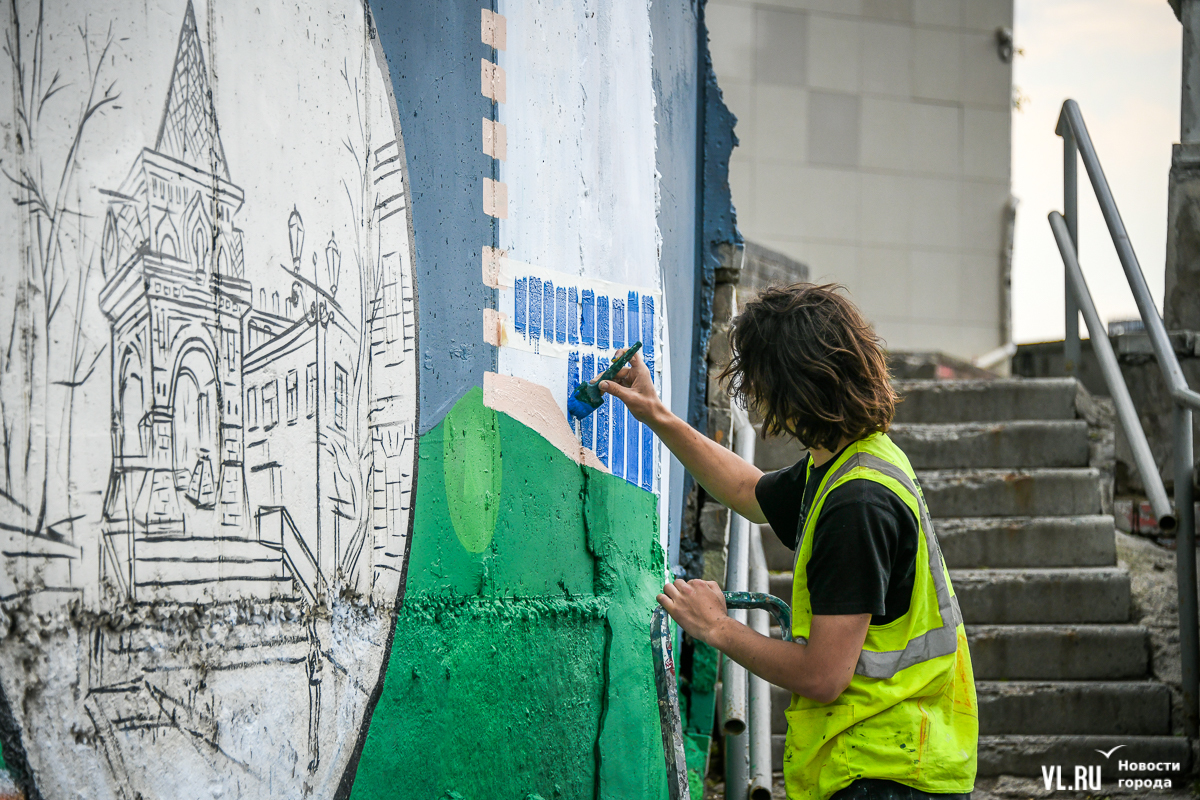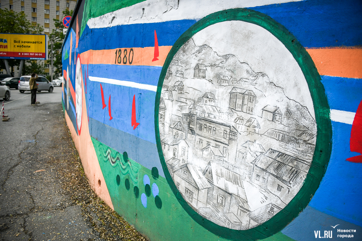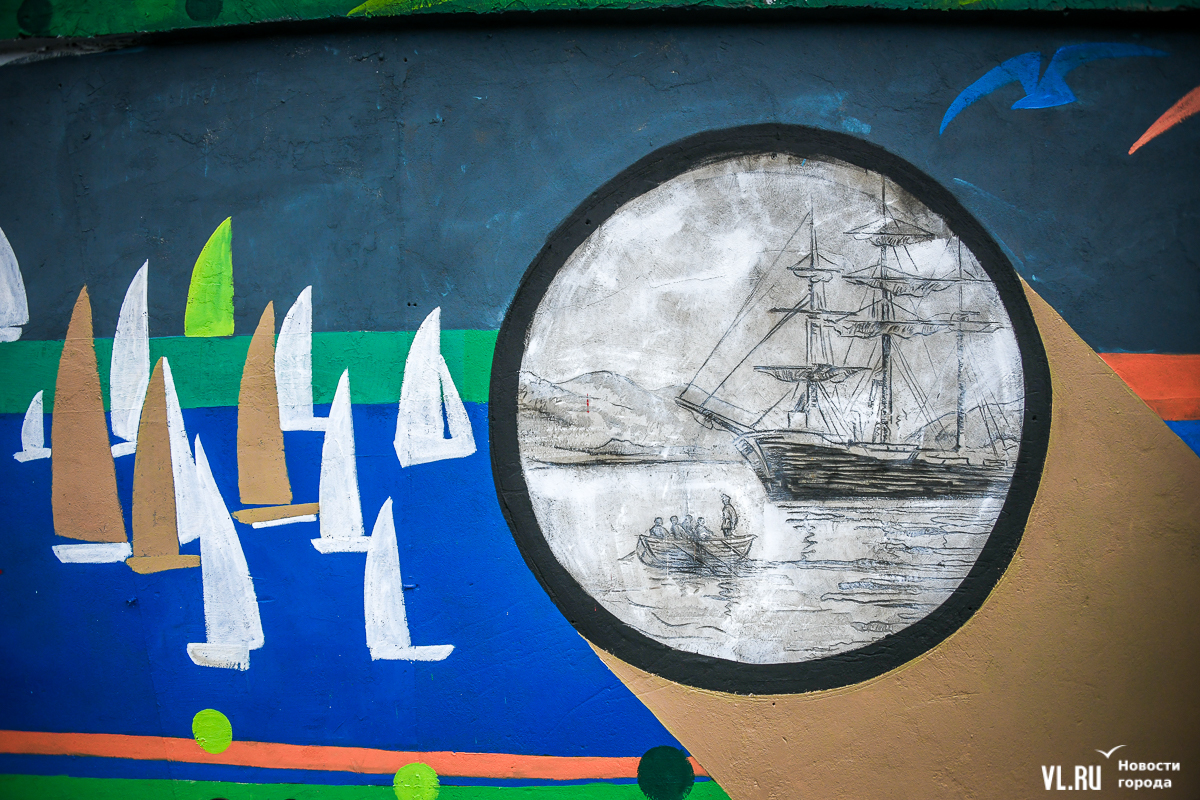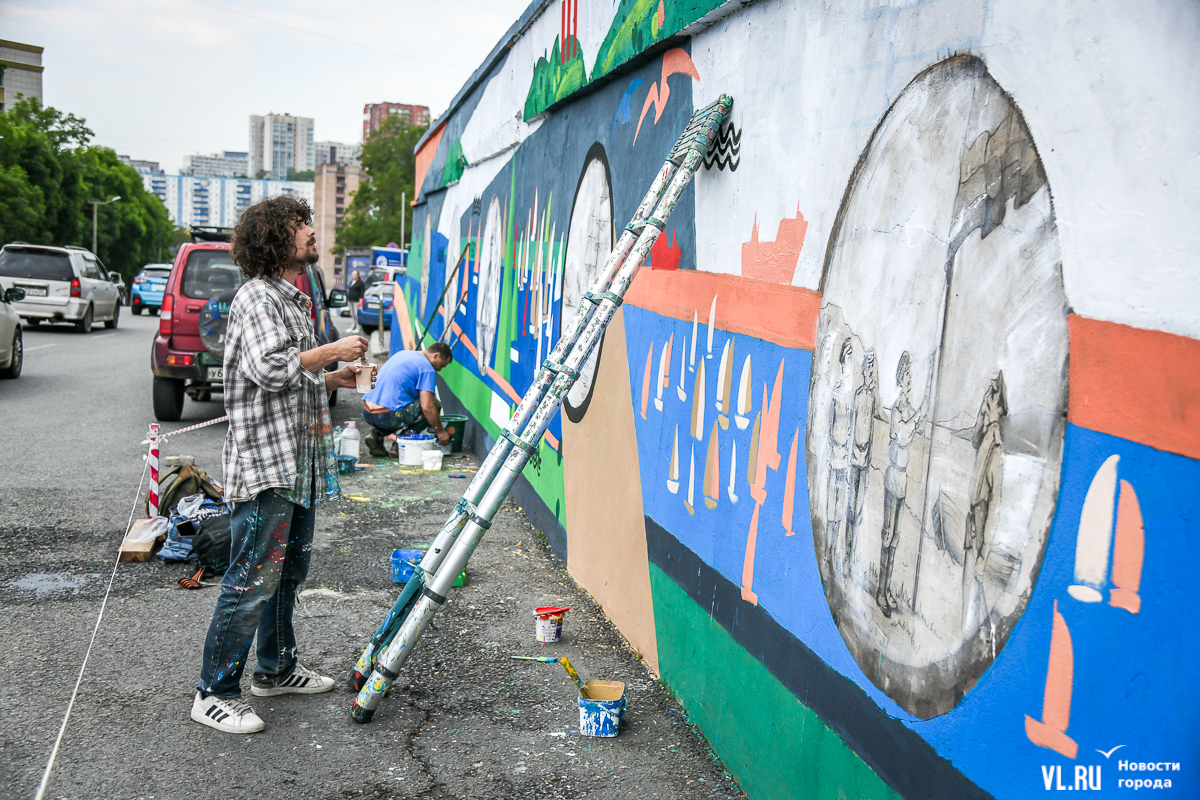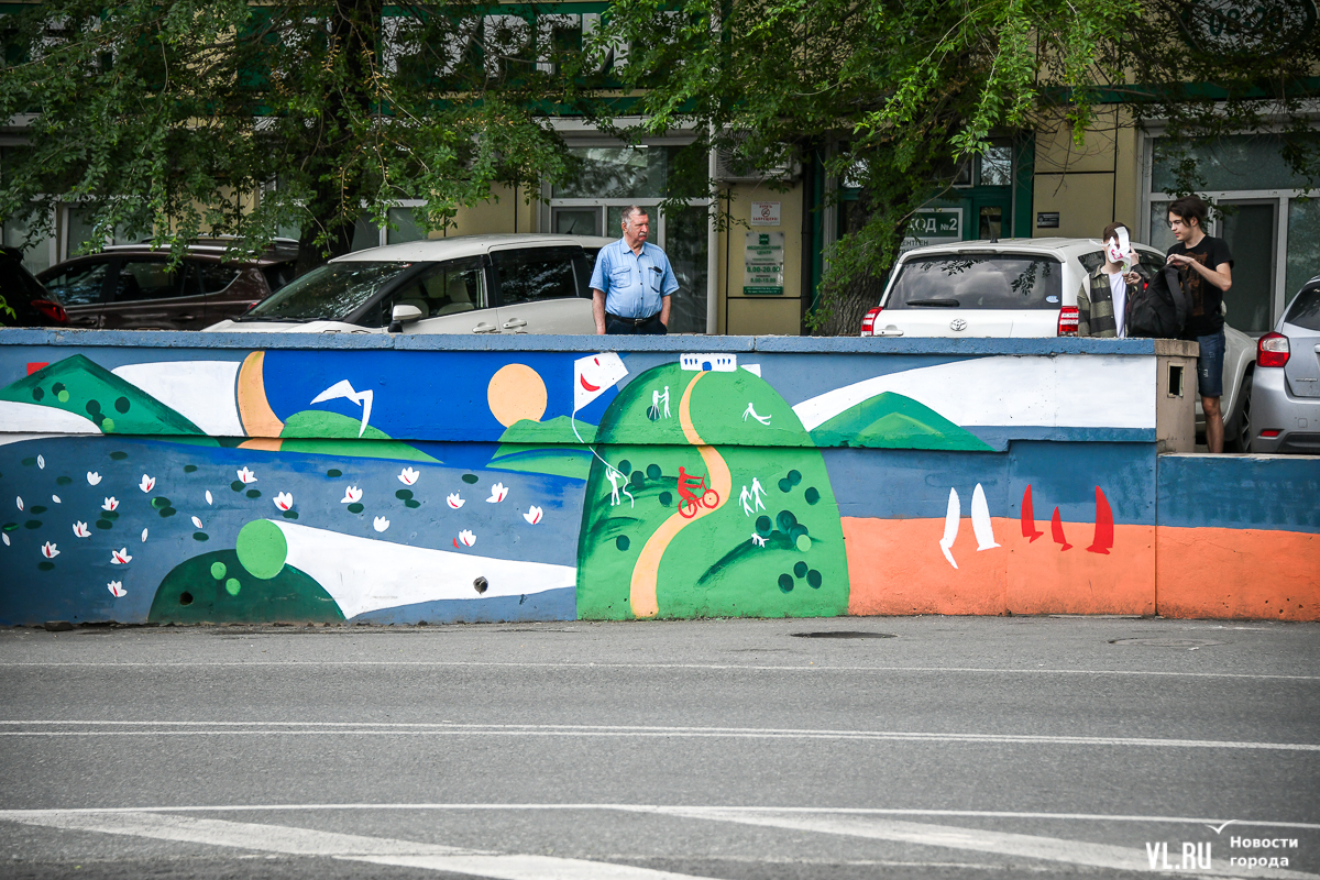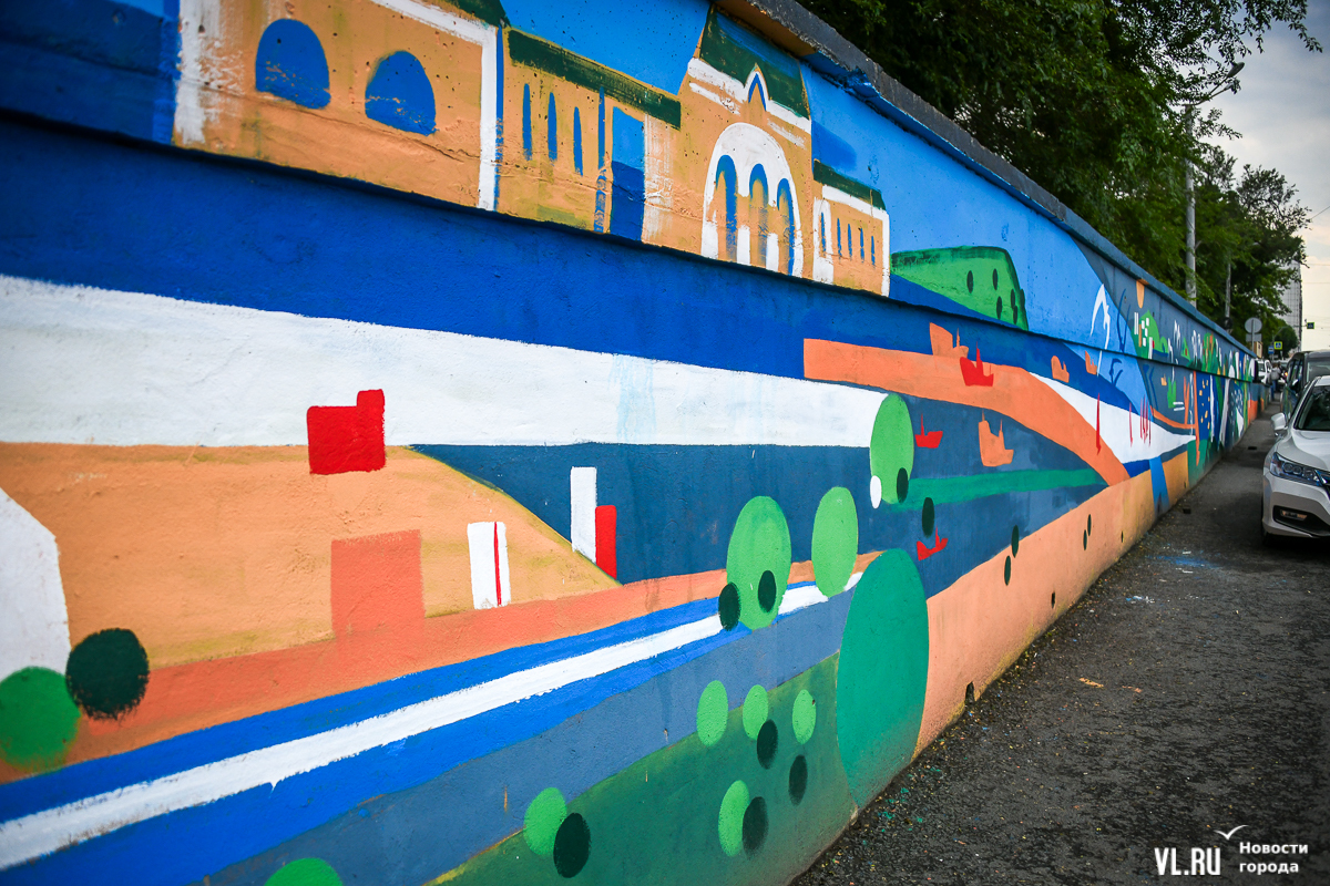 Во Владивостоке заканчивают обновление росписи подпорной стены в районе кольца Инструментального завода на Партизанском проспекте. Художники арт-группы «33+1» по заказу расположенной здесь гостиницы Novotel восстановили барельефы на историческую тематику, сделанные художественным объединением «Квадролампа» 8 лет назад, и дополнили их образами современного города – домами, парусниками, сопками, чайками.