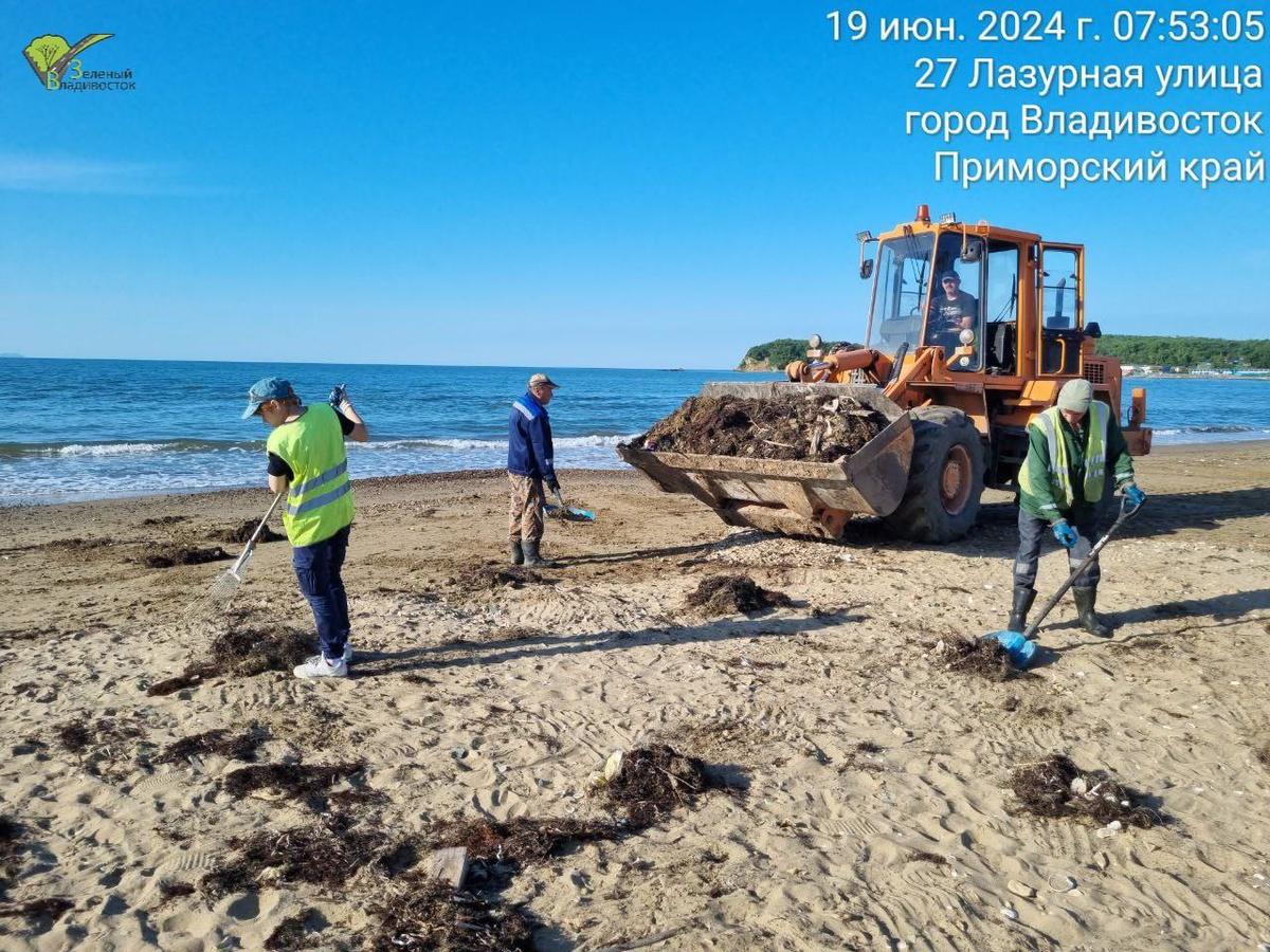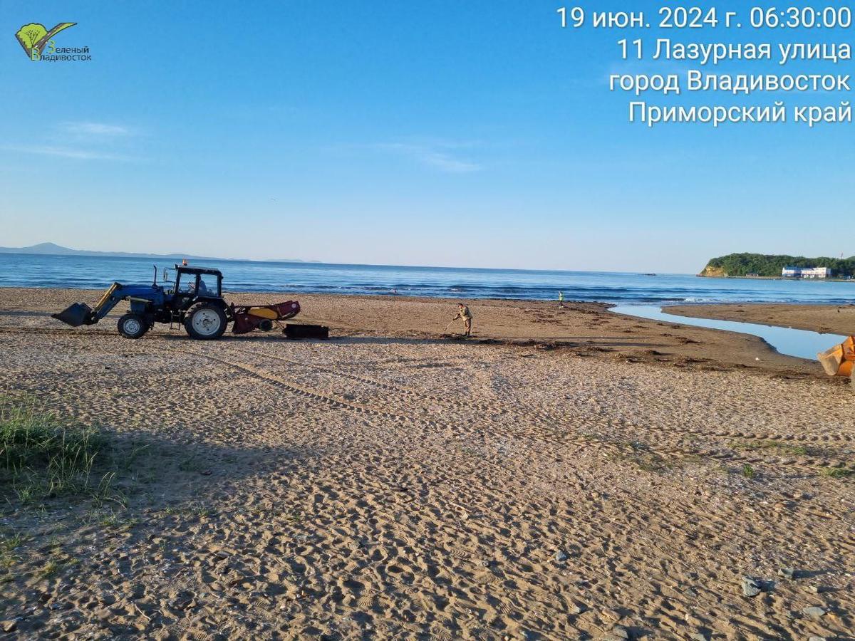 На этой неделе «ЗеленВлад» проводит повторную очистку от мусора береговой полосы, сообщает учреждение. С помощью техники рабочие просеивают песок, очищая его от мусора, камней и ракушек, а вручную убирают крупный мусор и водоросли на всём протяжении пляжа.