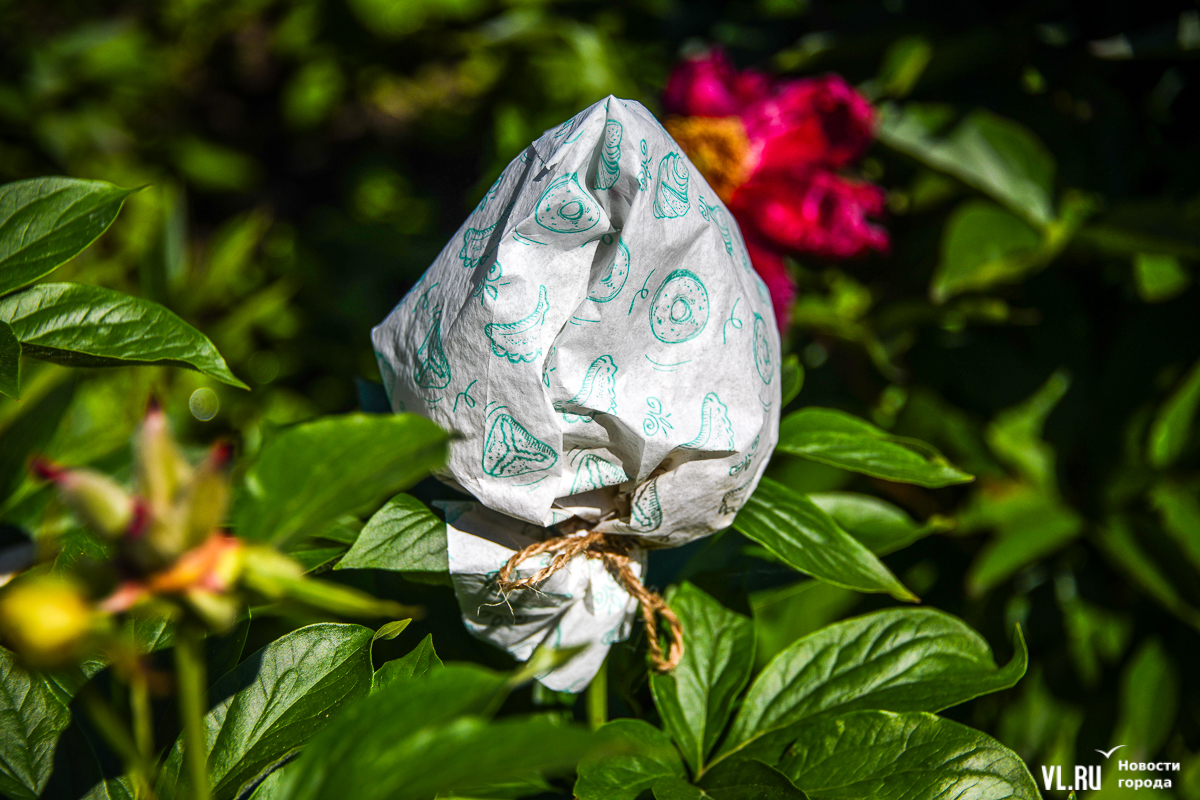 Некоторые бутоны закрыты специальными чехлами – как объяснил Алексей, эти цветы участвуют в направленном опылении, когда нужно «скрестить» определённые сорта. Также при селекции практикуется и свободное опыление, когда пионы разных сортов и видов общаются друг с другом безо всяких ограничений. Семена собирают в конце сезона и потом смотрят, что вышло.