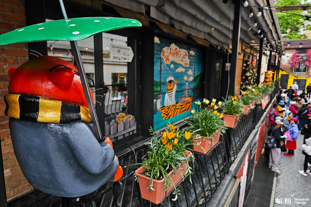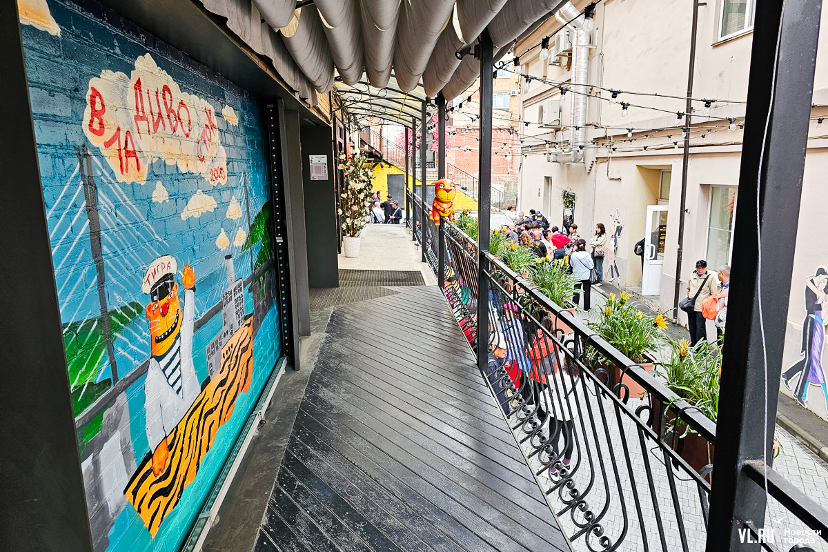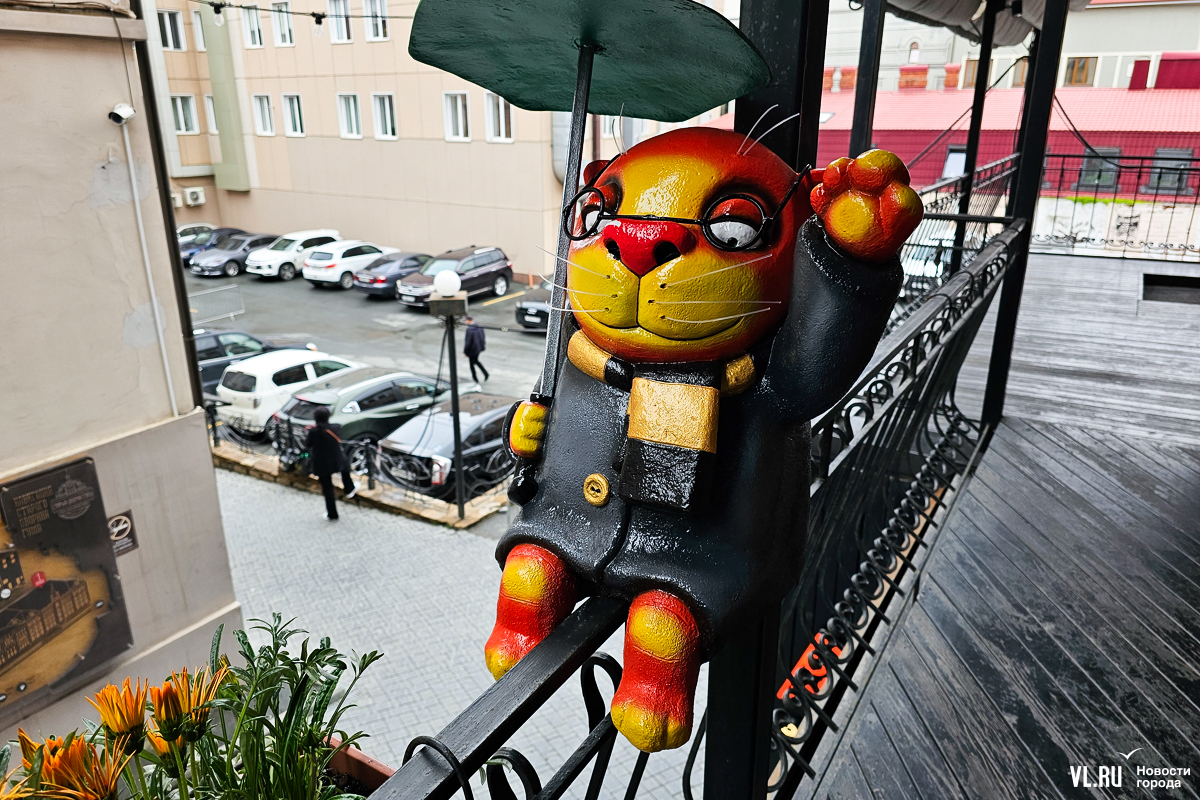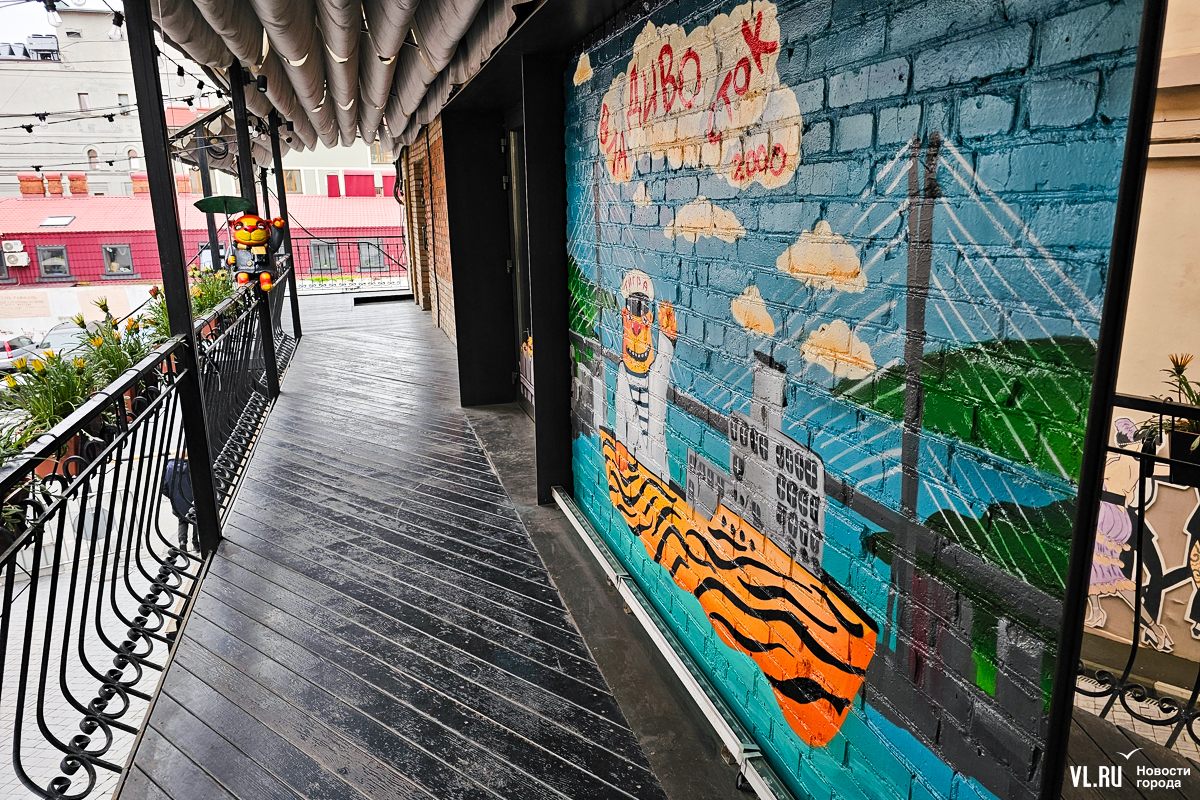 Художник Вася Ложкин, автор знаменитых рыжих котов, написал картину, посвящённую нашему городу. На ней – Золотой мост, кот-капитан и надпись «ВлаДИВОсток 2000». Мурал на основе этого сюжета, как и оригинал картины, можно увидеть в Старом дворике ГУМа.