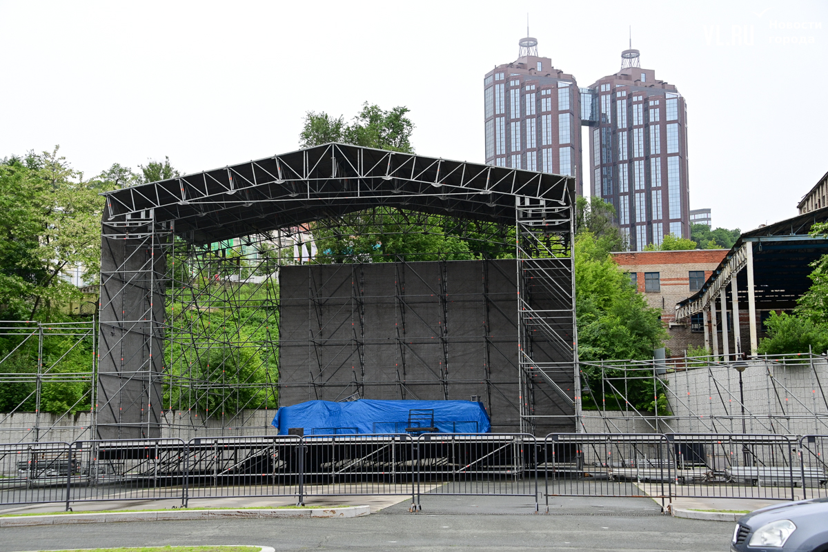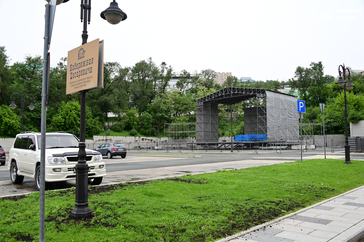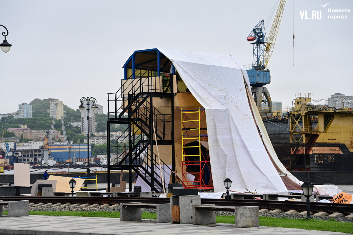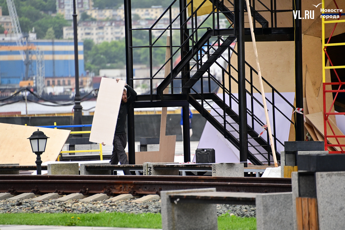 Начали устанавливать свои площадки партнёры мероприятия – строятся Сбербанк, ВКонтакте со своими стендами (пока это просто металлические конструкции рядом с детской площадкой), Туристический информационный центр (они откроют фуд-корт и шатёр с мастер-классами, который пока выглядит как арка, обтянутая белым тентом) – в этой локации 28, 29, 30 июня и 6 июля пройдут мастер-классы в рамках фестиваля гребешка, а с 1 по 5 июля будет работать лекторий в рамках Дня Приморья. Рядом с парковкой на входе устанавливают деревянные конструкции – здесь будет работать зона «уличная классика» для экстремальных видов спорта (скейтбординга, трикинга, упражнений на турниках).