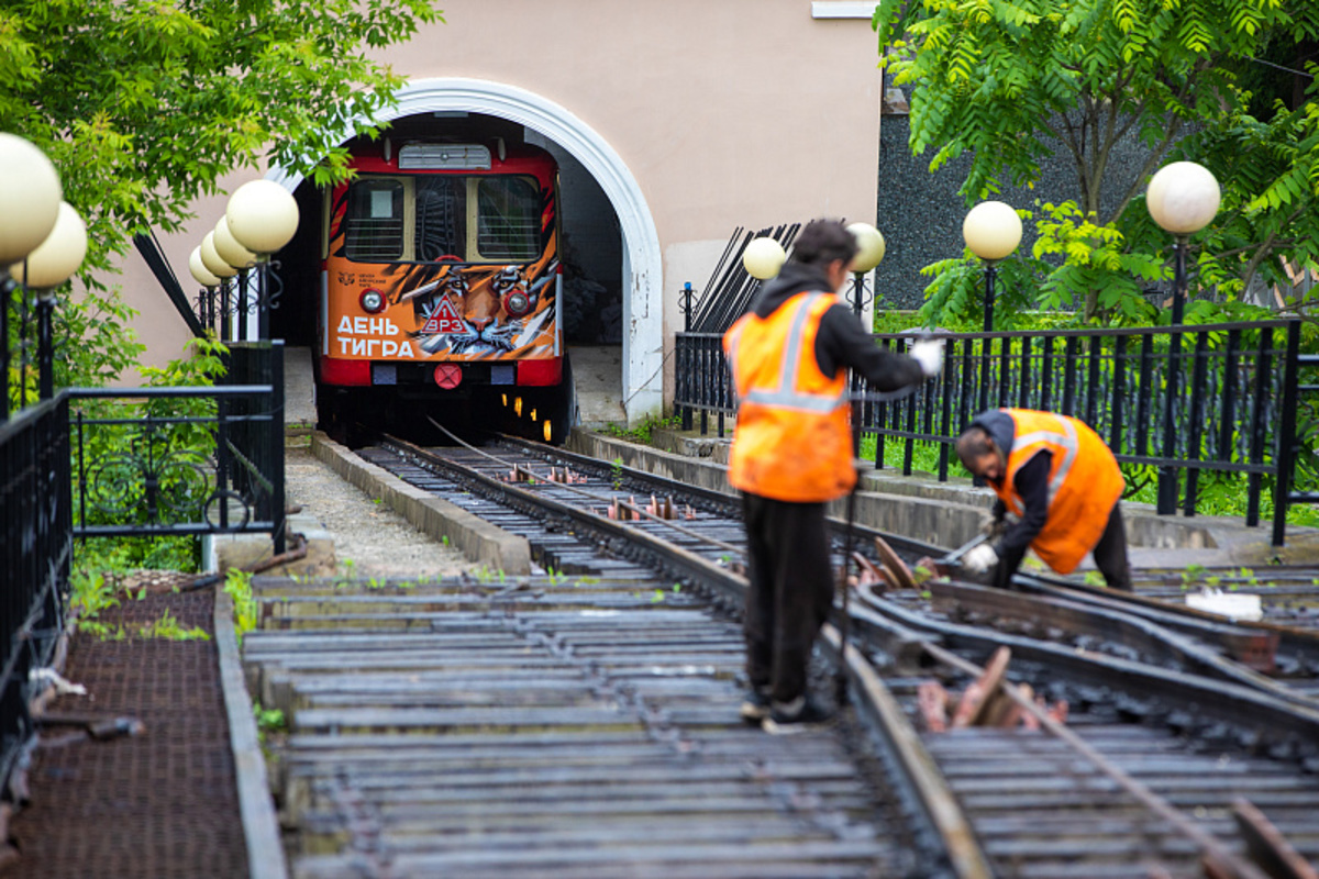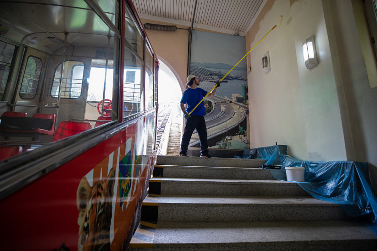Уже около месяца на станциях владивостокского фуникулёра идёт ремонт. Здесь почти завершена отделка посадочных зон, на рельсовых путях заменены брус, настил, элементы скреплений, отрегулирована ширина колеи и возвышение рельсов.