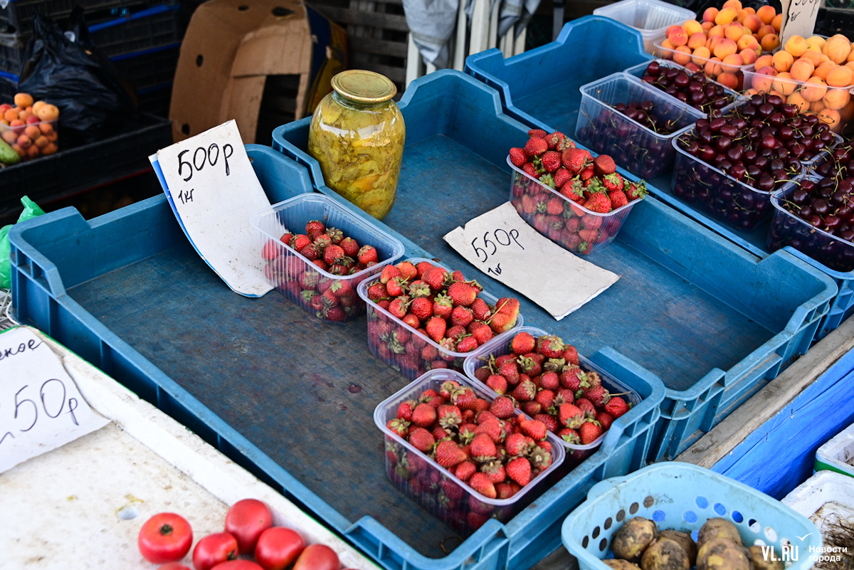 Больше всего на рынке ягоды из Арсеньева. Продавец Лариса говорит – и клубника, и жимолость там уже отходят. В Арсеньеве у неё дача, плюс мама там живёт и тоже выращивает ягоду. Ещё и соседи отдают на продажу. Клубника – 550 рублей за килограмм, жимолость 1500: