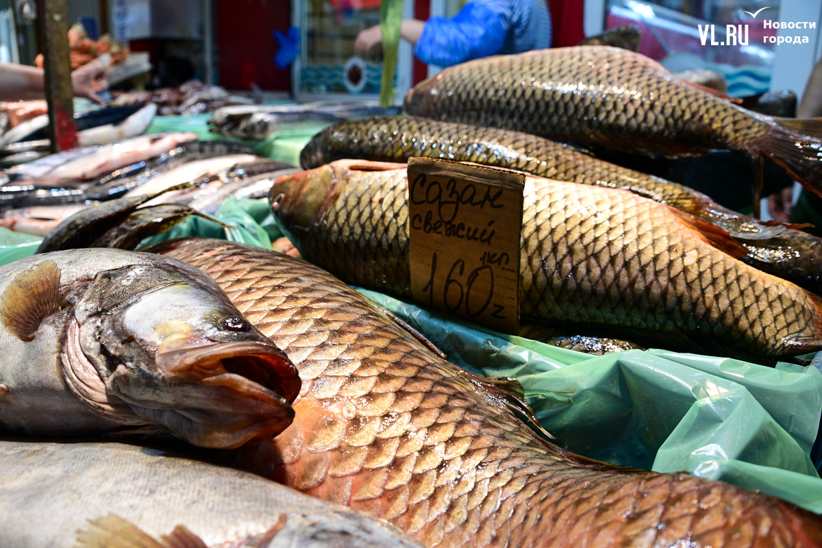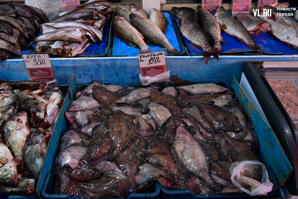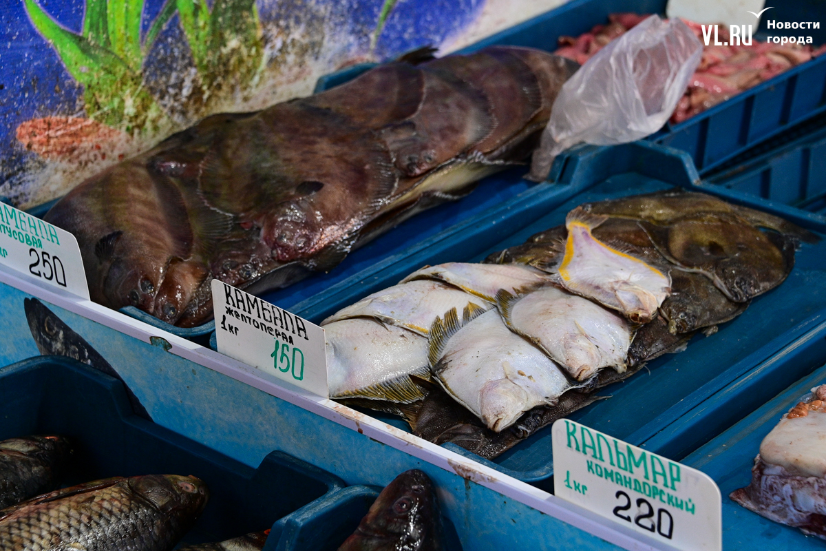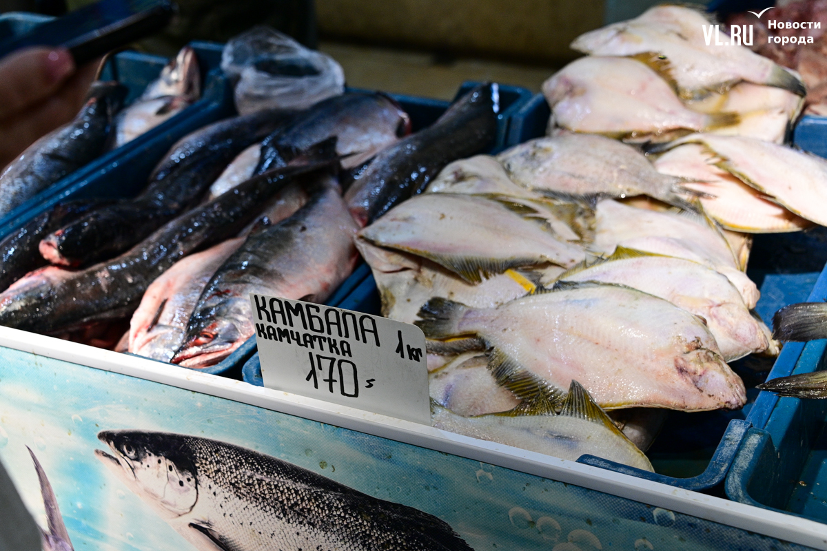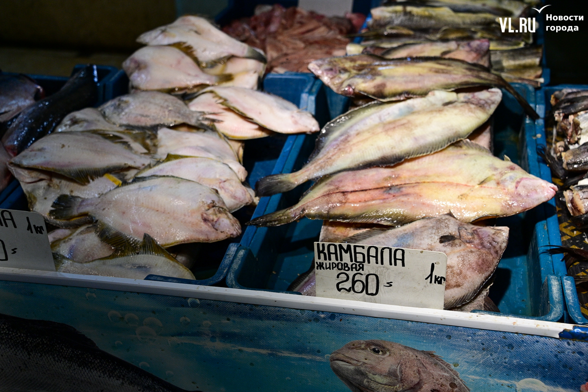 Кроме красной рыбы, на рынке в это время традиционно много свежих охлаждённых сазанов – 160-180 рублей за килограмм. Есть камбала, но продавцы говорят, её сейчас совсем немного – 150-260 рублей за килограмм. Есть местная парная, но в основном – с Камчатки.