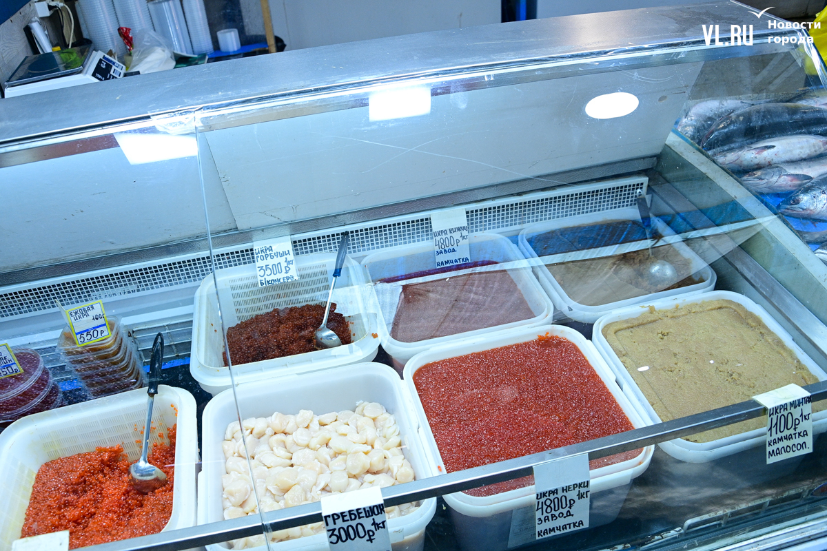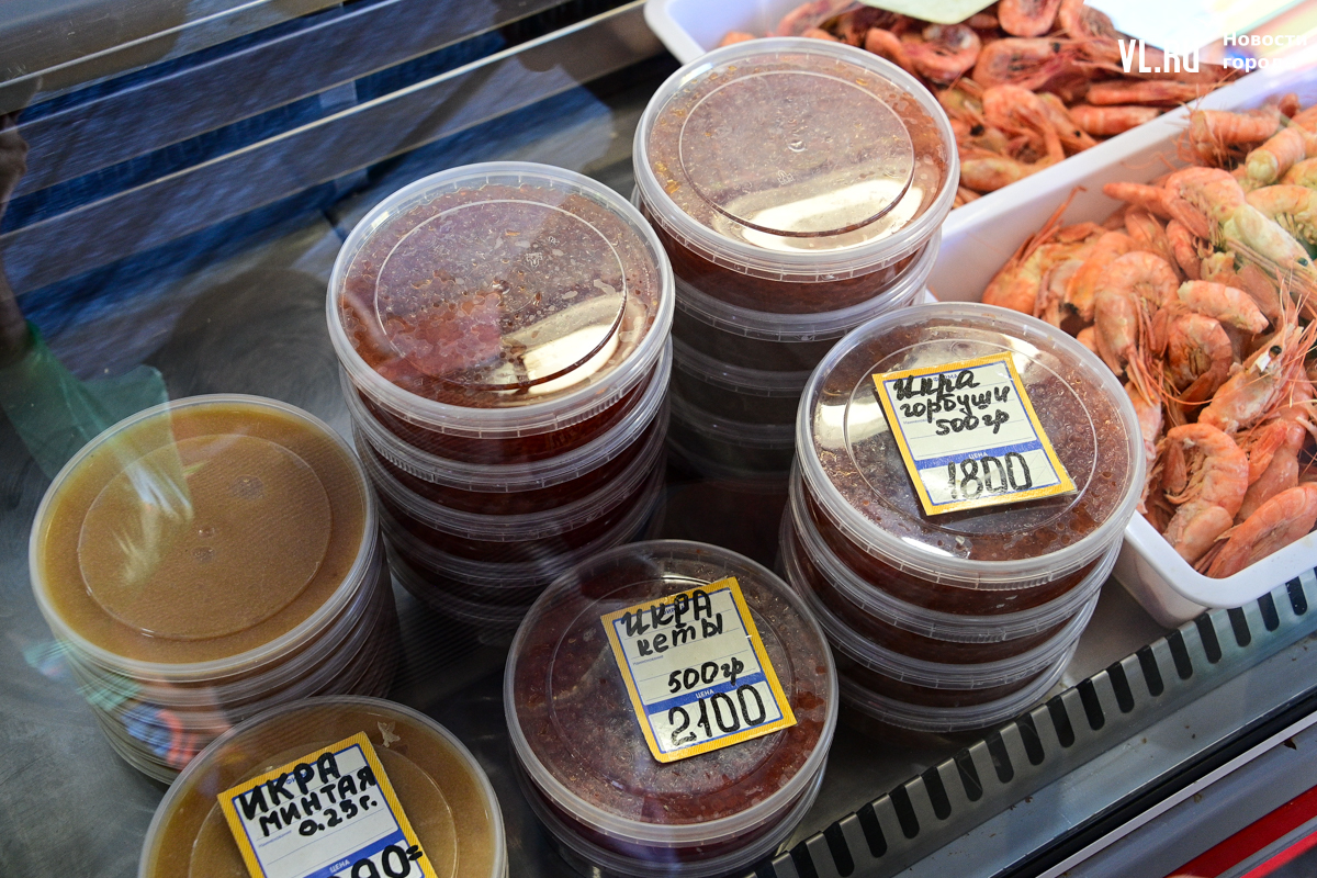 Икра на Спортивном рынке пока только прошлогодняя. Зато цена на неё немного утешает – эксперты предрекают, «новая» будет намного дороже. Вся икра камчатская. Если брать на развес – её достают из пластиковых вёдер – то нерка и кижуч стоят 4800 рублей за килограмм, горбуша – 3500, кета – 3700. Уже расфасованная в прозрачный пластик чуть дороже – горбуша 1800 за полкилограмма, а кета – 2100 за тот же вес. И один продавец на всём рынке демонстрировал чудеса щедрости – у него лососёвая икра стоила 2000 рублей за килограмм. Правда, несолёная.