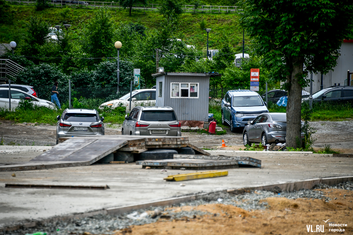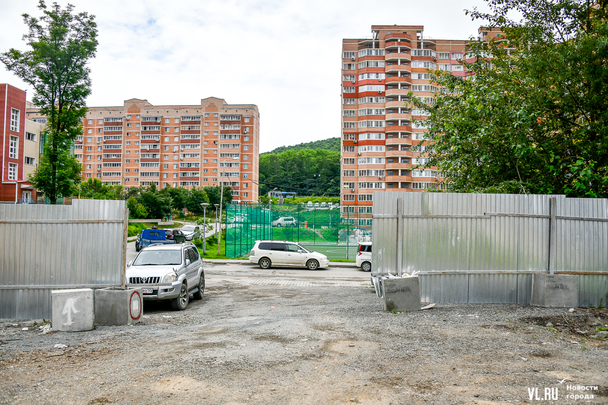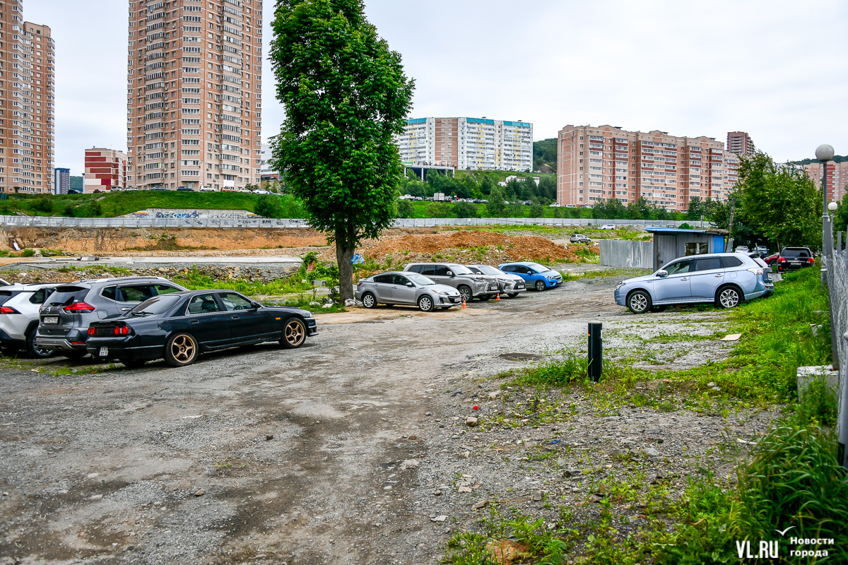 На некоторых бетонных кубиках нарисованы нацистские символы, как напоминание о днях, когда банда с «ультраправым» уклоном терроризировала весь район. Но в одном месте, со стороны Анны Щетининой, 3, блоки и кусок забора вообще убрали. Здесь тоже парковка, но как сказали местным жителям в администрации Владивостока, законная. На кадастровой карте это и впрямь другой участок, 25:28:040014:9866. Он в муниципальной собственности. Но арендатора официально у него нет, так что вопрос законности парковки открытый. Тем не менее на этой парковке даже с помощью опалубки и камней обозначена граница участка.
