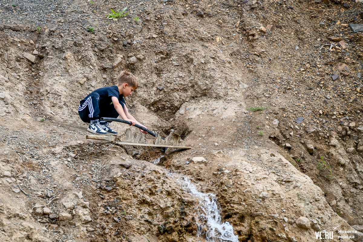 Чуть дальше, на склоне в районе дома № 25 на улице Щетининой, из косогора торчит труба. А из этой трубы бежит настоящий водопад. Откуда она выходит и почему из неё льётся чистейшая холодная вода – кто его знает. Но юные инженеры место обустроили: подложили под воду кусок забора, чтобы вода не стекала в грунт, отыскали трубы, сделали мостки, накидали в лужу огромных шин. В общем, благоустроили без всяких конкурсов и грантов «экотропу», по которой теперь весело носятся, окатывая друг друга водой. И вот уже кажется – зачем им новая школа? Они тут все и так умные, будущие строители.