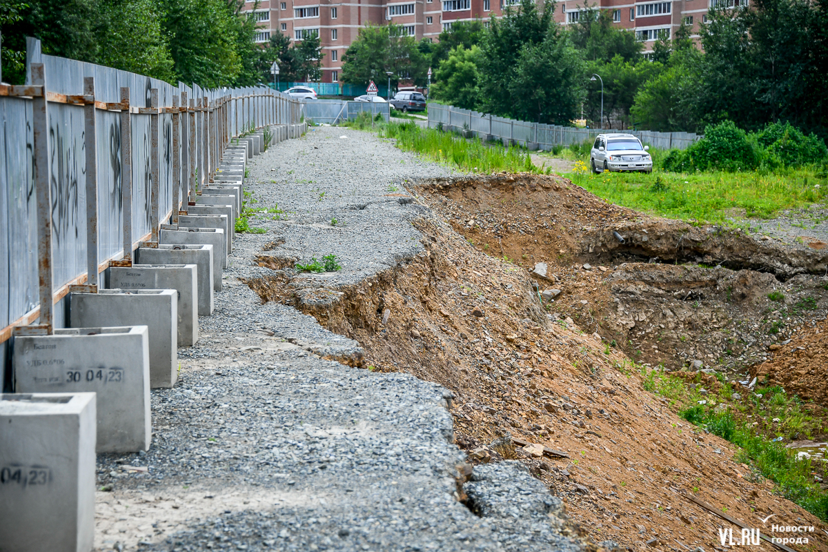 Только вот неукреплённый склон после осадков начал сползать вниз, в одном месте добравшись уже до бетонных кубиков, на которых держится забор. Ещё пара затяжных дождей, и остаток косогора вместе с ограждением рискует оказаться внизу.