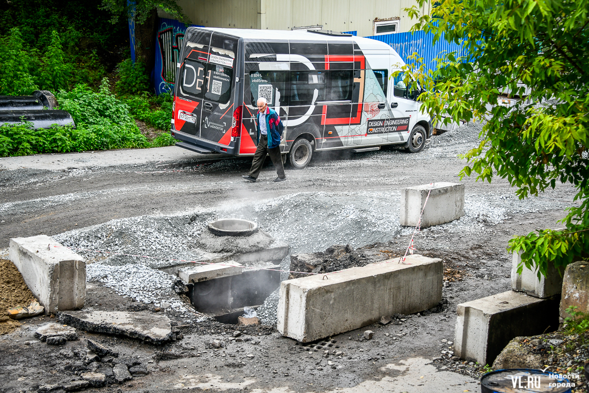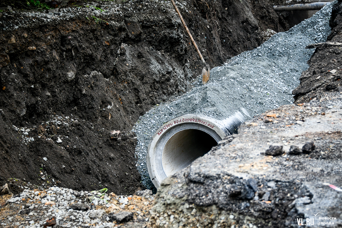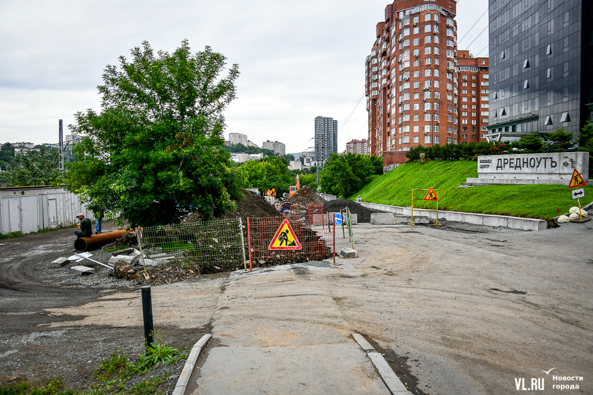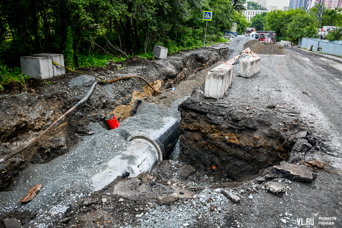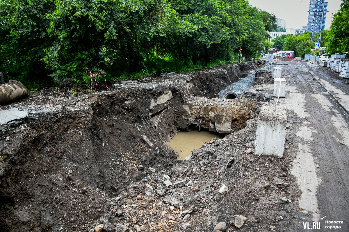 Улица Авроровская вдоль дома № 17 до сих пор перекрыта, хотя транспорт по ней планировали пустить ещё в начале июля. Недавно администрация Владивостока выпустила постановление, согласно которому сквозной проезд здесь закрыт до 15-го числа. Возможно, перенос не последний: работы по перекладке проблемной ливнёвки сейчас в самом разгаре. Дорога превратилась в траншею, которую не объедешь. В отсутствие проезда соседняя улица Пограничная уже много дней стоит в бесконечной пробке с утра до позднего вечера.