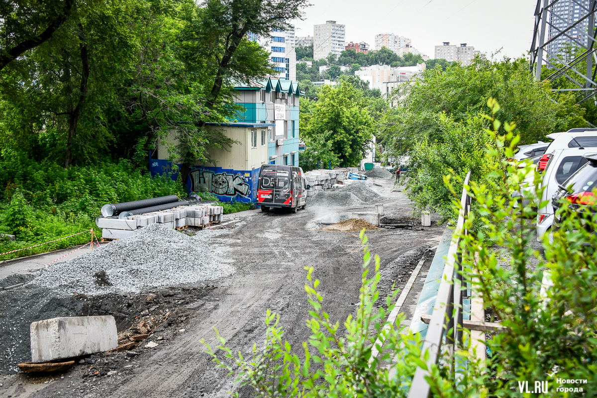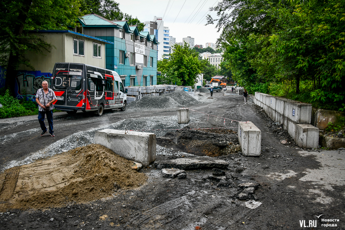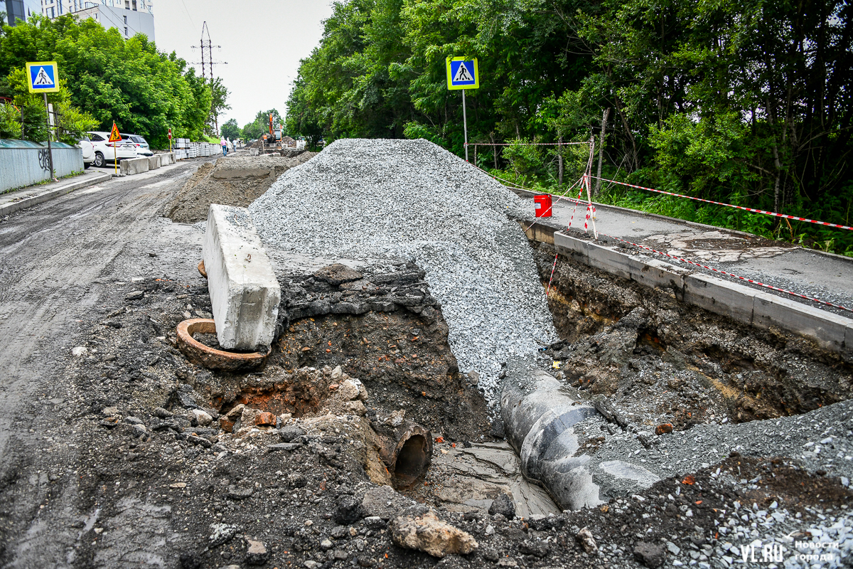 Здесь всё ещё вскрыта дорога, рабочие укладывают новые трубы ливневой канализации. Штабелями лежат бордюры, но до их установки ещё далеко. Работы ведутся, хотя особой спешки или большого скопления рабочих корреспонденты Новостей VL.ru не заметили. Люди ходят по перекрытой улице, лавируя между ямами, колодцами и бордюрами. Проезжают мотоциклисты и велосипедисты.