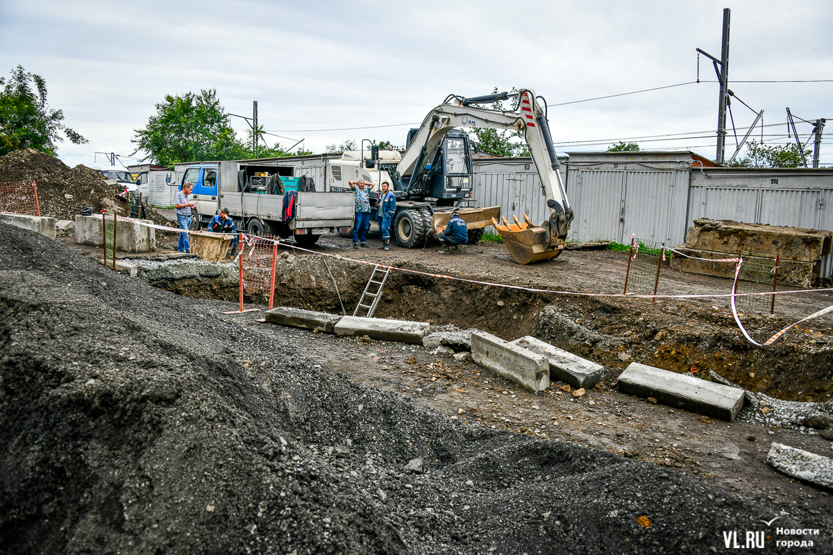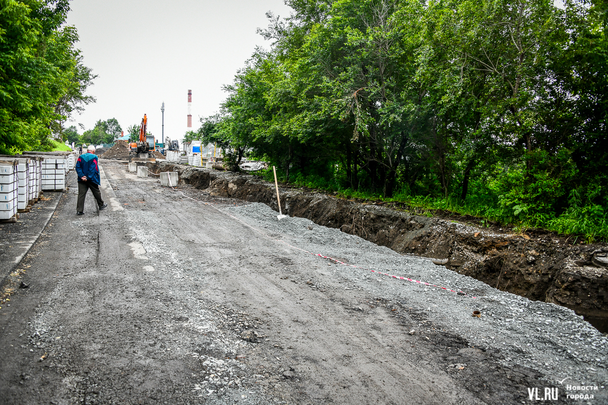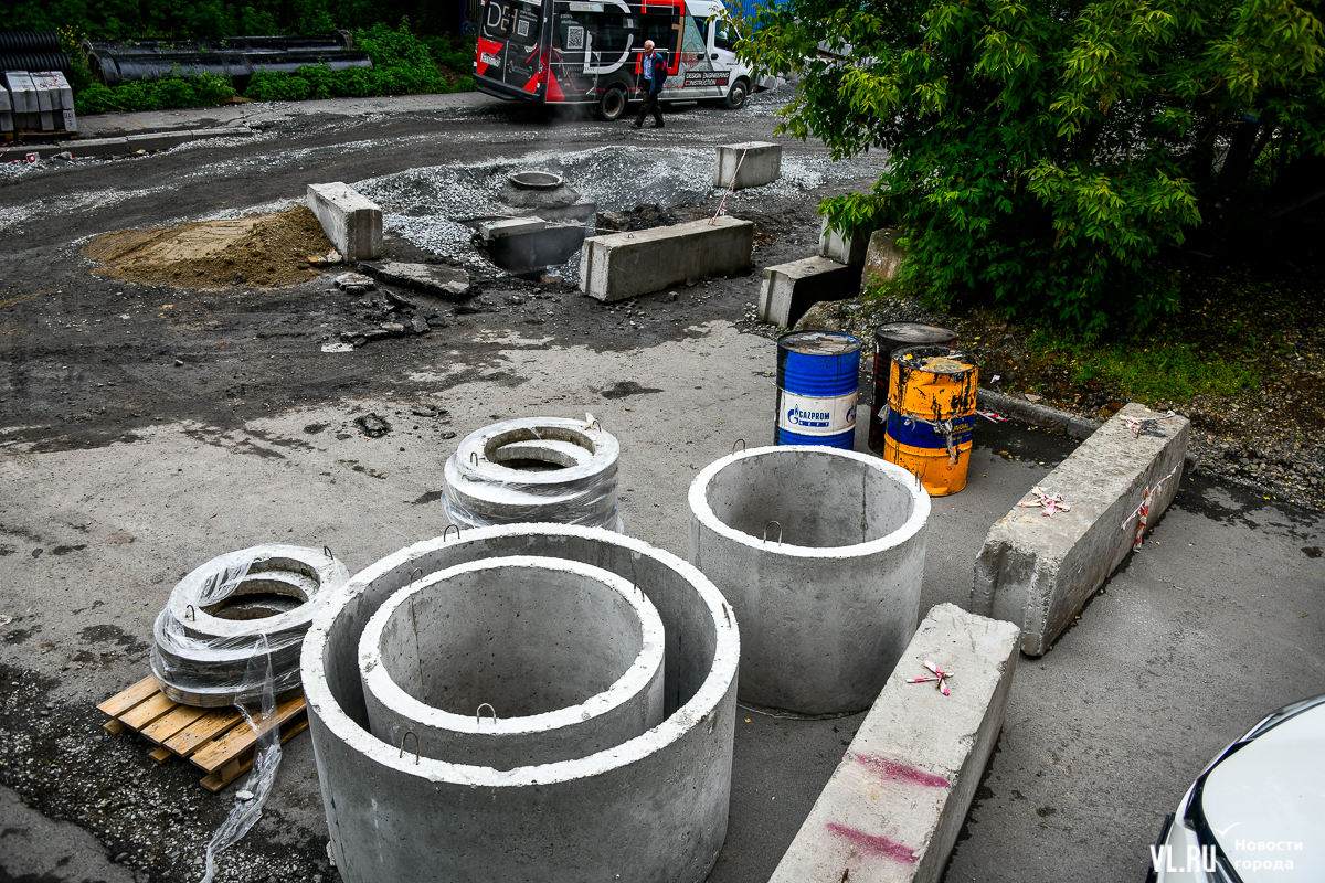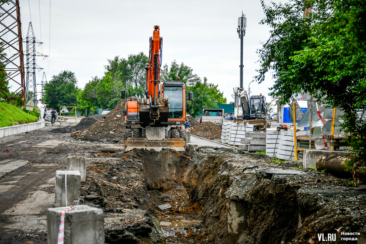 Здесь всё ещё вскрыта дорога, рабочие укладывают новые трубы ливневой канализации. Штабелями лежат бордюры, но до их установки ещё далеко. Работы ведутся, хотя особой спешки или большого скопления рабочих корреспонденты Новостей VL.ru не заметили. Люди ходят по перекрытой улице, лавируя между ямами, колодцами и бордюрами. Проезжают мотоциклисты и велосипедисты.