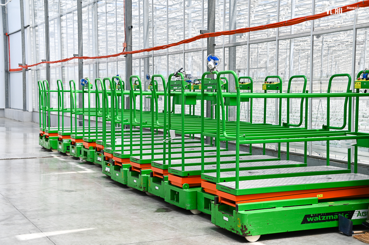 По основной дорожке слева от огуречных рядов снуют электрокары. Овощи собирают непрерывно, и свежая продукция уходит семь дней в неделю. Овощевод с коробками на тележках едет между огуречными рядами – собирает, складывает... Урожай вывозят на дорожку, формируют поддоны с продукцией, и электрокар всё увозит. Перед очередным визитом в овощное отделение водитель моет мыльным раствором колёса.