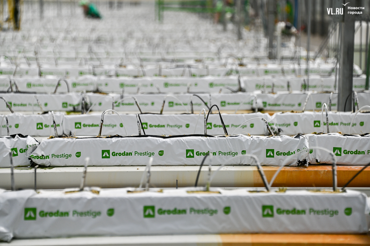 Если огурцы собирают круглый год – одно отделение закрыто, а второе работает, то с помидорами перерыв есть. Здесь на подготовку к новому обороту уходят оба отделения. Но у томатов не три, а один оборот в год – они растут в течение 11 месяцев. Штабеля с новым субстратом уже ждут у входа в отделение – старый обязательно заменят. Комбинат производят продукцию с октября по июль, а с середины июля и до середины октября, томатов «Урожая Приморья» в магазинах нет.