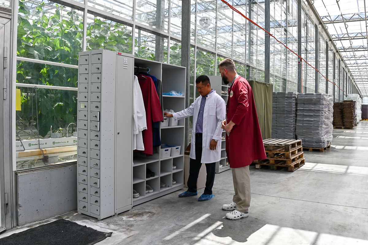При входе в любое отделение люди заново надевают сменные халаты – они хранятся здесь же. В одном по всем теплицам не походишь. Вышел из одной, входишь в другую – одежду меняешь. У тех, кто работает с огурцами, она зелёная, у тех, кто с помидорами, – красная. Сменная обувь тоже у каждого отделения своя. На каждом входе – антисептик для рук.