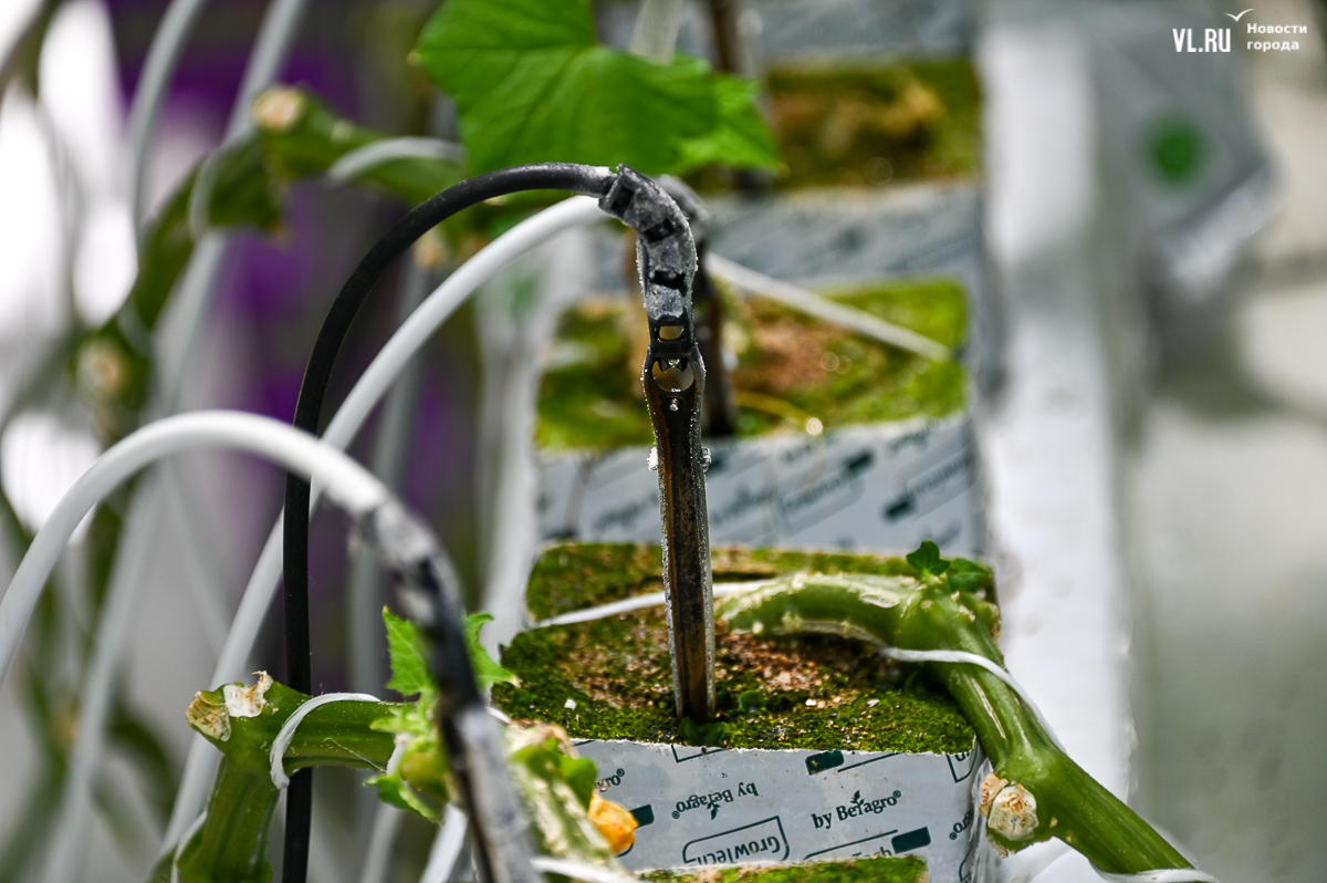 К каждому растению тянется капельница с микрошлангом, по которому подаётся сбалансированный по всем элементам питательный раствор. Его рассчитывает агроном по питанию.