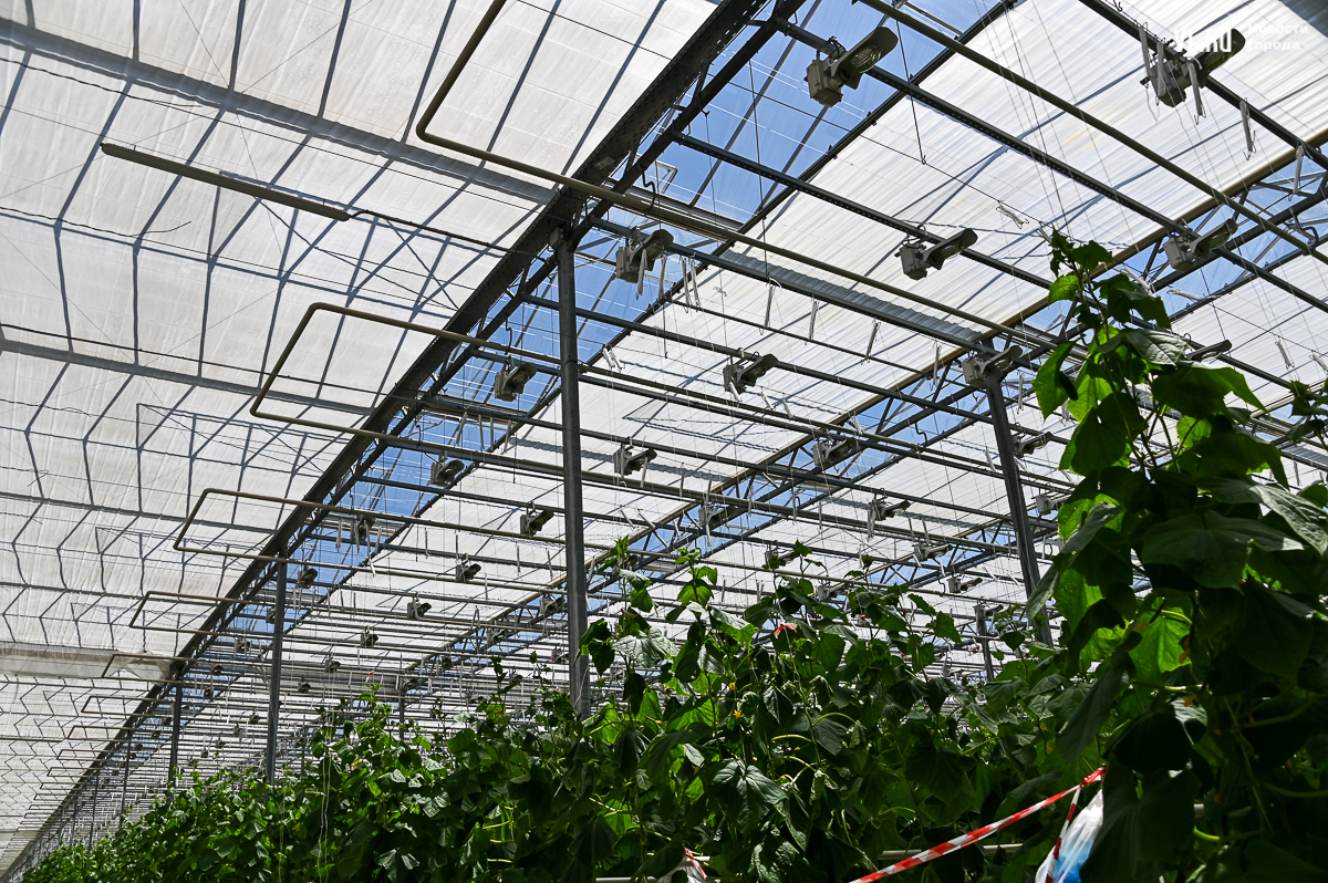 Теплицы видны насквозь – потолок, а также внешние и внутренние стены стеклянные. Высота – 4,5 метра, и сейчас, в жару, часть крыши затянута полупрозрачными «шторами» и «форточки» наверху открыты. А в холода, когда солнца мало, культуру дополнительно подсвечивают.