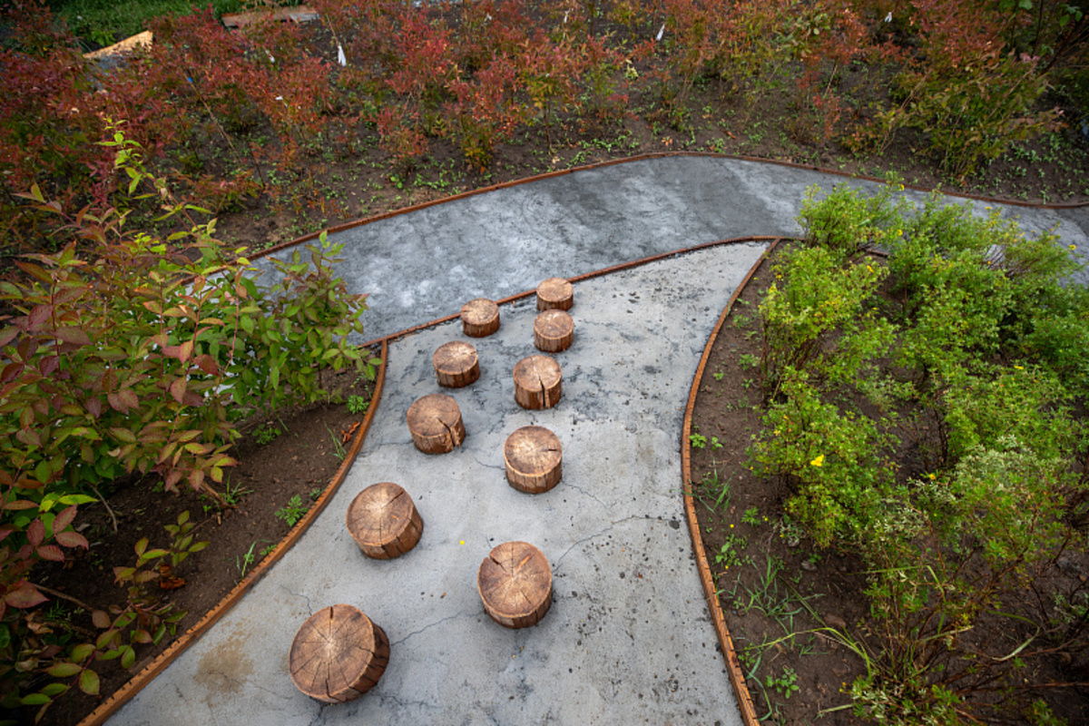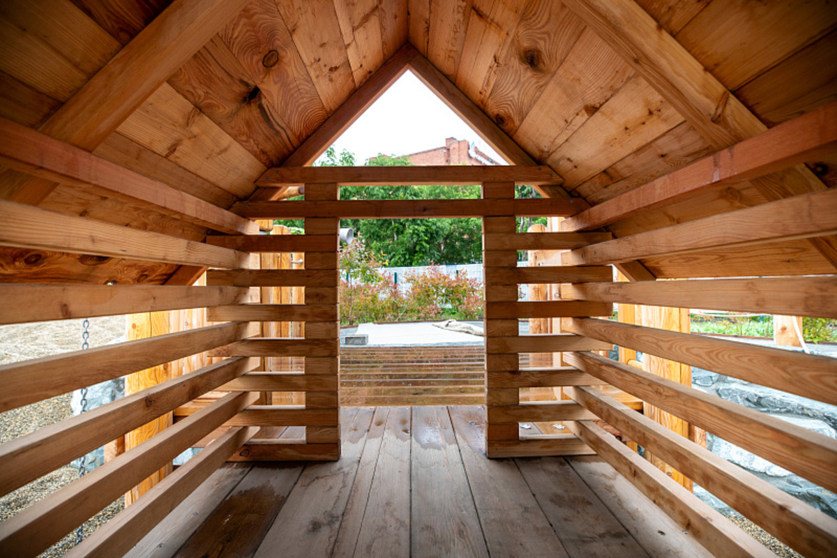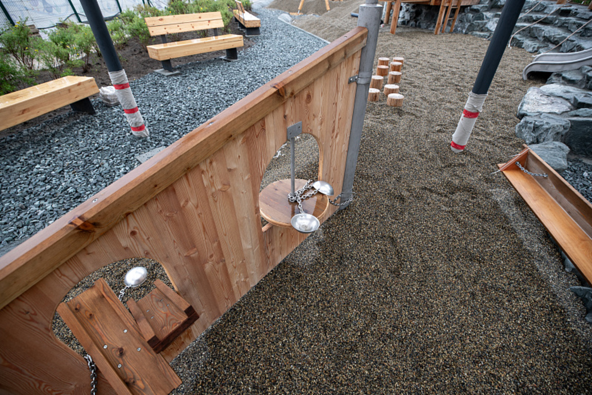 Площадка поделена на несколько зон и ориентирована на разные возрастные группы. Например, для самых маленьких построен специальный игровой комплекс, направленный на развитие моторики и творчества. Это различные совочки и конструкции для пересыпки песка или гальки, а также водная зона с песком – здесь с помощью помпы дети могут намочить песок и лепить из него фигурки. Во время разработки проекта архитекторы консультировались с детским психологом, чтобы игровые комплексы были максимально направлены на развитие детей. Здесь также учли запрос на инклюзивную среду – вдоль всей площадки проходит тропа для людей с ограниченными возможностями здоровья.