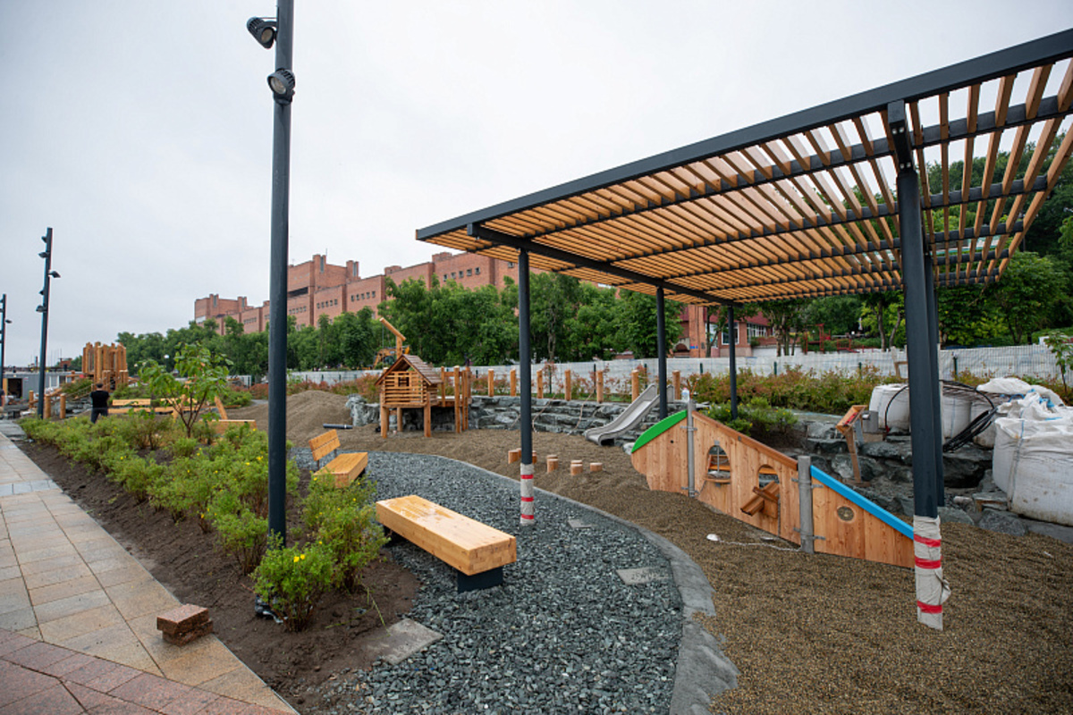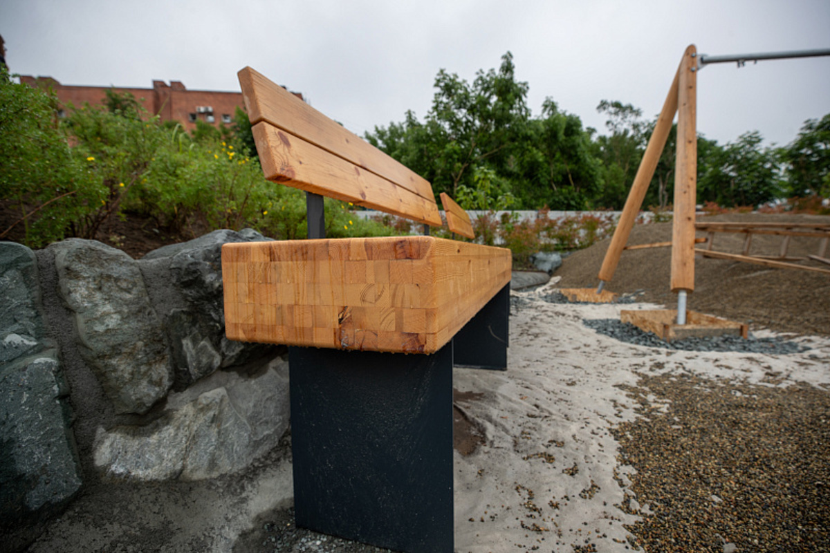 Как сообщает администрация Владивостока, в основу проекта лёг образ Милоградовского водопада, который находится в Ольгинском районе. По словам архитектора команды ландшафтно-архитектурного бюро «АФА» Марины Лабутиной, стенки из камня, острые углы которого зашлифовали, – это отсылка к самому водопаду, центральная часть площадки, засыпанная галькой, олицетворяет реку, деревянные игровые конструкции также поддерживают природный образ.