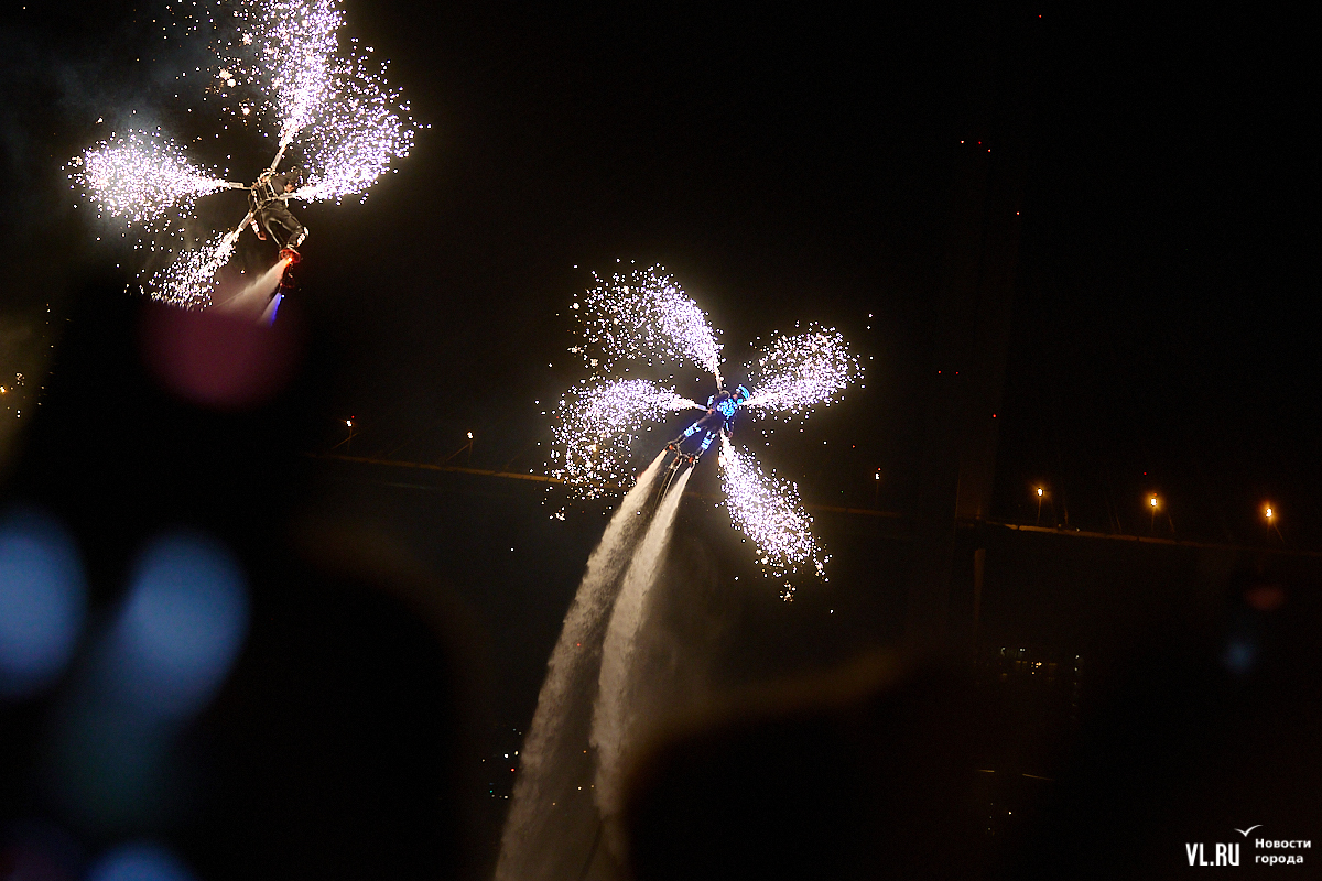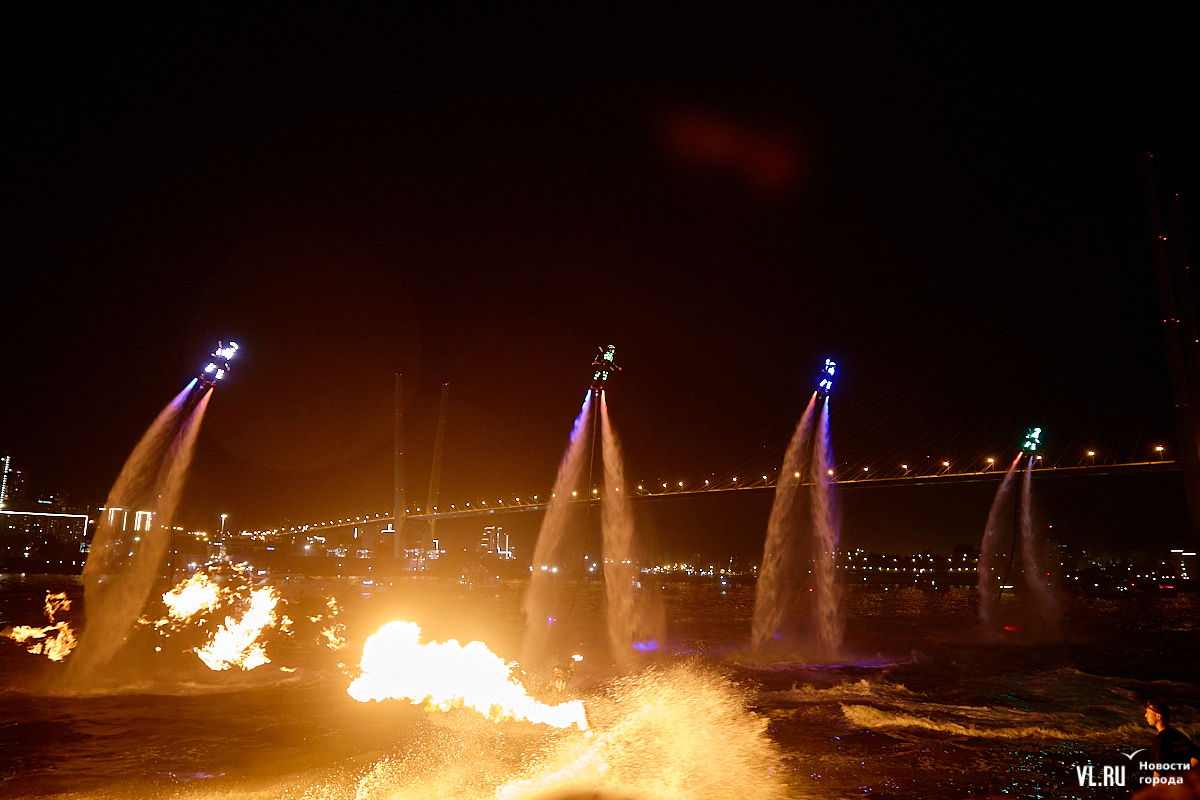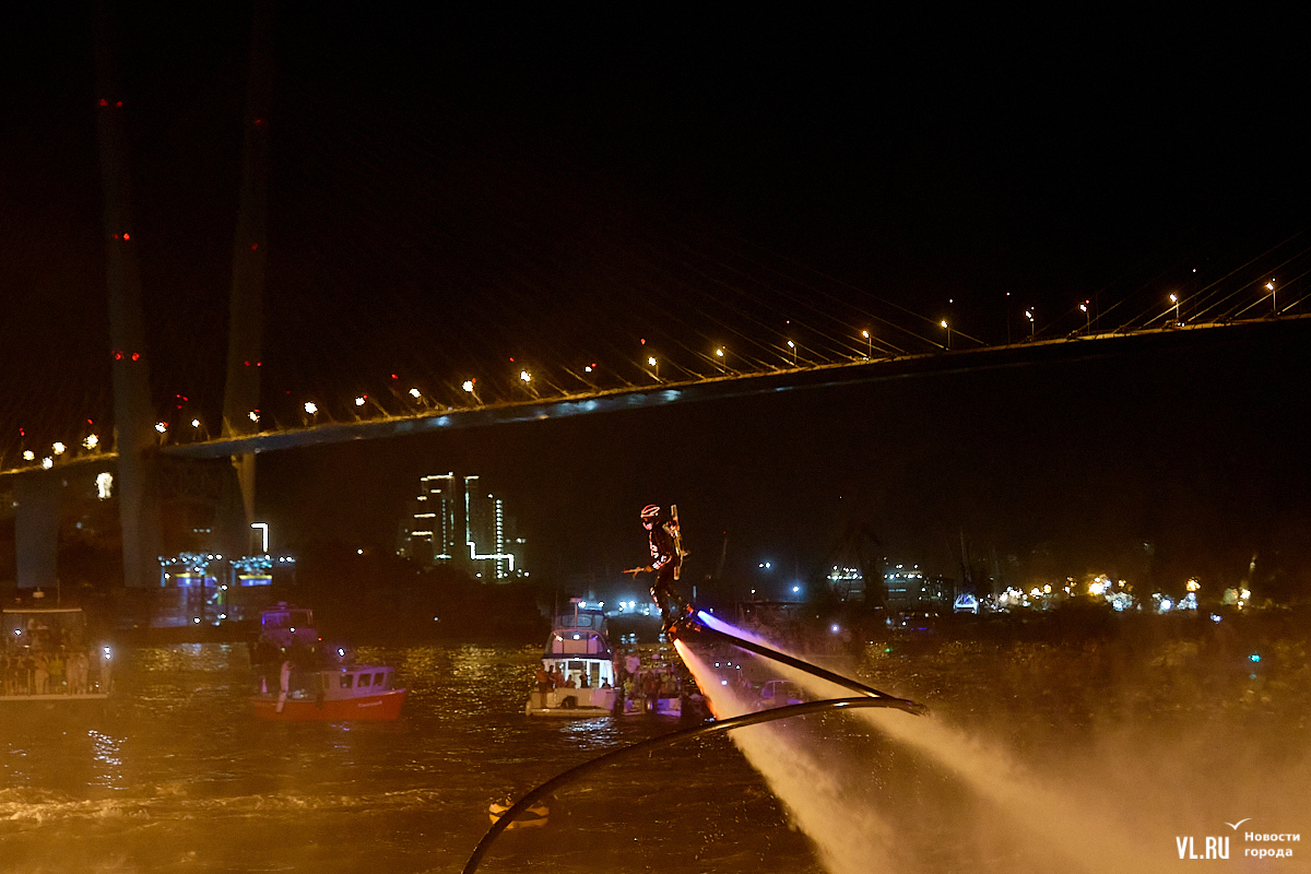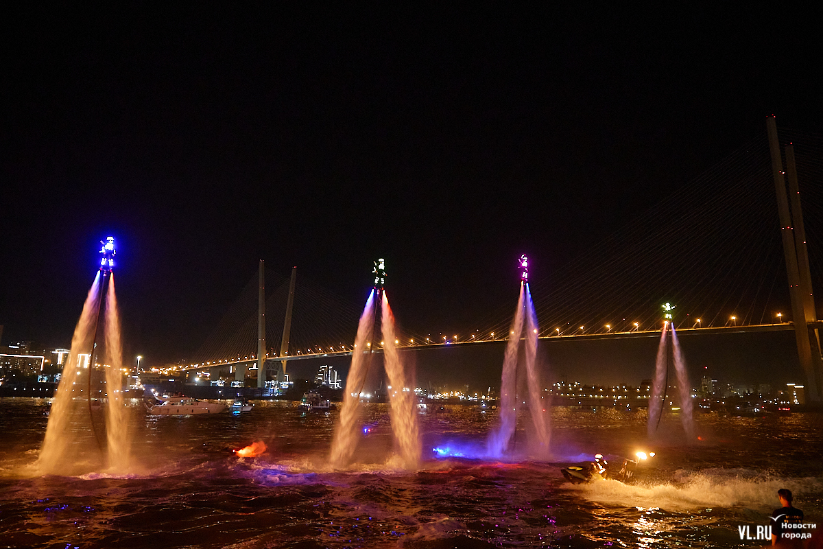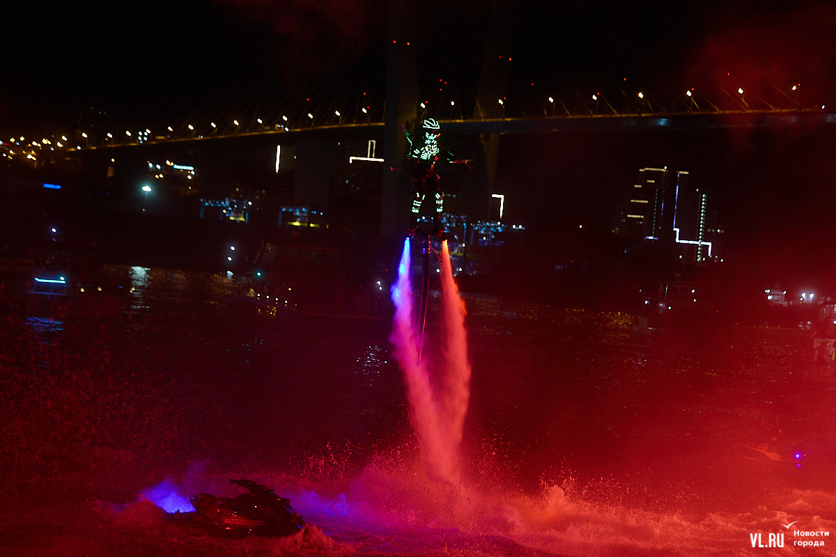 Празднование Дня города в этом году завершилось не традиционным фейерверком, а водным шоу, хотя без искр на фоне ночного неба не обошлось. Сначала зрители увидели огненные залпы, а за ними четыре спортсмена-райдера взмыли на высоту нескольких этажей над бухтой Золотой Рог. Их светящиеся костюмы переливались всеми цветами радуги, а струи воды, за счёт реактивной тяги которых они то поднимались, то опускались, описывали различные фигуры. Сначала у райдеров в руках оказались дымовые шашки, а потом из спин выросли крылья из огней пиротехники.