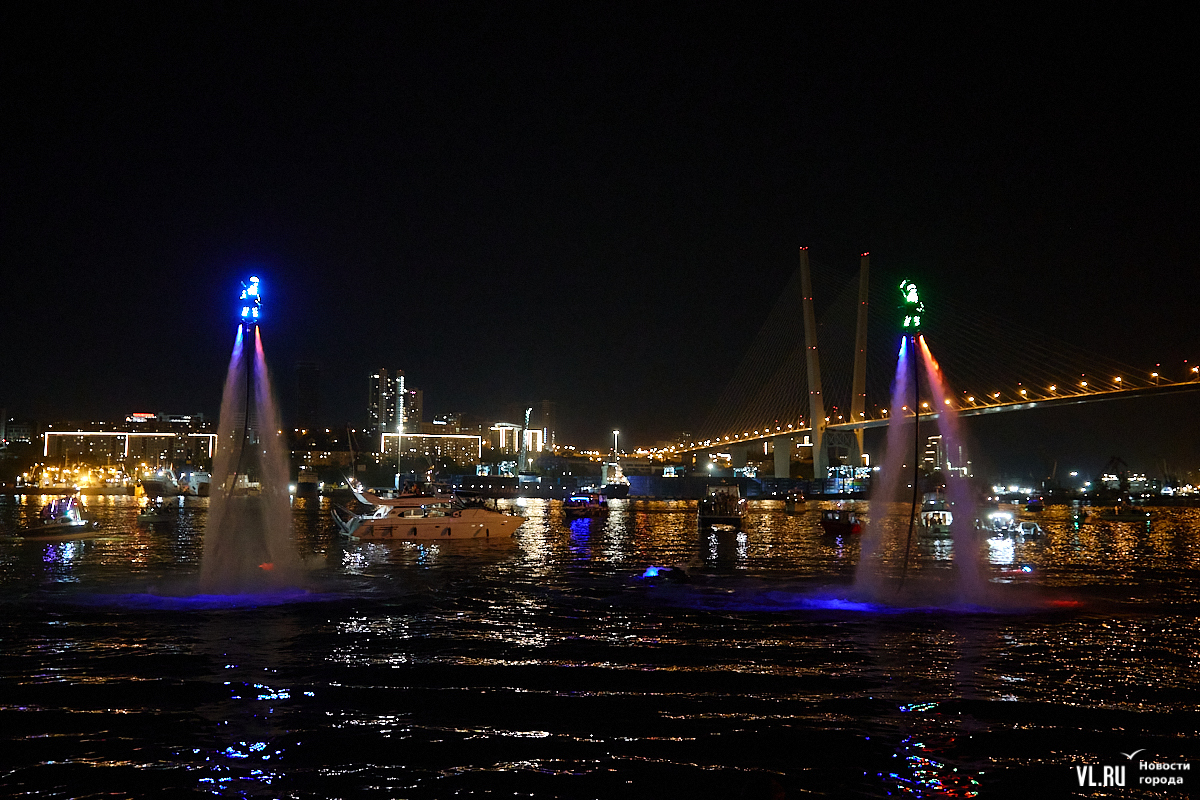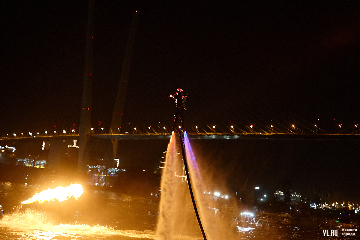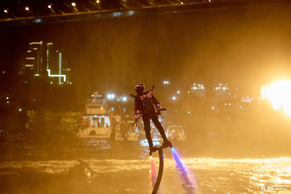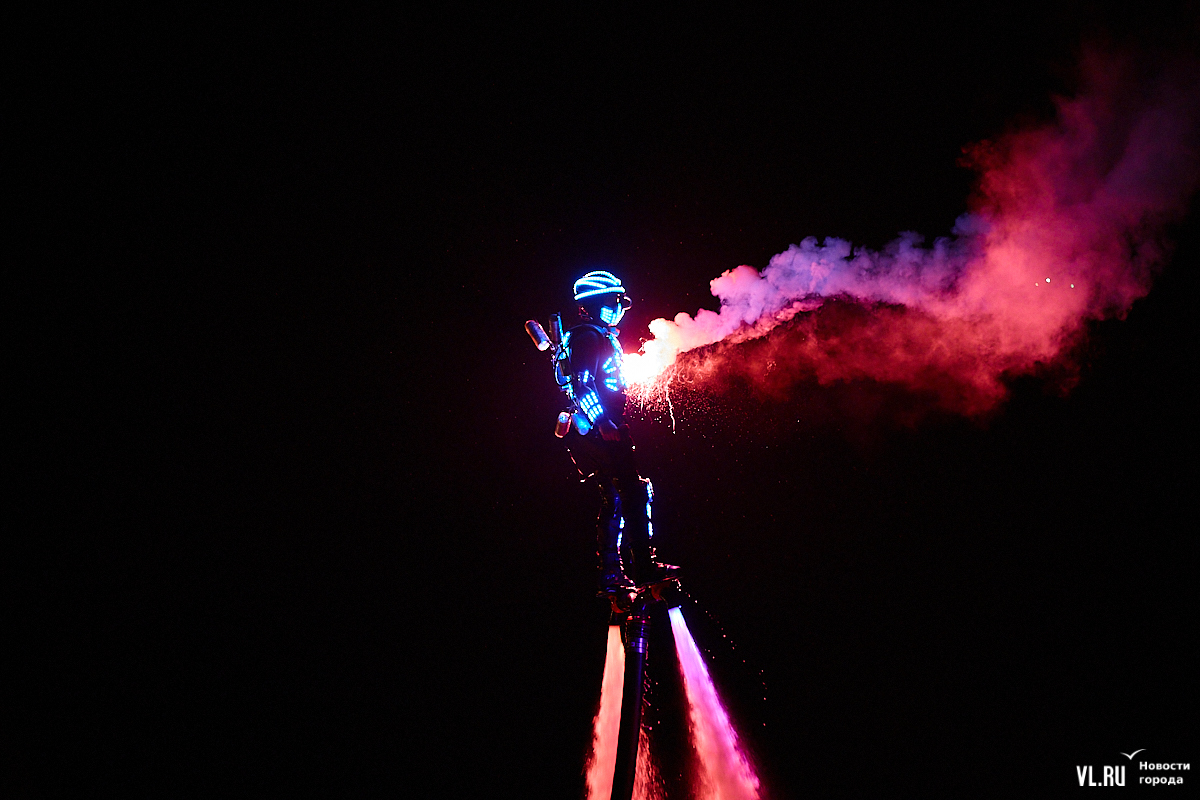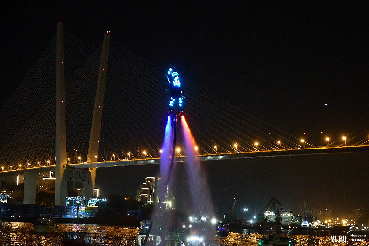 Празднование Дня города в этом году завершилось не традиционным фейерверком, а водным шоу, хотя без искр на фоне ночного неба не обошлось. Сначала зрители увидели огненные залпы, а за ними четыре спортсмена-райдера взмыли на высоту нескольких этажей над бухтой Золотой Рог. Их светящиеся костюмы переливались всеми цветами радуги, а струи воды, за счёт реактивной тяги которых они то поднимались, то опускались, описывали различные фигуры. Сначала у райдеров в руках оказались дымовые шашки, а потом из спин выросли крылья из огней пиротехники.