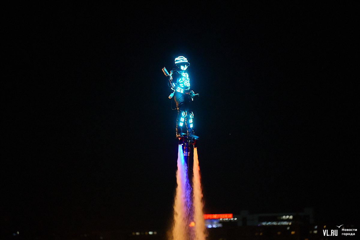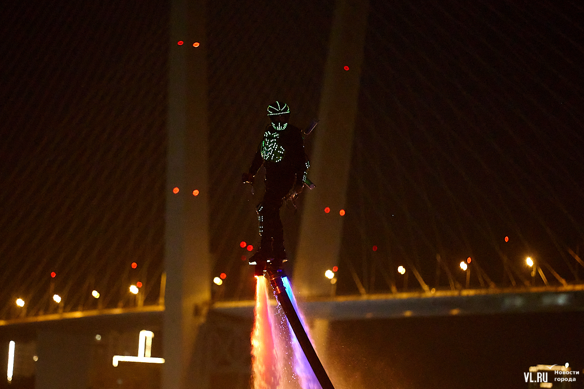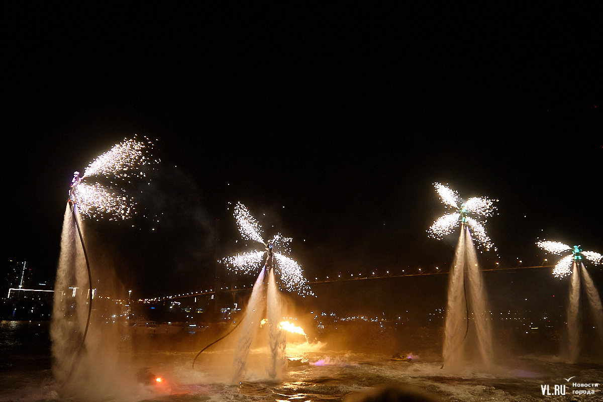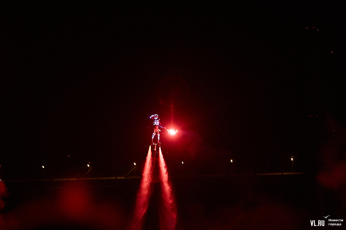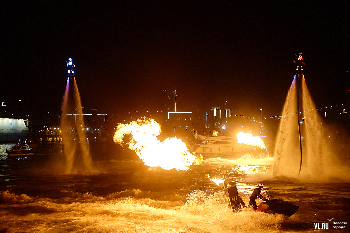 Празднование Дня города в этом году завершилось не традиционным фейерверком, а водным шоу, хотя без искр на фоне ночного неба не обошлось. Сначала зрители увидели огненные залпы, а за ними четыре спортсмена-райдера взмыли на высоту нескольких этажей над бухтой Золотой Рог. Их светящиеся костюмы переливались всеми цветами радуги, а струи воды, за счёт реактивной тяги которых они то поднимались, то опускались, описывали различные фигуры. Сначала у райдеров в руках оказались дымовые шашки, а потом из спин выросли крылья из огней пиротехники.