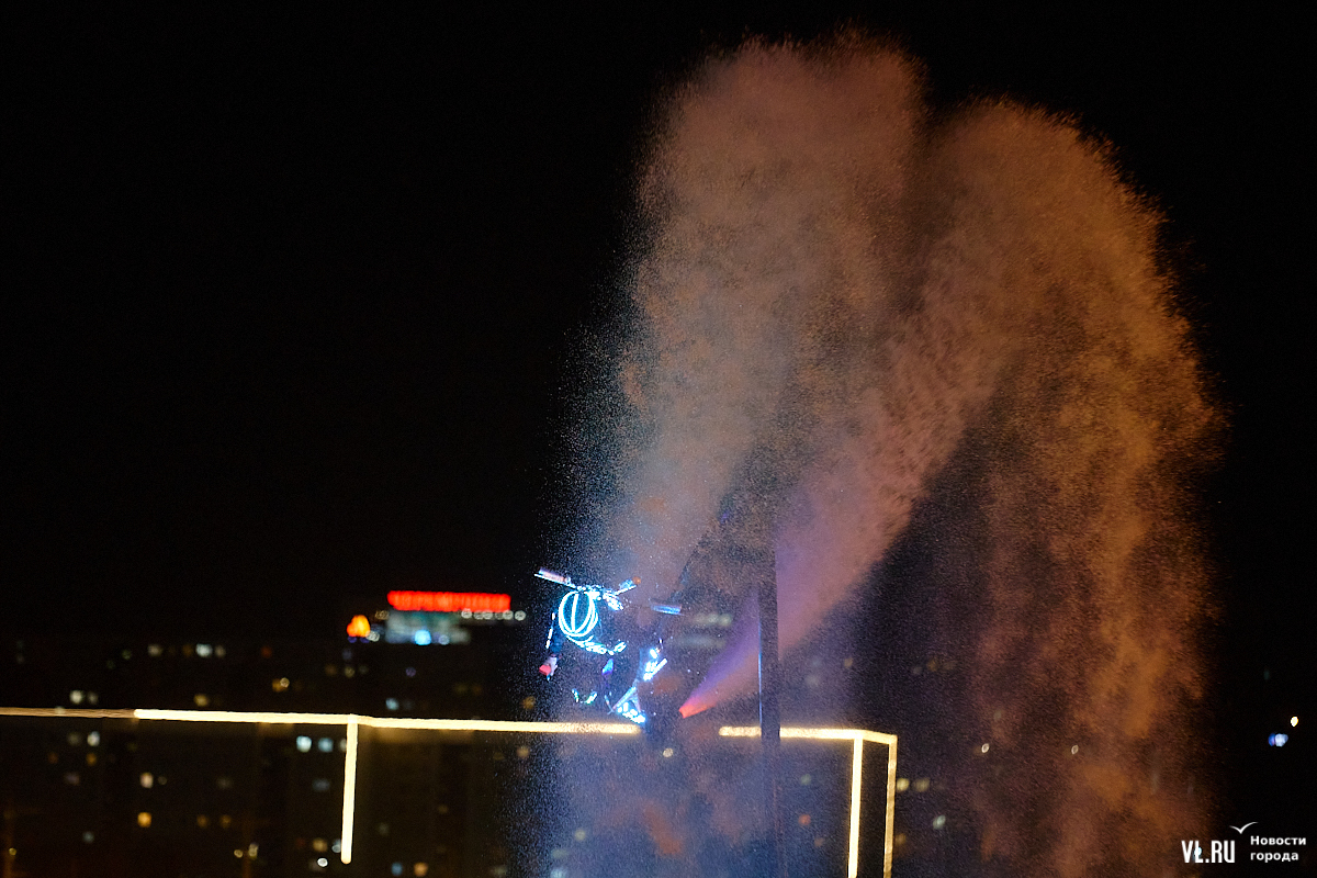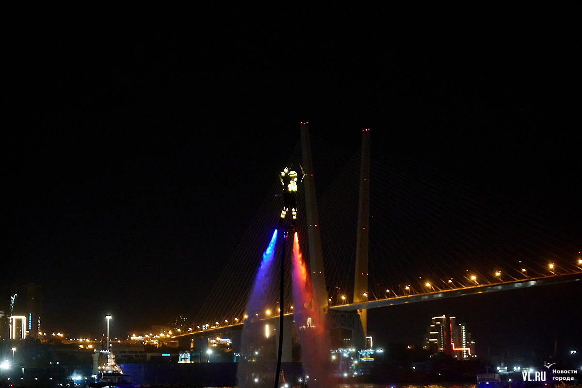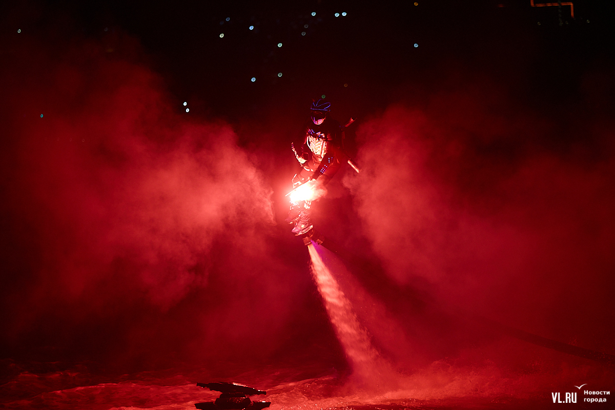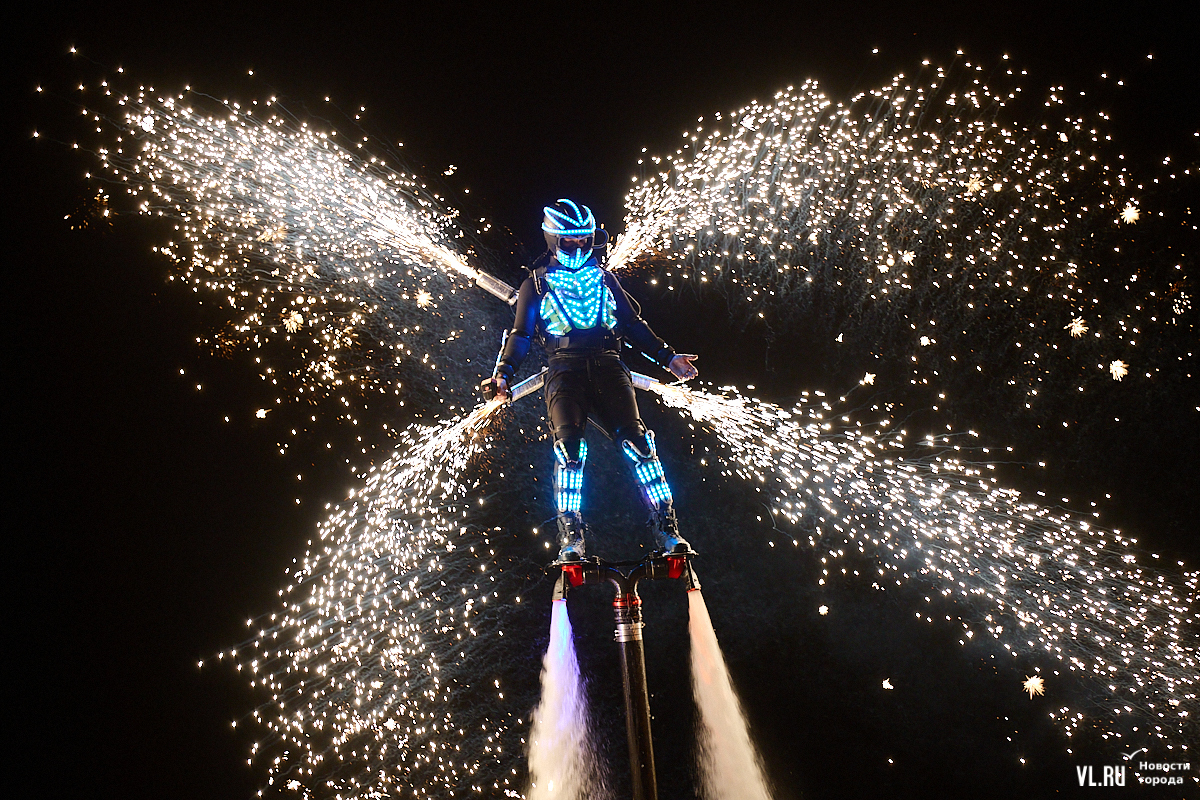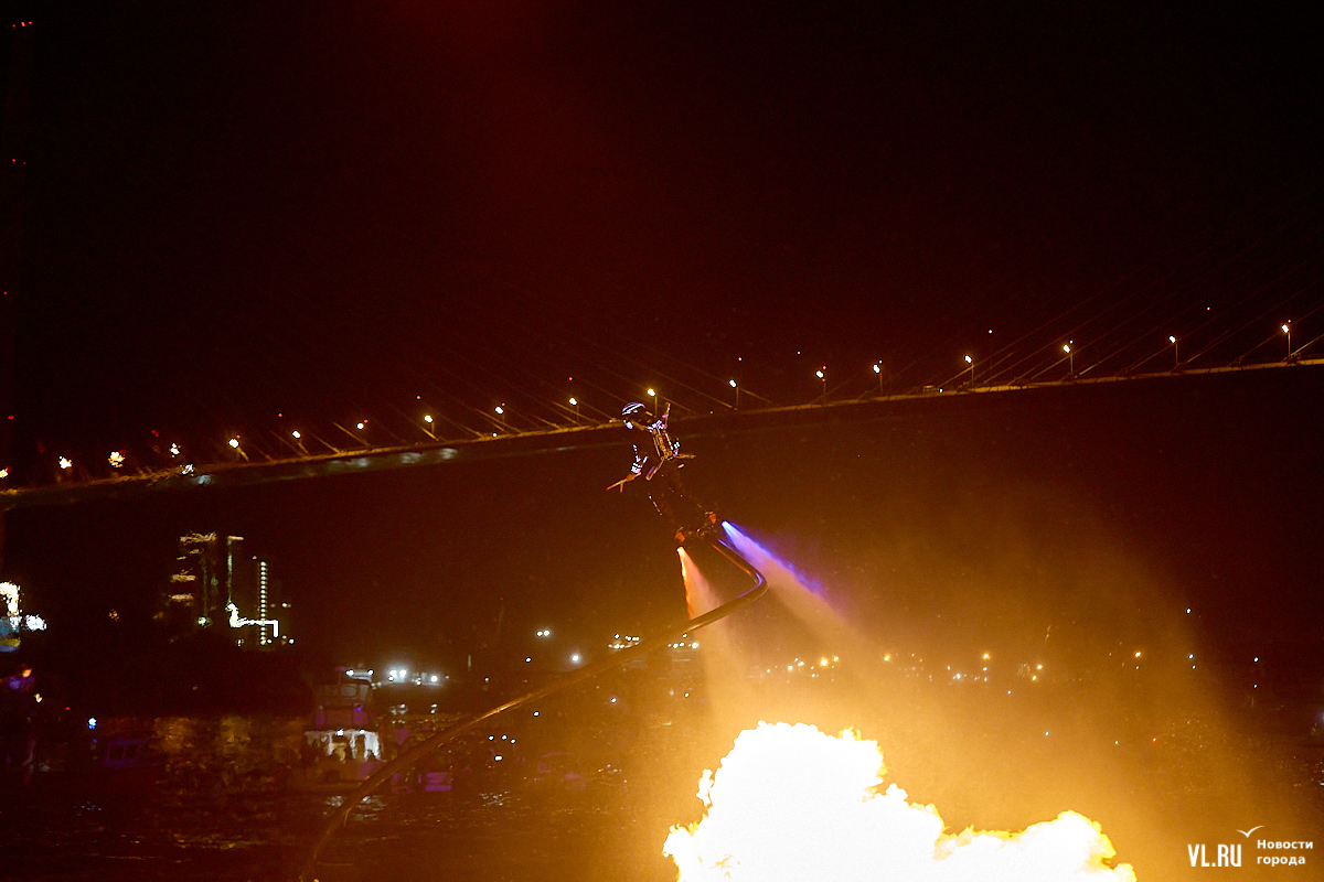Празднование Дня города в этом году завершилось не традиционным фейерверком, а водным шоу, хотя без искр на фоне ночного неба не обошлось. Сначала зрители увидели огненные залпы, а за ними четыре спортсмена-райдера взмыли на высоту нескольких этажей над бухтой Золотой Рог. Их светящиеся костюмы переливались всеми цветами радуги, а струи воды, за счёт реактивной тяги которых они то поднимались, то опускались, описывали различные фигуры. Сначала у райдеров в руках оказались дымовые шашки, а потом из спин выросли крылья из огней пиротехники.