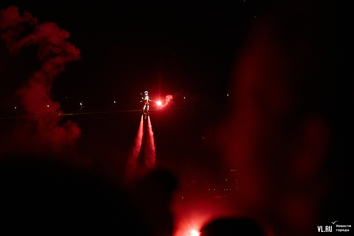 Когда певица IOWA попрощалась со зрителями, толпы людей отправились поближе к бухте Золотой Рог в ожидании необычного зрелища, которое в этот раз заменило фейерверк. Люди толпились на лестницах, лужайках, арт-объектах, оставшихся после праздника, подготовив камеры телефонов. Вначале вдоль побережья вспыхнули огненные залпы, предваряющие шоу, а потом в воздух из моря поднялись четыре спортсмена в светящихся костюмах.