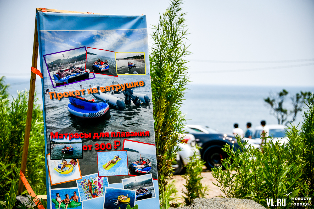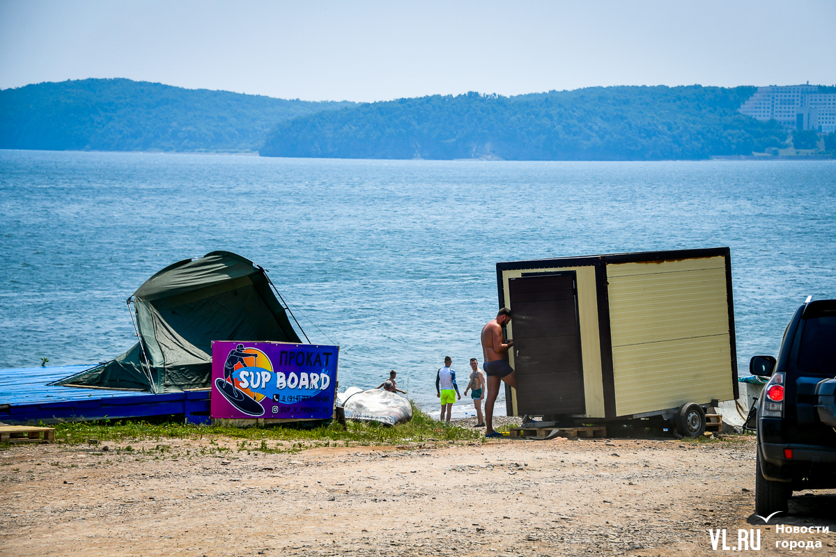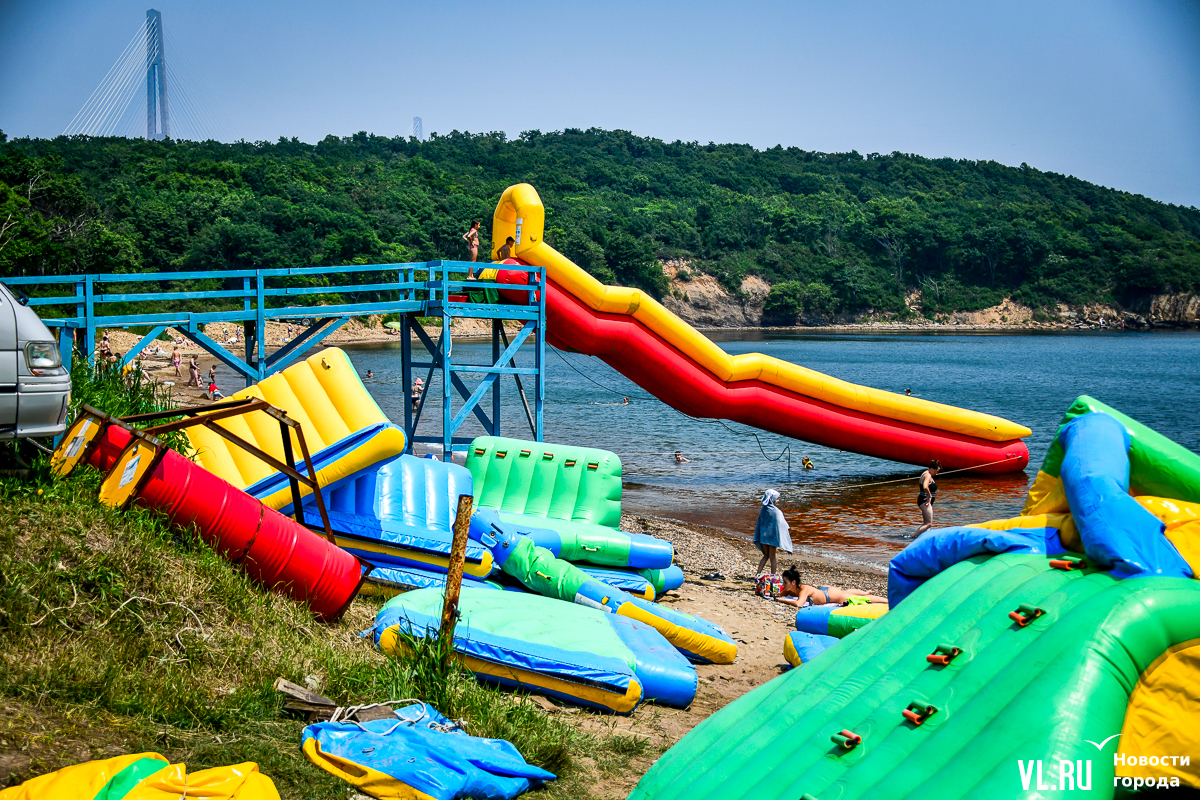 Вода чистая, масштабного цветения водорослей, с которым недавно столкнулся Владивосток в Амурском заливе, тут не заметно. Берег с мелким песком местами размыт. Разнообразить отдых можно, например, надувной горкой – она бесплатная. Почему-то. Во всяком случае, с нас никто денег не взял. Но об этом, видимо, не все знают, потому что на горке всего несколько человек. А вот аренда сапов – от 500 рублей в час. Лежаков и зонтиков мы не нашли.