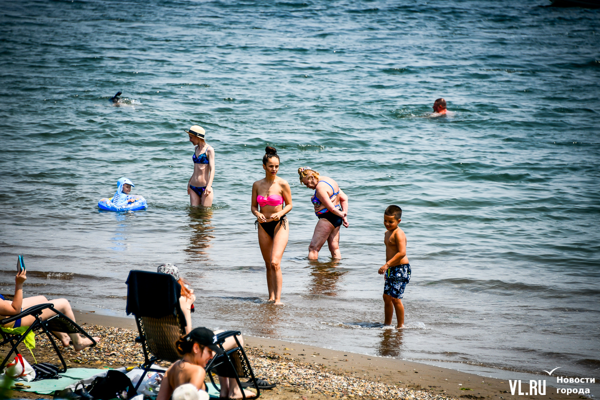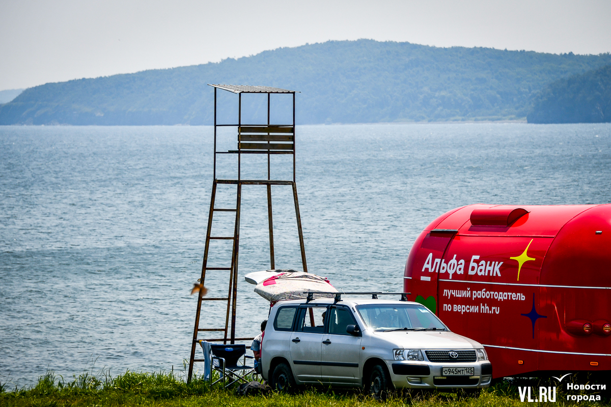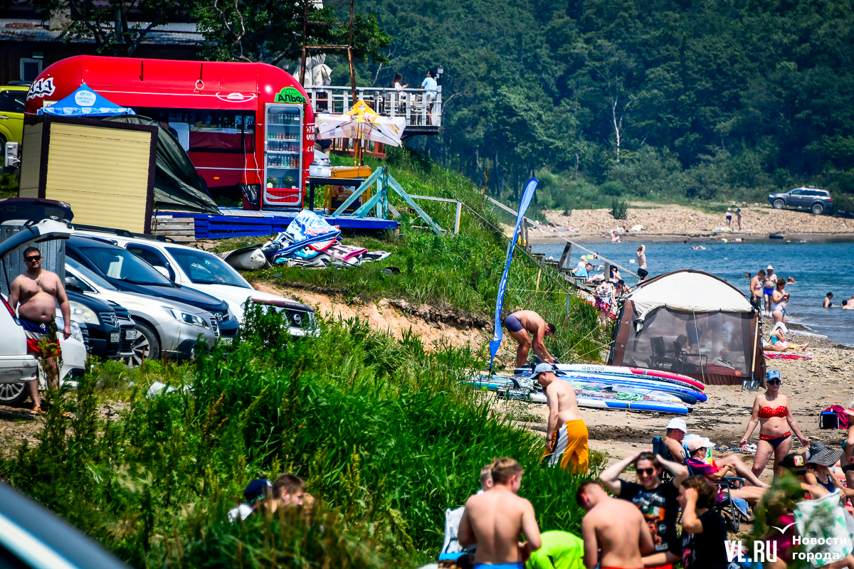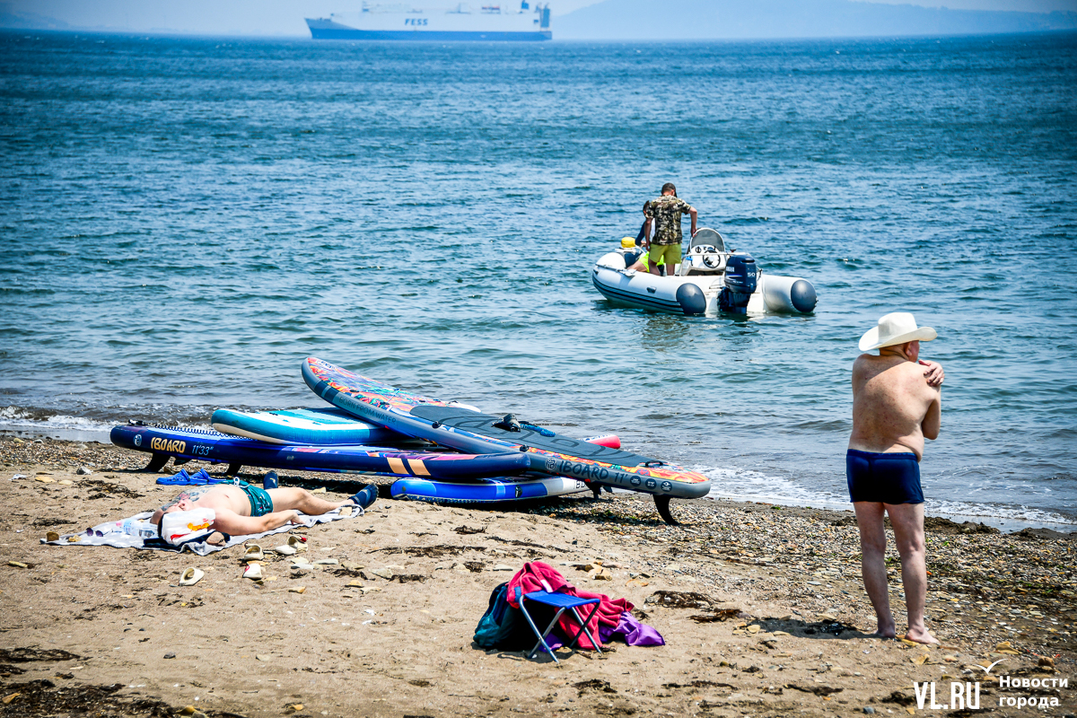Вода чистая, масштабного цветения водорослей, с которым недавно столкнулся Владивосток в Амурском заливе, тут не заметно. Берег с мелким песком местами размыт. Разнообразить отдых можно, например, надувной горкой – она бесплатная. Почему-то. Во всяком случае, с нас никто денег не взял. Но об этом, видимо, не все знают, потому что на горке всего несколько человек. А вот аренда сапов – от 500 рублей в час. Лежаков и зонтиков мы не нашли.