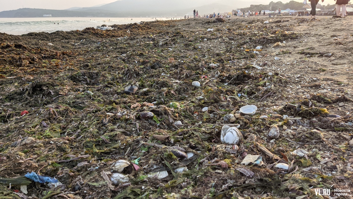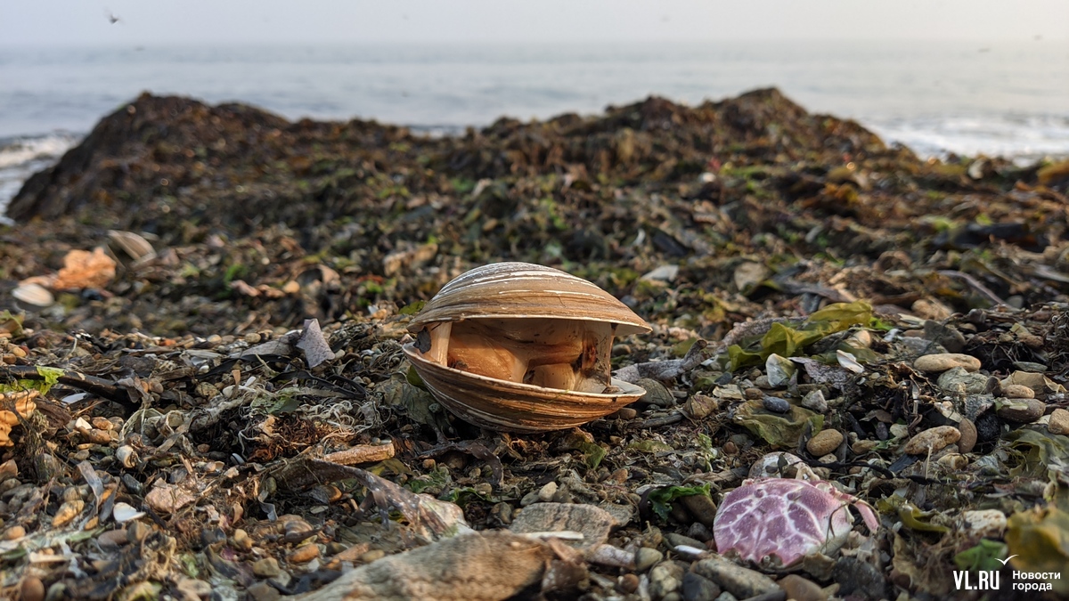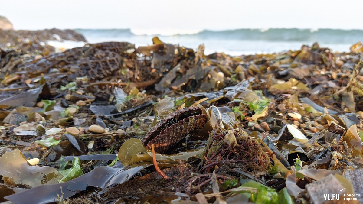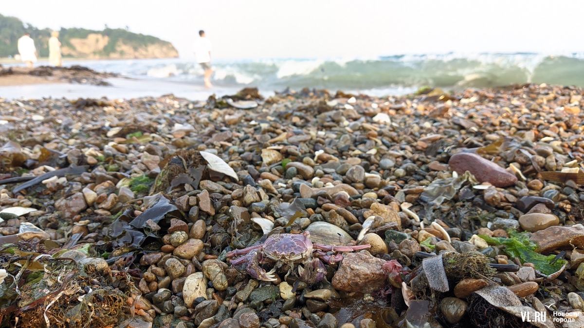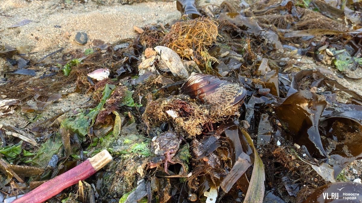 Кучи гребешка, крабов и мидий выбросило на побережье бухты Лазурной. Сегодня, 9 июля, их активно подбирали гости Шаморы, но и к вечеру на пляже ещё можно было найти немало погибших морских обитателей вперемешку с выброшенной на берег травой. Учёные предполагают разные причины массовой гибели гидробионтов, среди них – и цветение микроводоросли, загрязнившей акваторию Амурского залива, и просто следствие сильного прибоя. Пробы воды, по словам исследователей, брать бессмысленно – в ней уже никого не найдёшь, а вот осмотреть животных учёные собираются, и в этом им поможет корреспондент Новостей VL.ru.