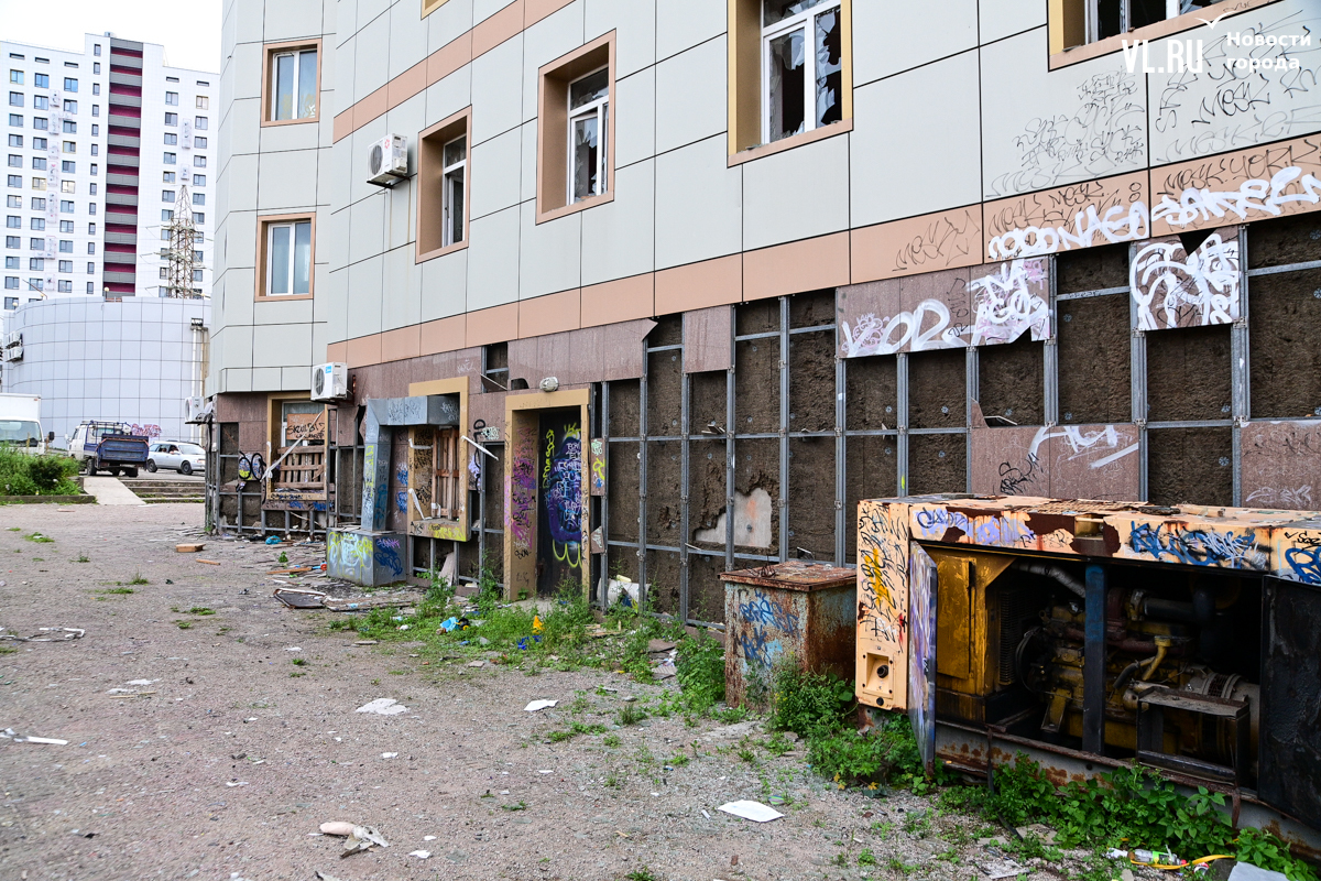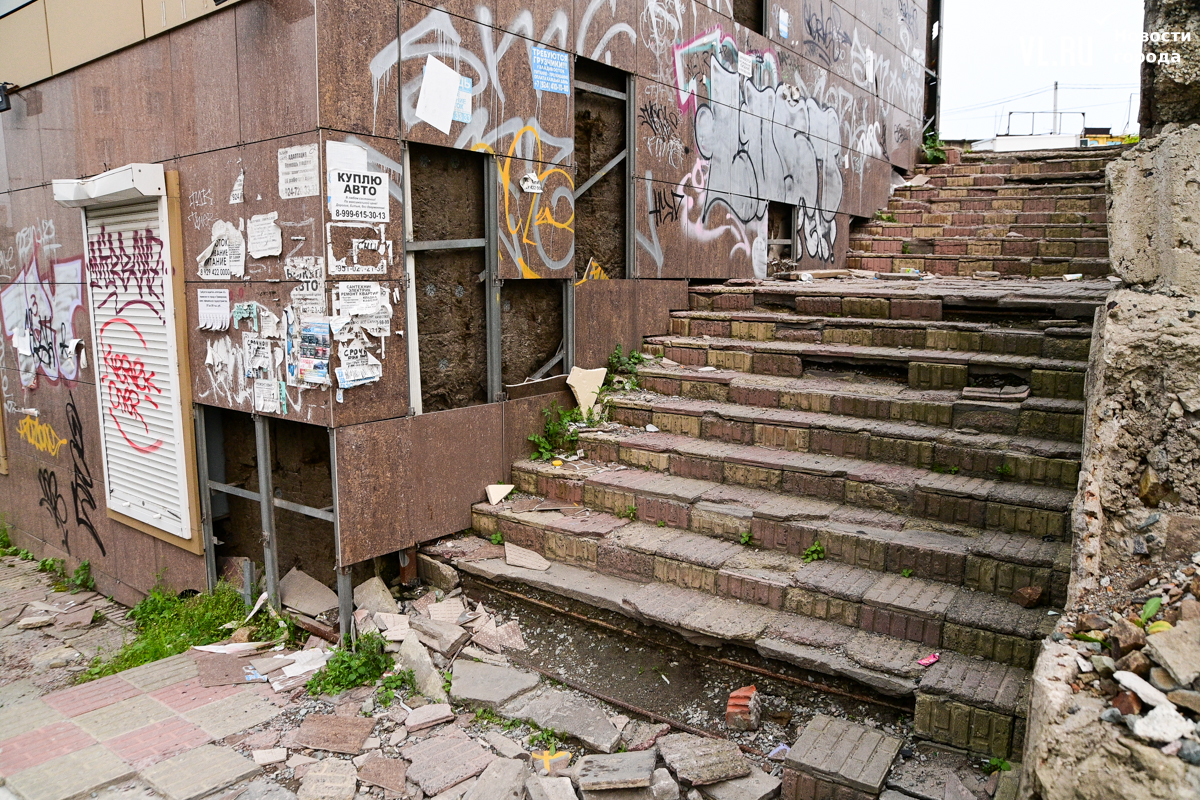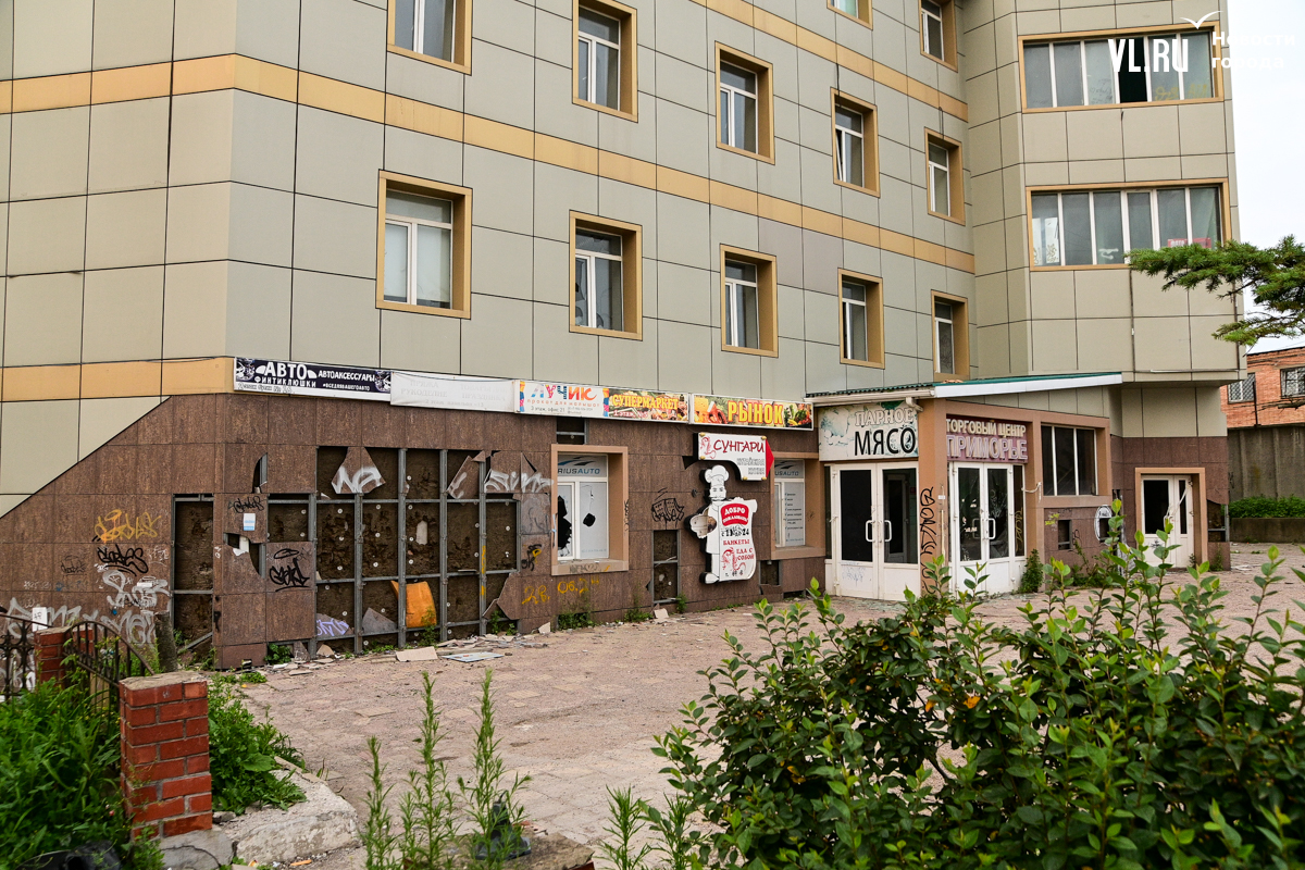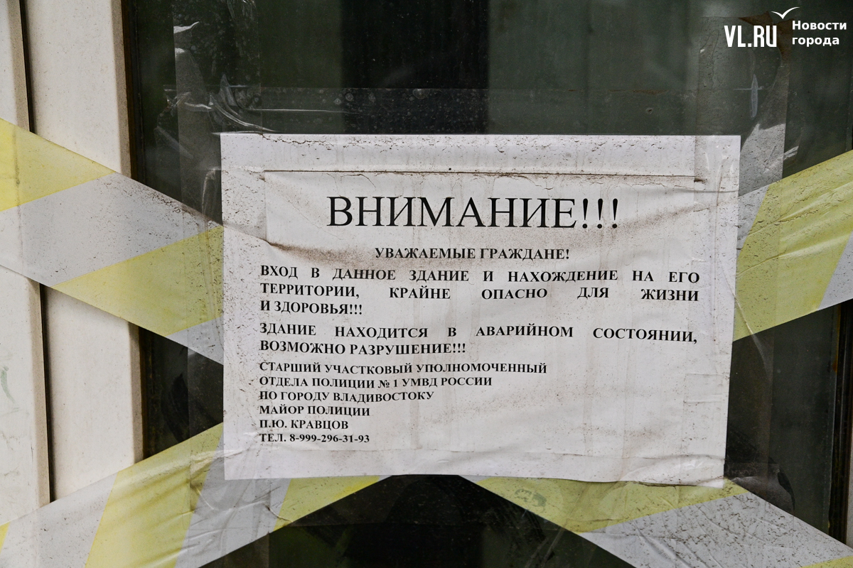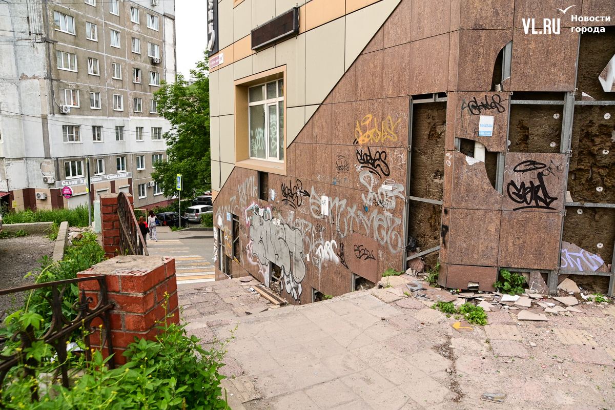 Закрытый 9 лет назад ТЦ «Приморье» во Владивостоке продолжает разрушаться – в нескольких местах упала облицовочная плитка, а стены и двери разрисованы многочисленными тегами граффитчиков. Доступ на объект свободный, поэтому место облюбовали вандалы и бездомные. Сотрудники полиции считают, что бывший ТЦ до сноса следует хотя бы капитально огородить забором, а в пресс-службе мэрии уточнили, что его скоро снесут – заниматься этим будет новый арендатор земли.