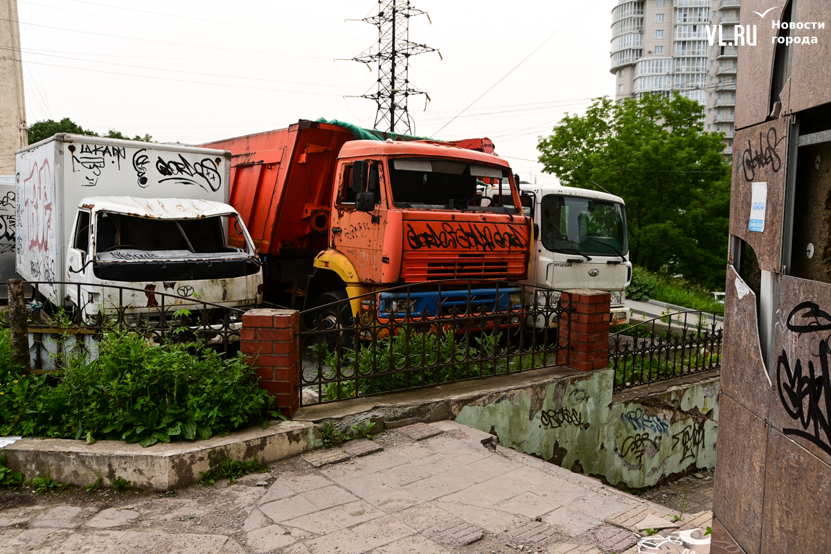 Довершает картину разрухи бывшая парковка ТЦ – на ней припаркованы автобус и два грузовика. У последних (Toyota и «КамАЗ») передняя часть кузовов расписаны тегами – видимо, припаркованы машины давно и, может быть, они даже не на ходу.