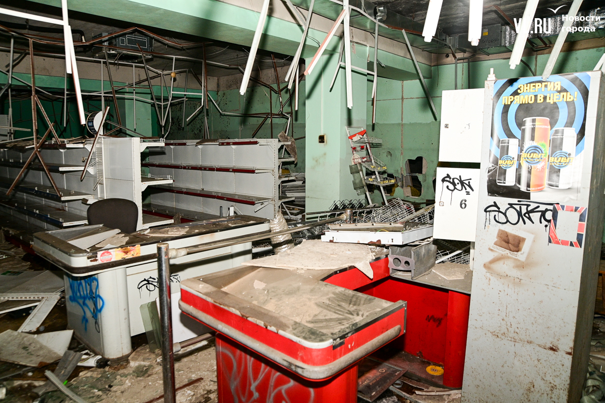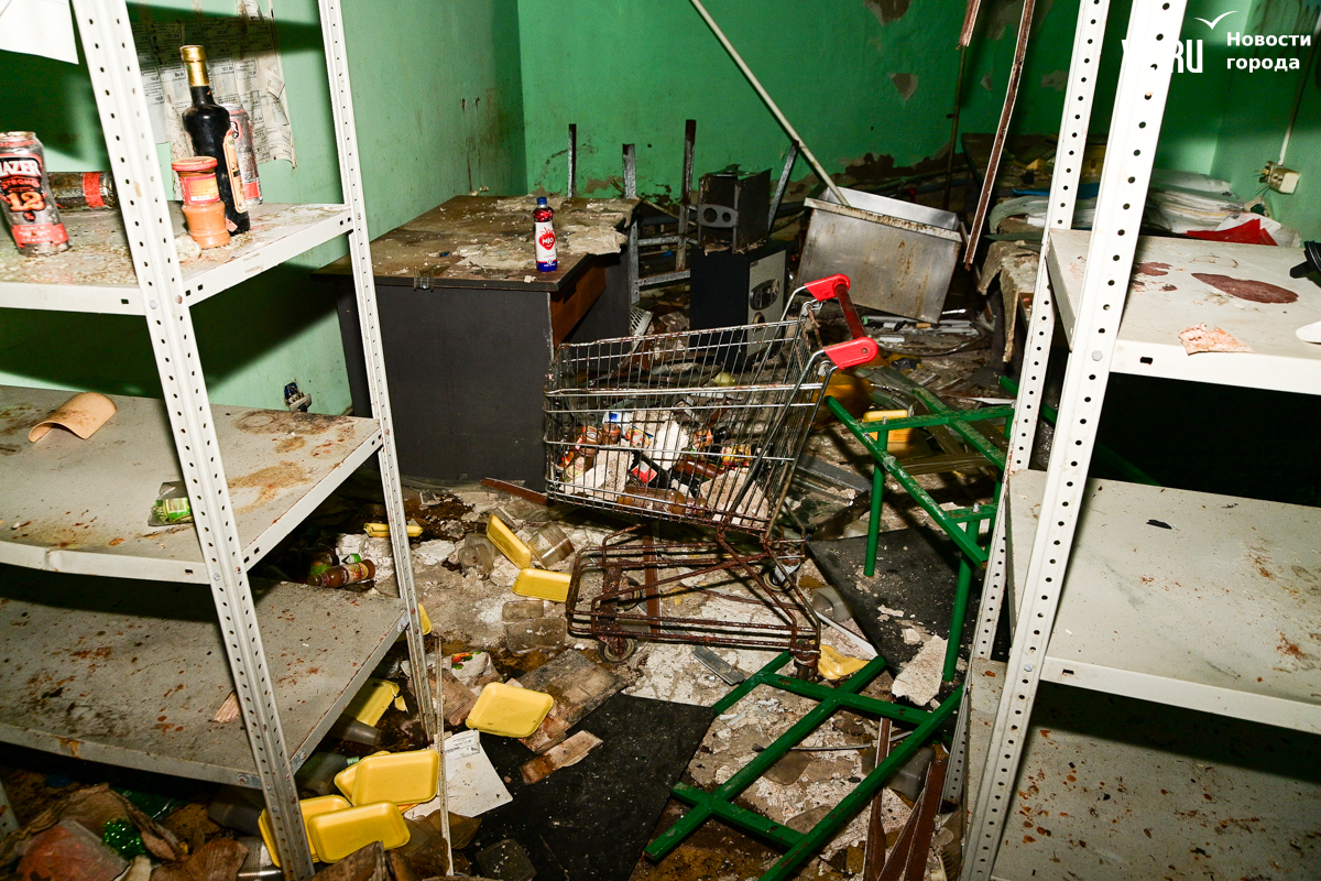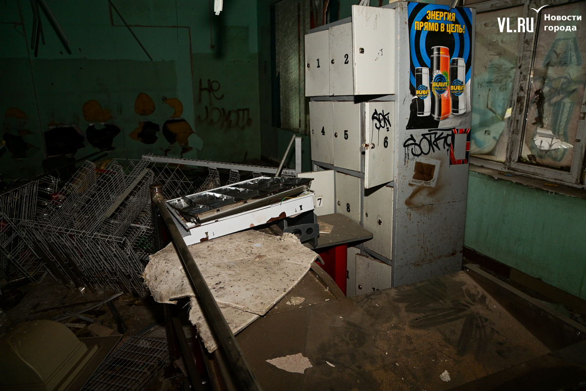 В здание довольно легко попасть – окна у входных дверей выбиты. На первом этаже в помещениях бывшего супермаркета – кучи мусора и всё те же теги вандалов. Здесь же остались старые витрины под продукты, касса, старые торговые автоматы с рекламой энергетика. С потолка свисают бывшие вентиляционные крепления.