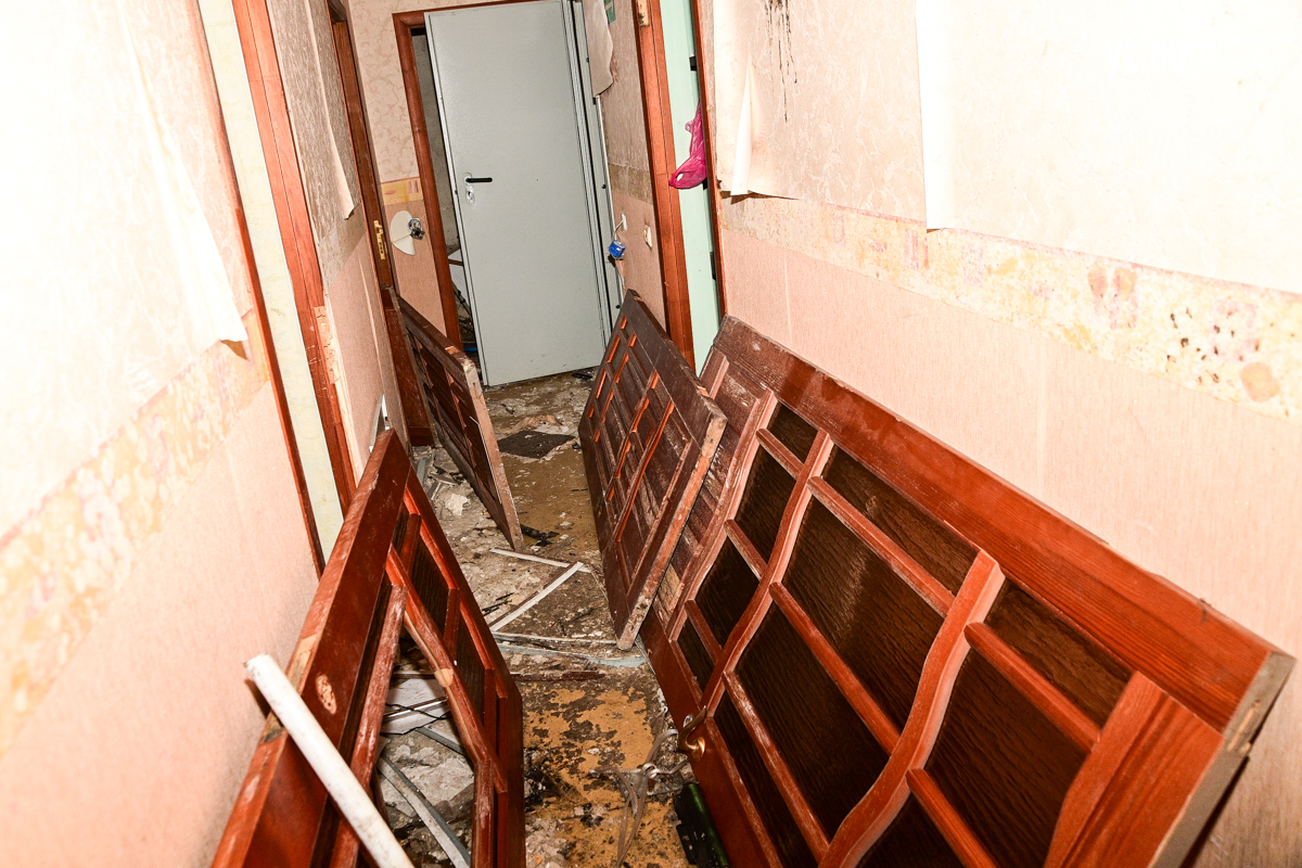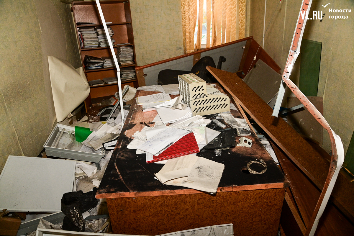 Если подойти к зданию с другого входа, можно попасть в бывшие офисные помещения на втором этаже. Пройти сюда тоже несложно – стёкла в дверях выбиты. В коридорах тут лежат ранее выломанные двери, в бывшем офисе остались стеллажи с документами. Но всё вместе это выглядит скорее как место жительства бездомных – вокруг куча грязи и мусора.