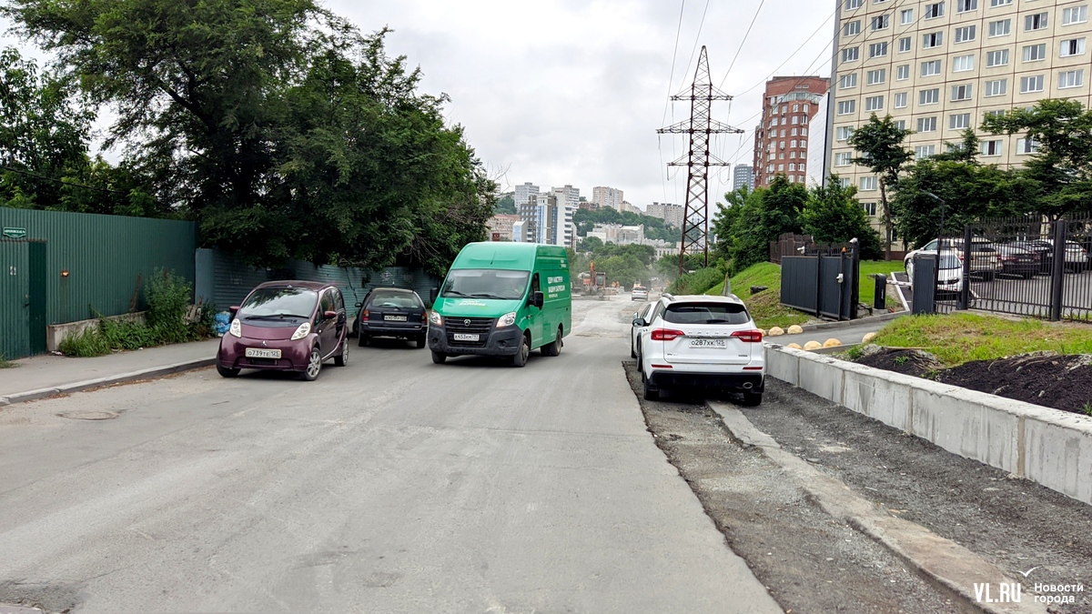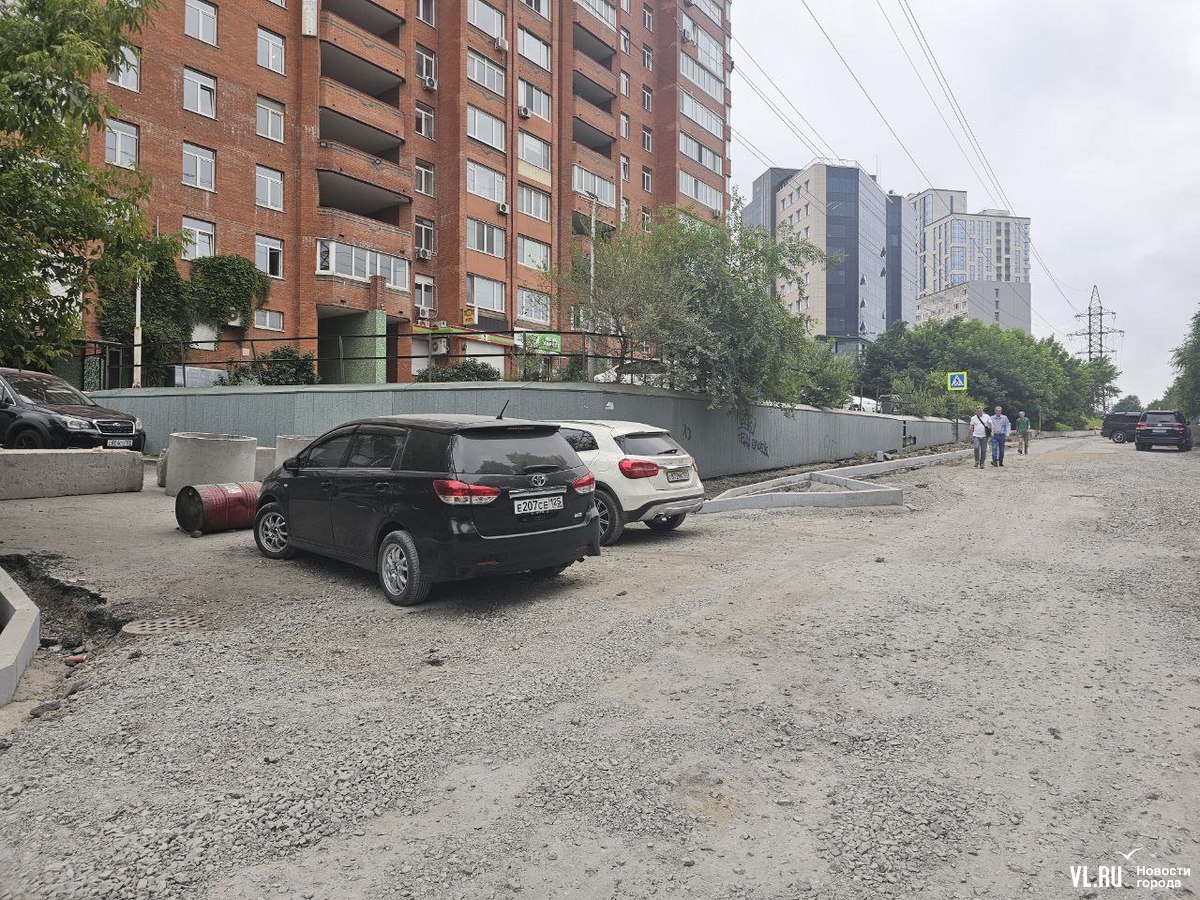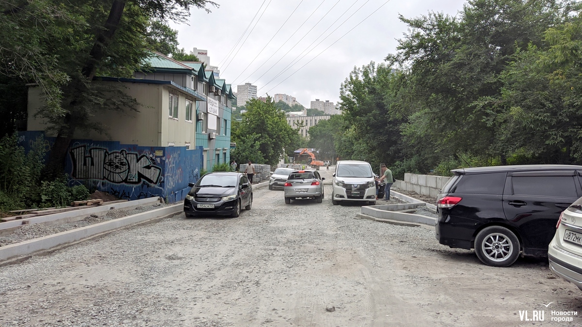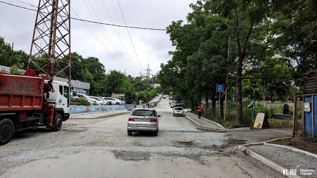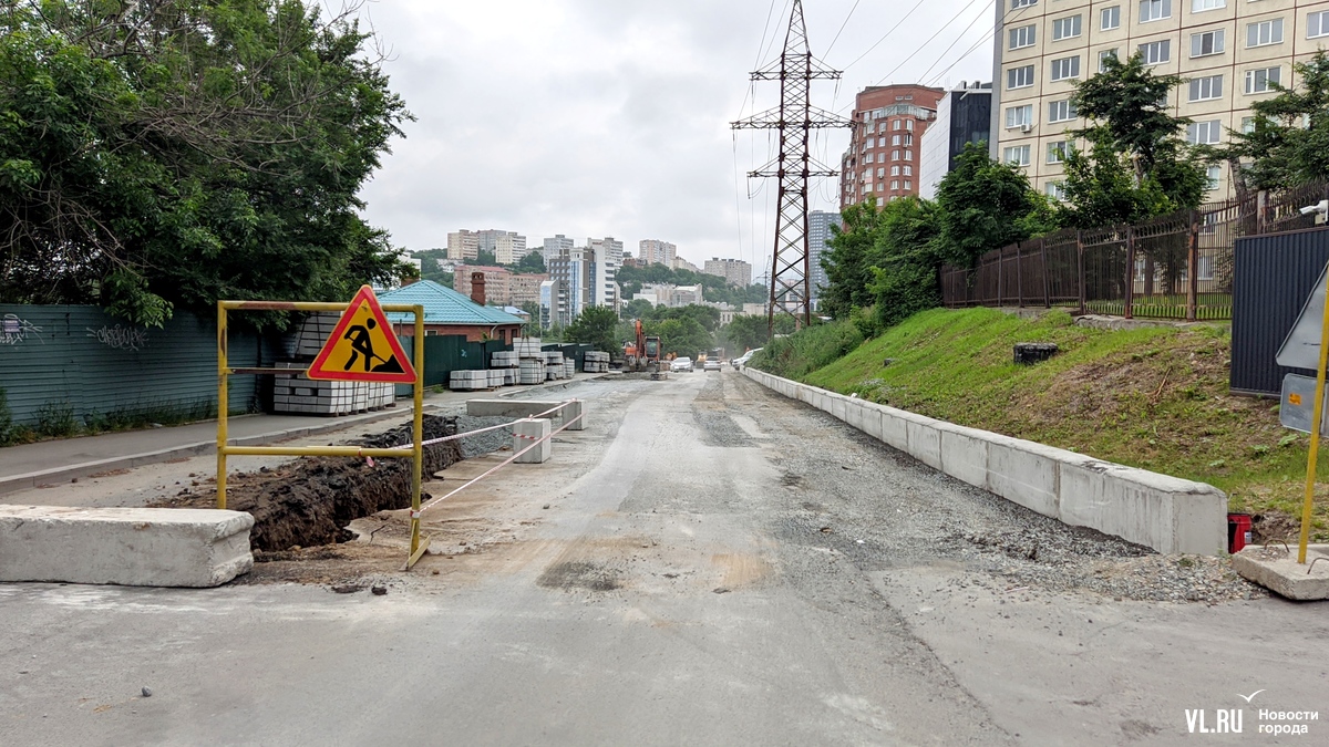 Обновлено: Жители Авроровской отмечают, что открыт только сквозной проезд, но повороты к домам 17 и 24 всё ещё перекрыты бетонными блоками. Единственной альтернативой попасть к домам – этот путь часто любят использовать для объезда пробки – остаётся поворот с Океанского проспекта на Школьный переулок, который запаркован желающими не платить за платную парковку. А также можно проехать по убитой дороге мимо Алеутской, 56, где не каждая машина одолеет земляной ров.