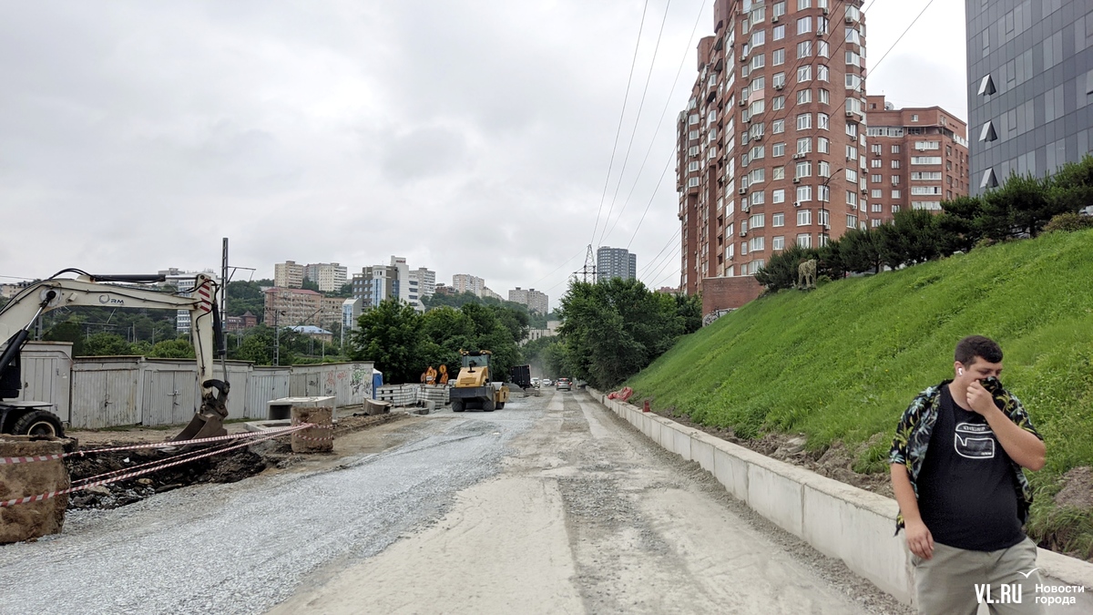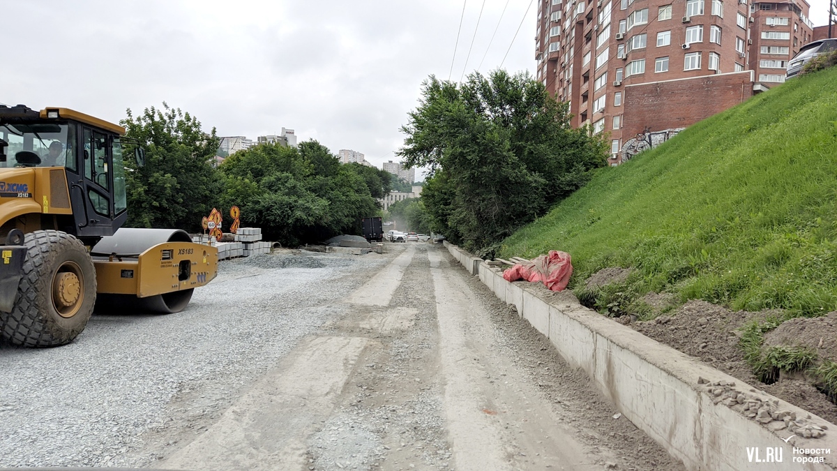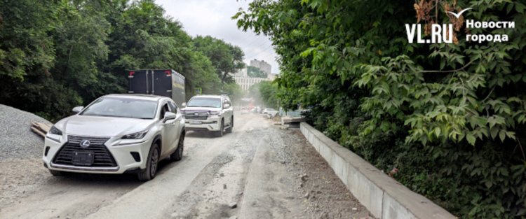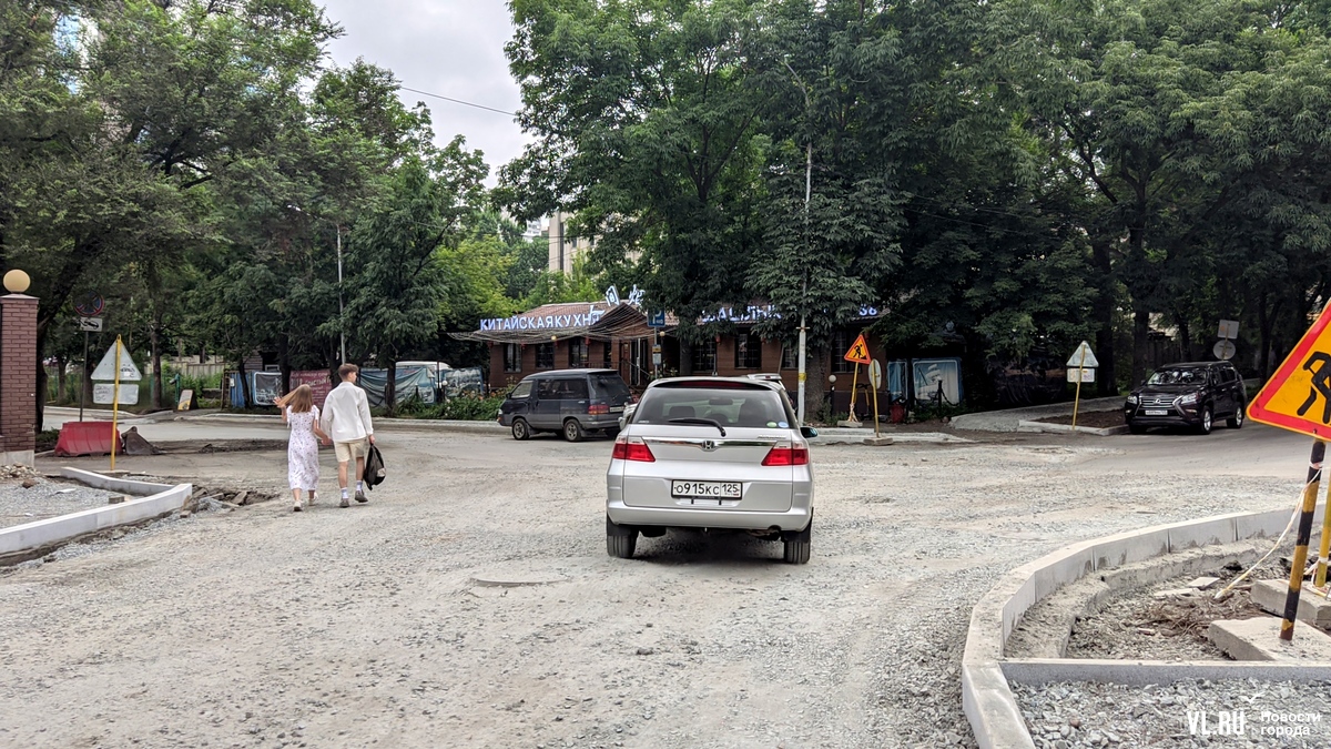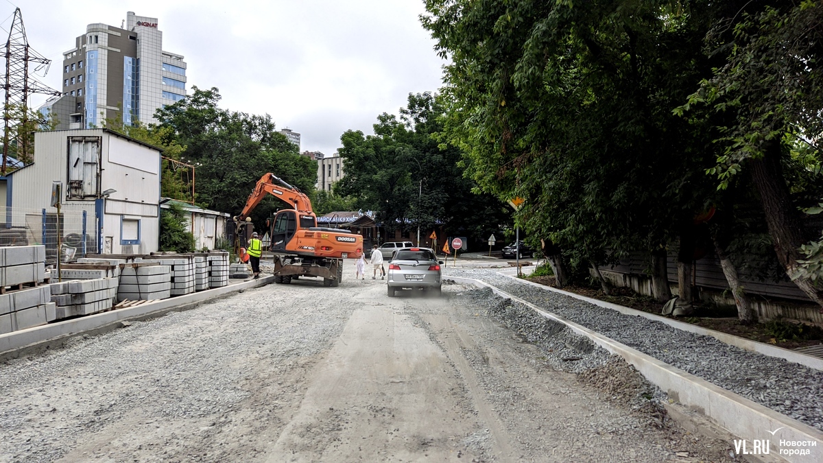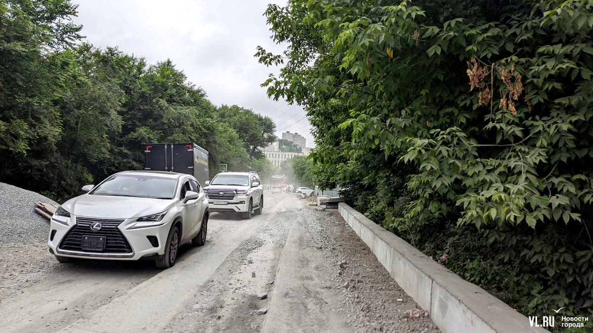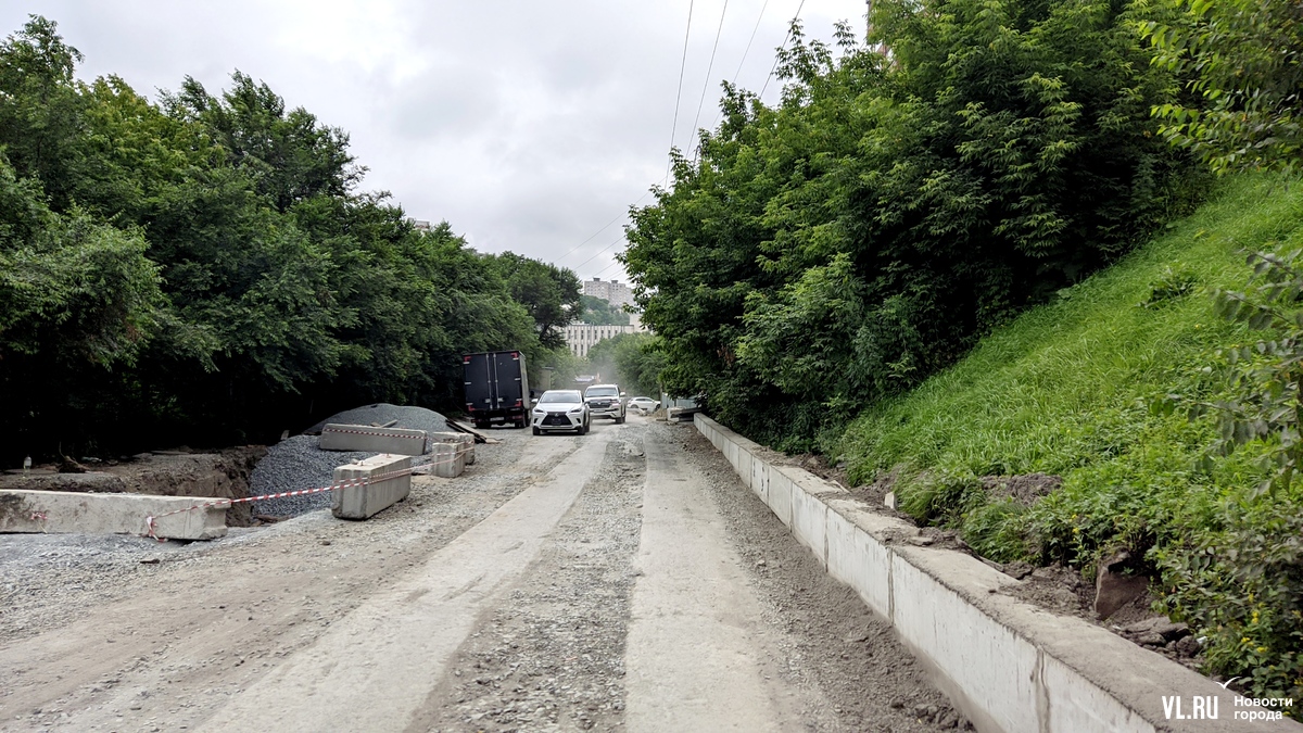 Обновлено: Жители Авроровской отмечают, что открыт только сквозной проезд, но повороты к домам 17 и 24 всё ещё перекрыты бетонными блоками. Единственной альтернативой попасть к домам – этот путь часто любят использовать для объезда пробки – остаётся поворот с Океанского проспекта на Школьный переулок, который запаркован желающими не платить за платную парковку. А также можно проехать по убитой дороге мимо Алеутской, 56, где не каждая машина одолеет земляной ров.