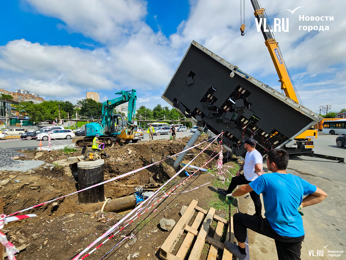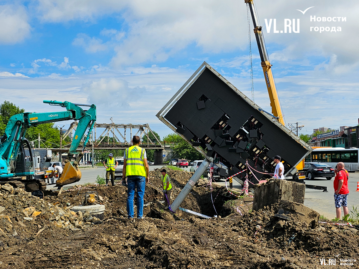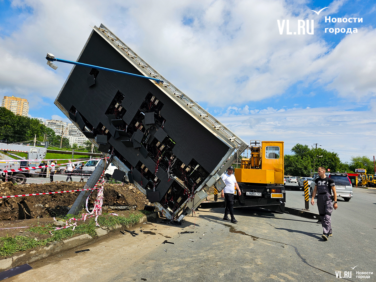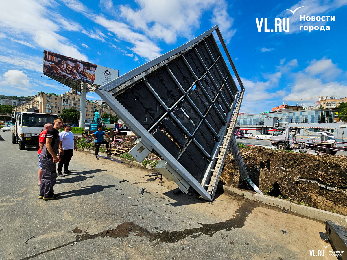 «Мы приехали, видеоэкран лежит. Сразу начали работу», – коротко объяснил специалист компании «Водострой», которая сейчас разбирает накренившуюся конструкцию.