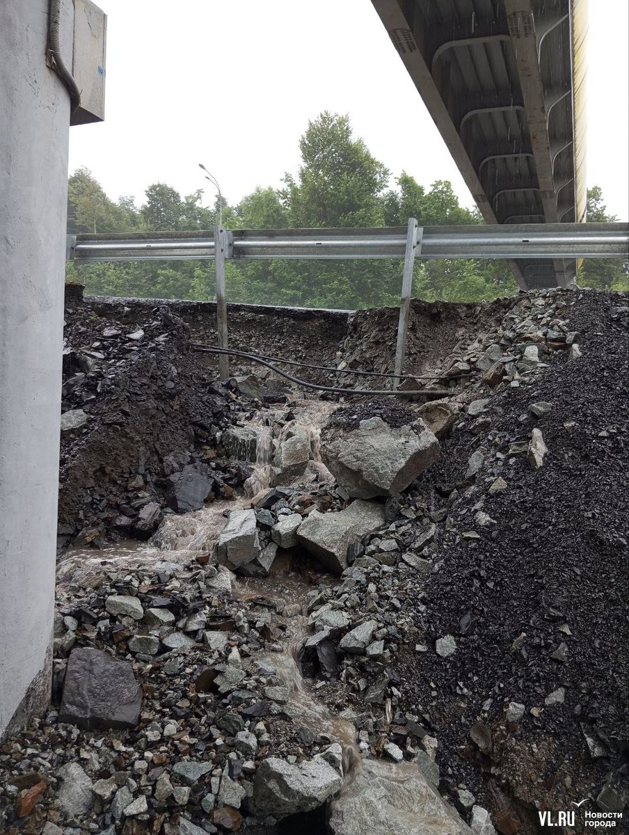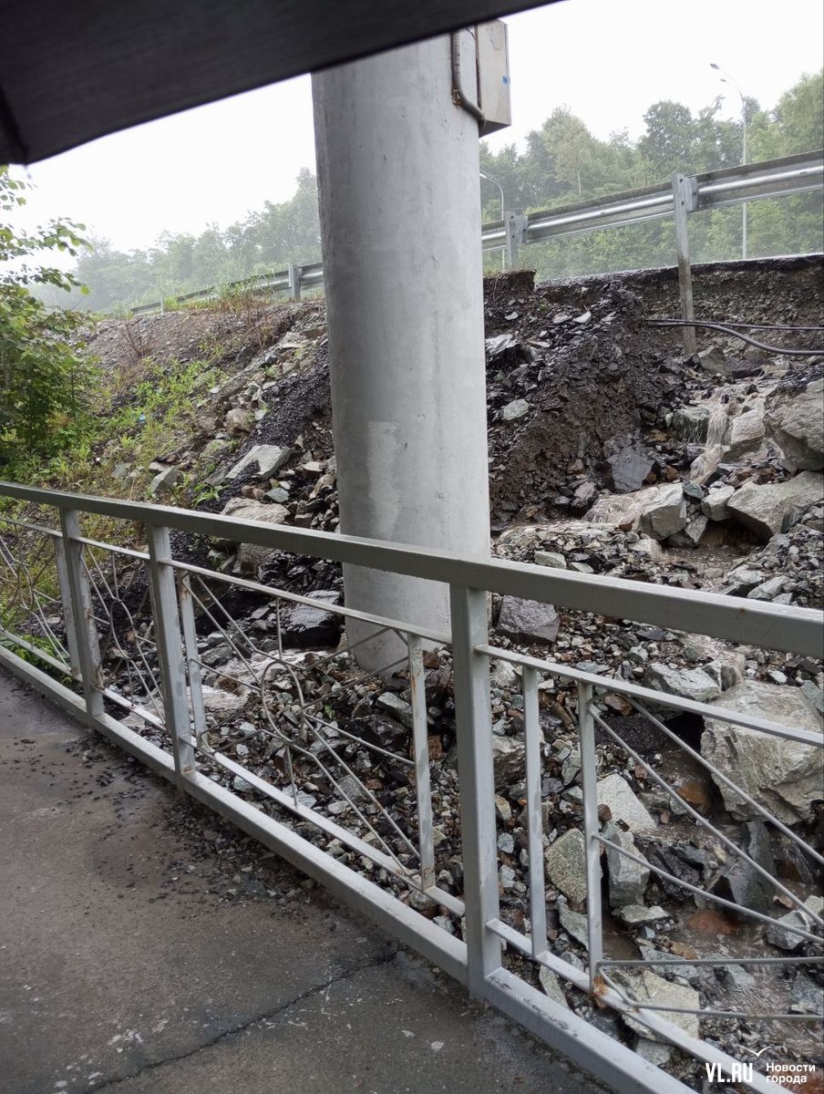 В пригороде тоже всё не гладко. Читатели Новостей VL.ru прислали фотографии, на которых видно, что косогор под виадуком на остановке «Дачная» (район Серебряного ключа) начал сползать вниз, рискуя прихватить с собой отбойники и кусок трассы.
