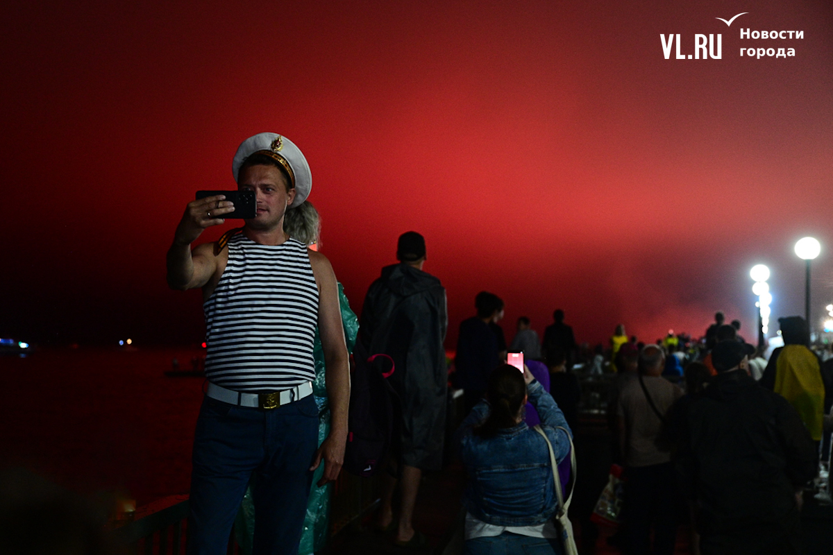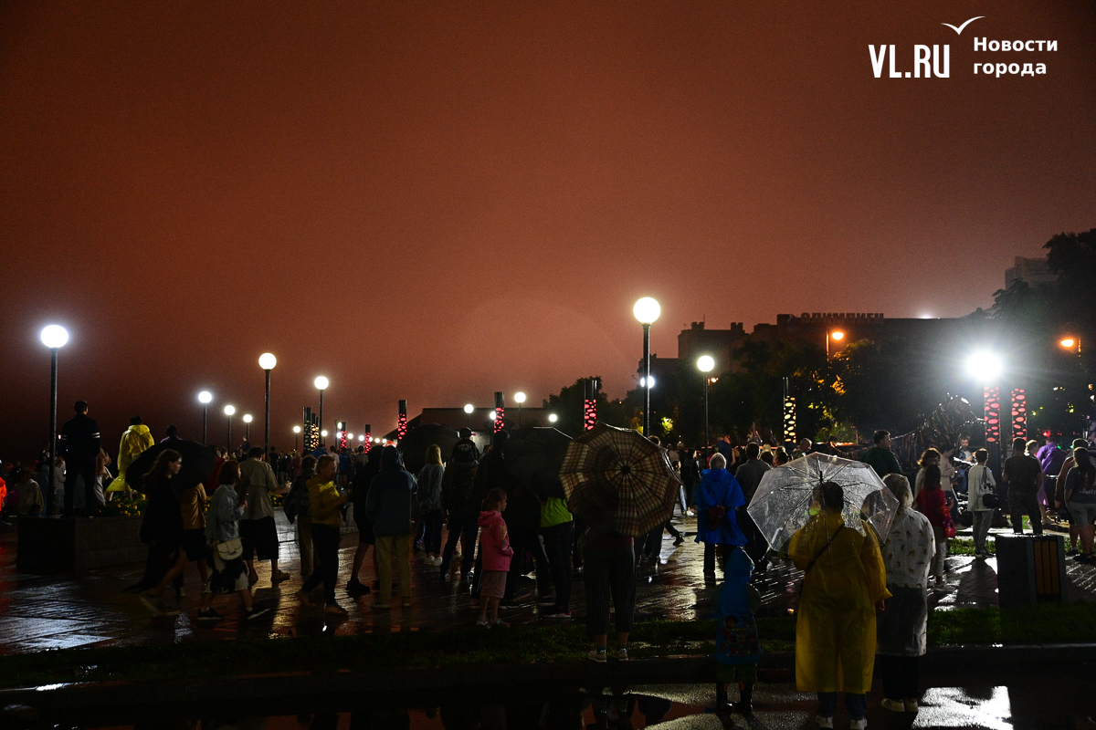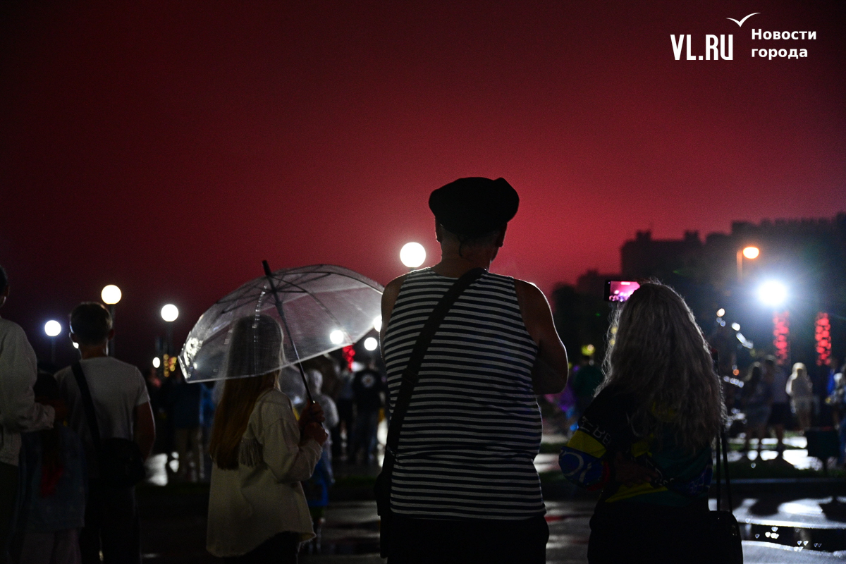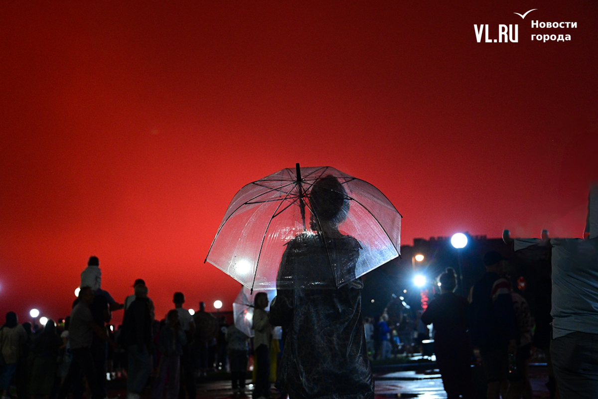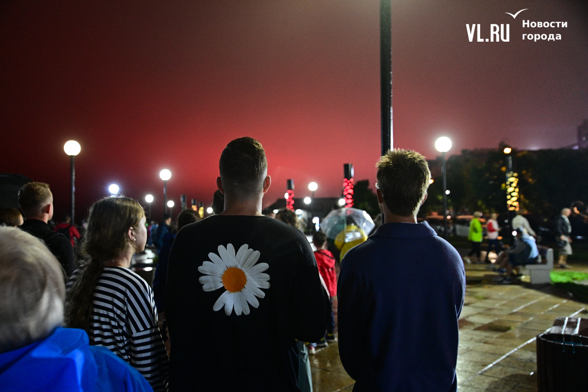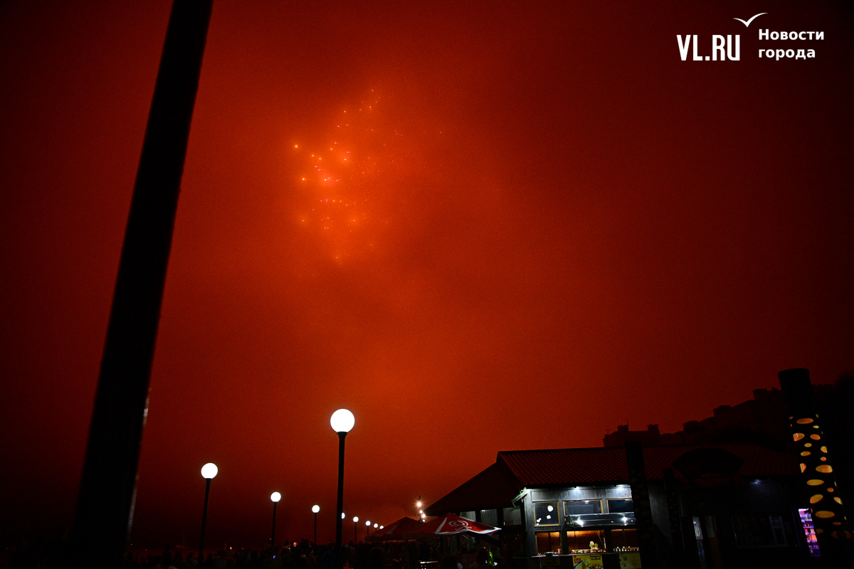 Салют в честь Дня ВМФ во Владивостоке гремел 10 минут. Залпы не было видно за туманом, но в эти моменты всё небо до самого горизонта окрашивалось в один цвет, и красный был самым ярким из них. Где-то вдалеке были видны искры – когда огни салюта спускались ниже мглы, уже почти долетая до земли.