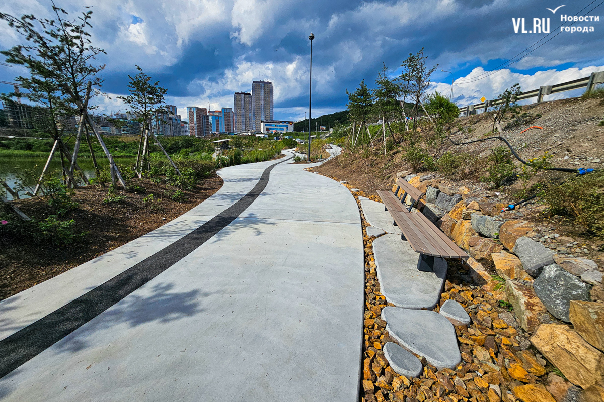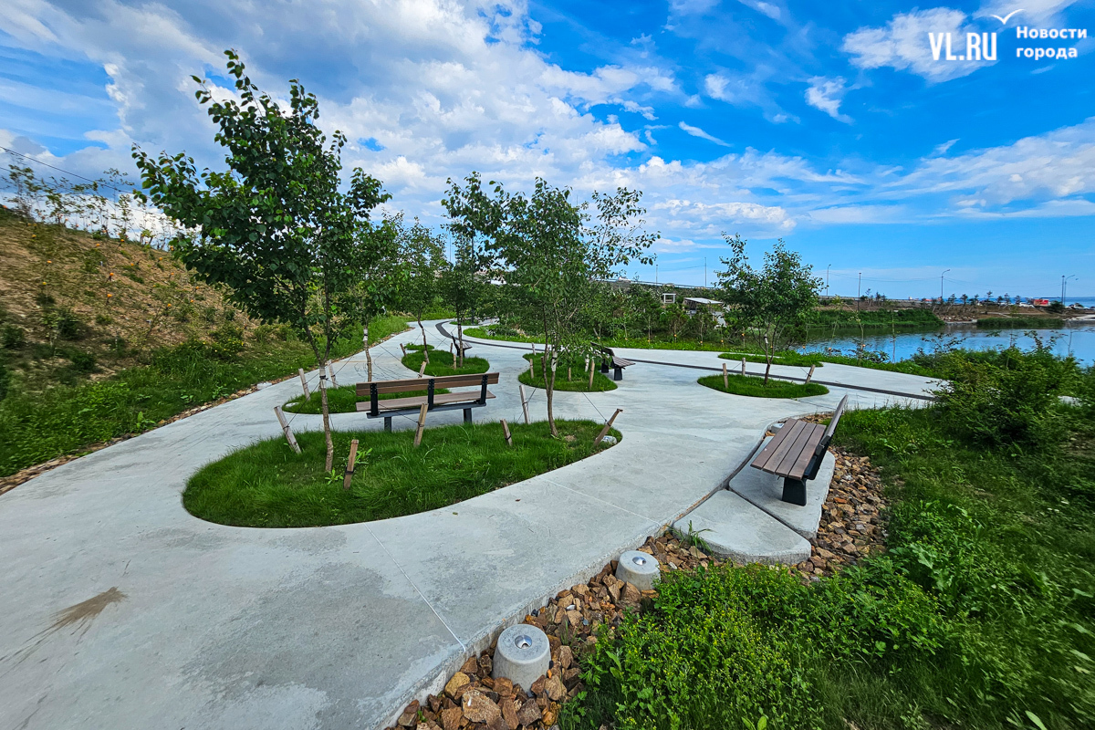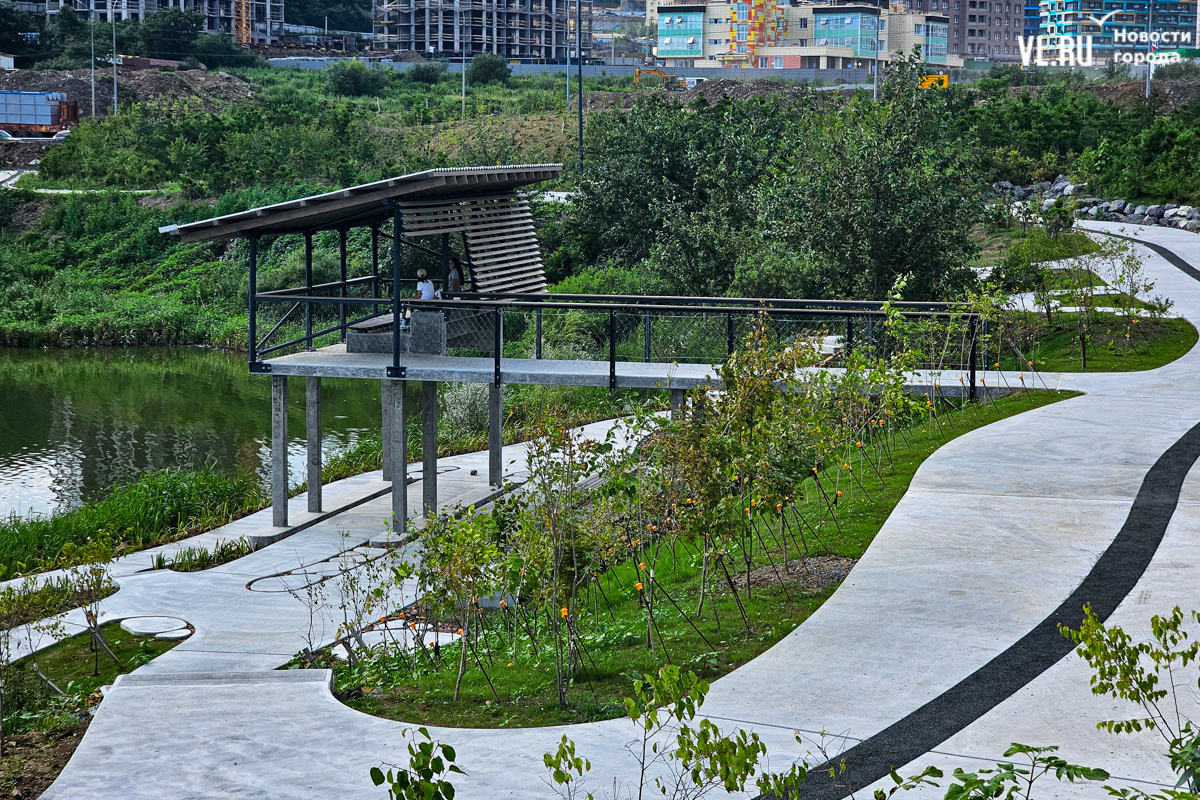 «По задумке, вся композиция вокруг озера – это такой парк у воды. Задача в том, чтобы люди могли погулять, посмотреть на птиц. Это не подразумевает много площадок и шумных активностей. Мы насыпали валы у дороги и высадили деревья – порядка 2000 саженцев только в этой части, – чтобы закрыться от шума и создать такой природный объект (всего было высажено порядка 7 тысяч деревьев. – Прим. ред.). Уют получилось вроде бы создать – посмотрим, как это будет жить, и в том же духе будем развивать», – рассказал корреспонденту Новостей VL.ru Алексеев.