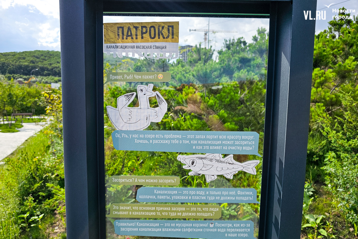 На схемах для гостей уже благоустроенную территорию разбивают на несколько условных участков: рыбацкий пирс, видовой пункт для наблюдения за озером и «зону неприятного запаха». В день визита корреспондента рядом с последней действительно струились грязные потоки – похоже, в этот раз всё-таки дождевые стоки. На новых информационных стендах (в целом их здесь много) горожан предупреждают, что выбрасывать в унитаз влажные салфетки, ватные палочки и памперсы нельзя – периодически засоряется местная КНС. Напомним, решить проблему намеревались установкой грабельных решёток.