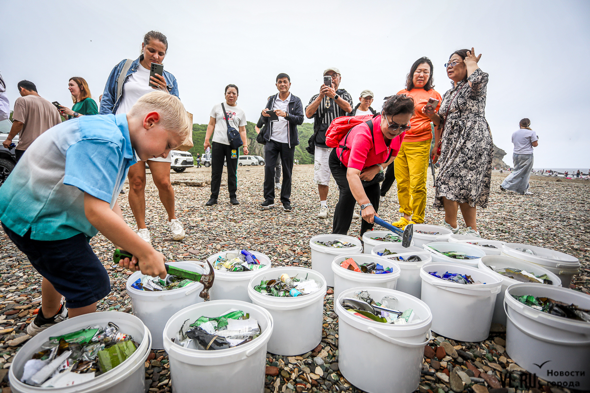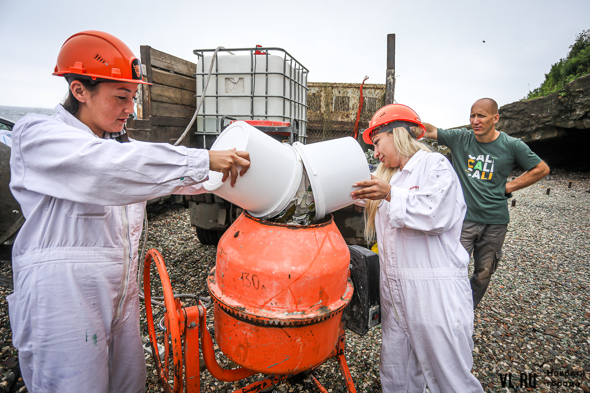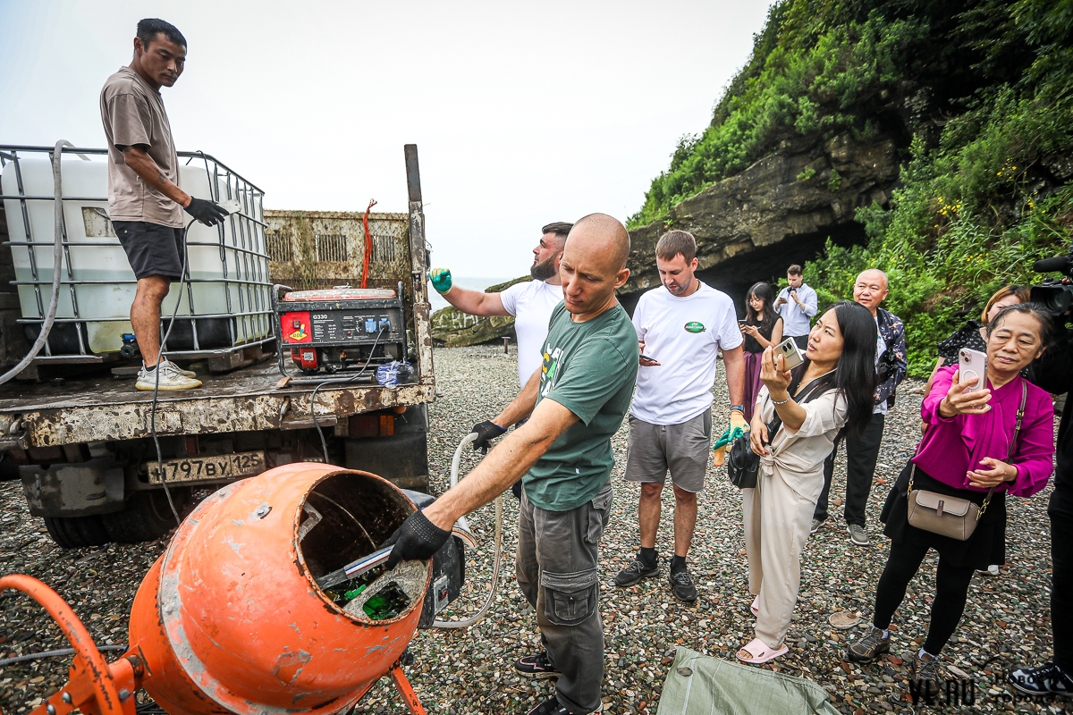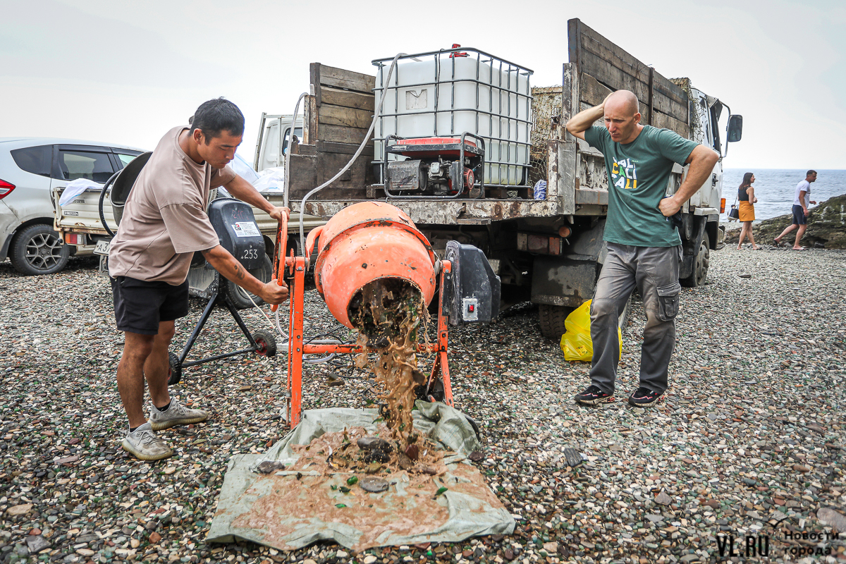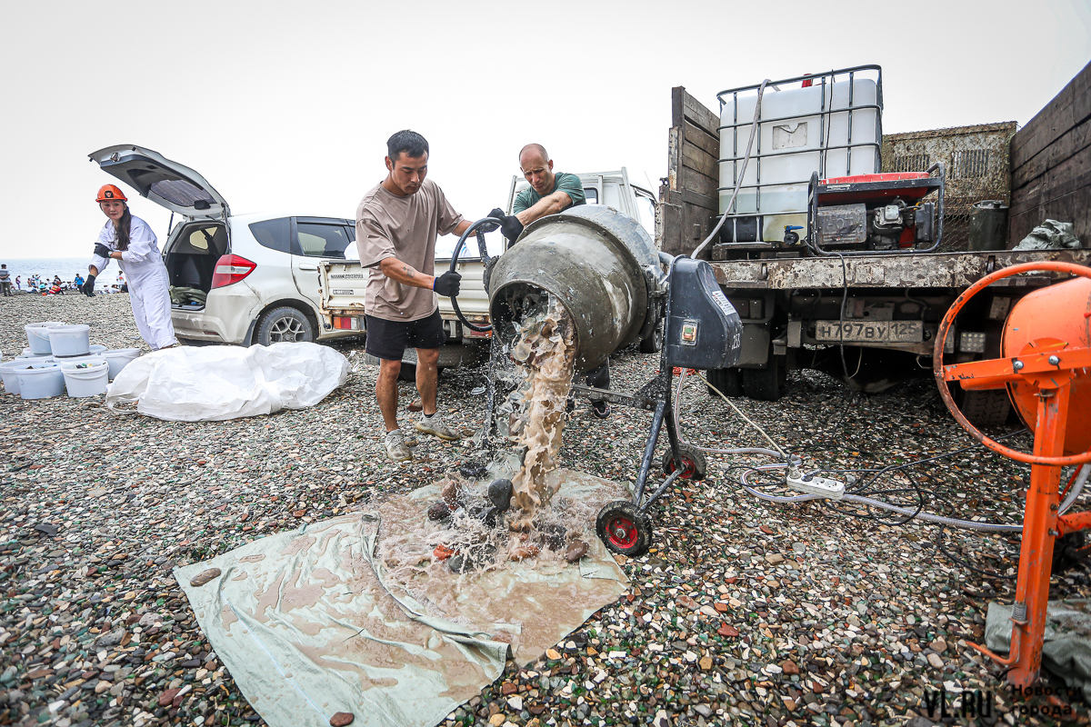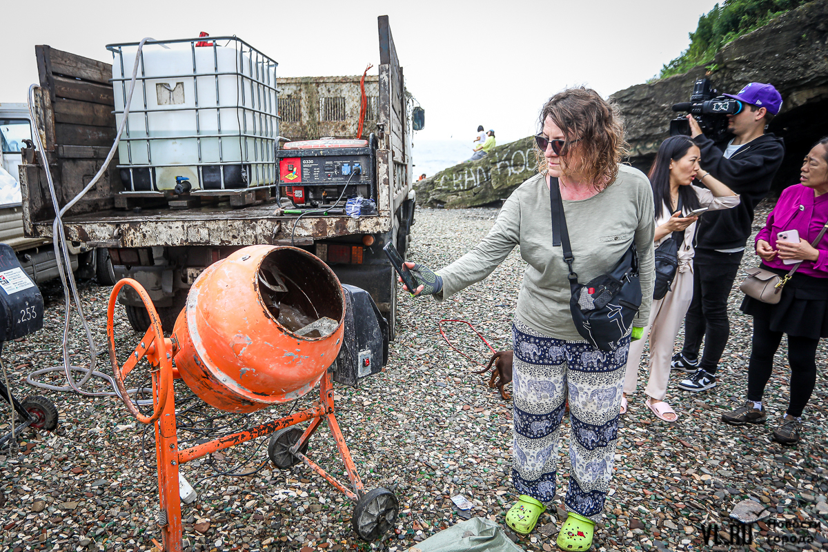 Подготовка к обработке вызвала нешуточный интерес у китайских туристов. Сперва они просто подходили поинтересоваться, заглядывали в бетономешалки, рассматривали вёдра и мешки со стеклом. А затем решили принять в спасении бухты Стеклянной самое деятельное участие. Взяли молотки и стали колотить по стёклам, снимая друг друга на телефоны. Подходили по одному, по двое, целыми группами, хохотали и вообще от души веселились. Затем подтянулись и русские отдыхающие, но уже не для веселья, а чтобы внимательно следить за процессом. Кто-то говорил «дурью маются», кто-то, напротив, хвалил.